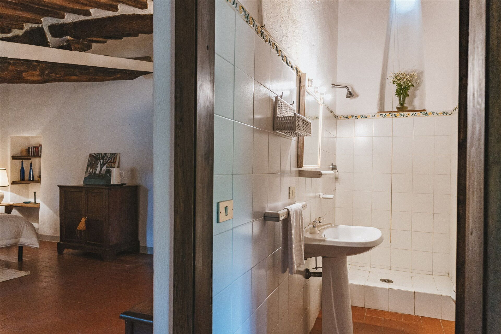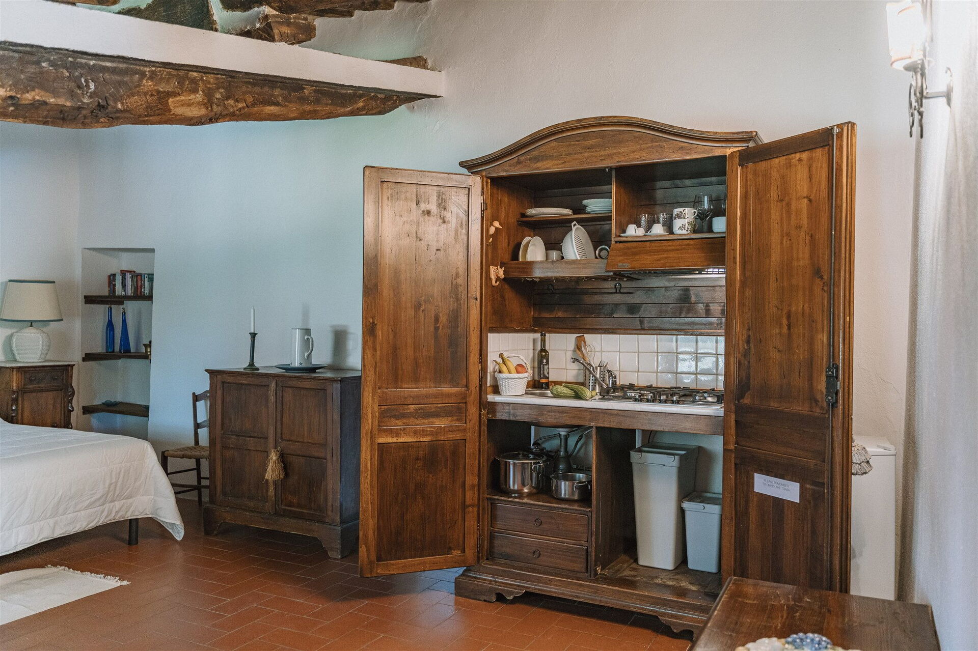 First floor: studio apartment (screen) with double bed, dining area with concealed kitchenette (2 electric burners, refrigerator, moka coffee maker), bathroom with shower.