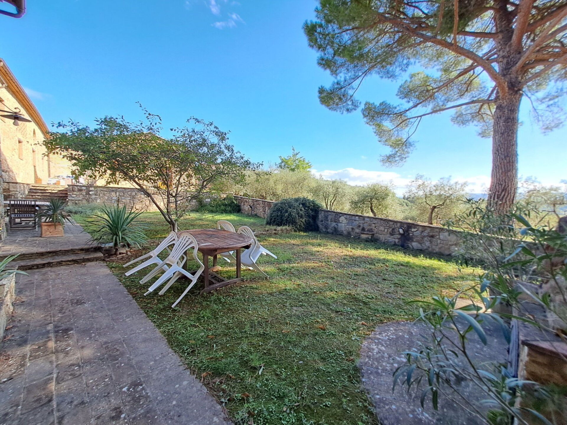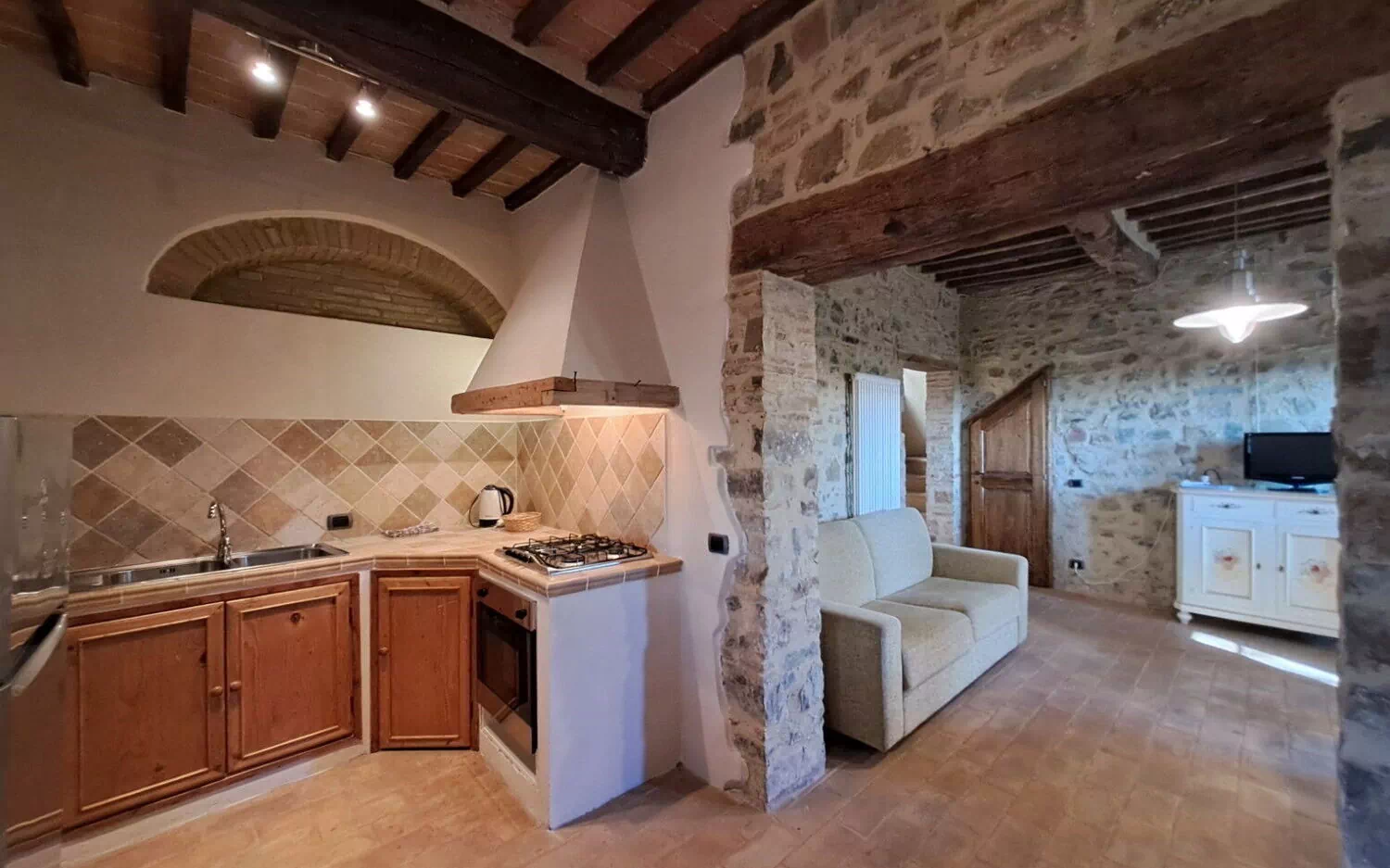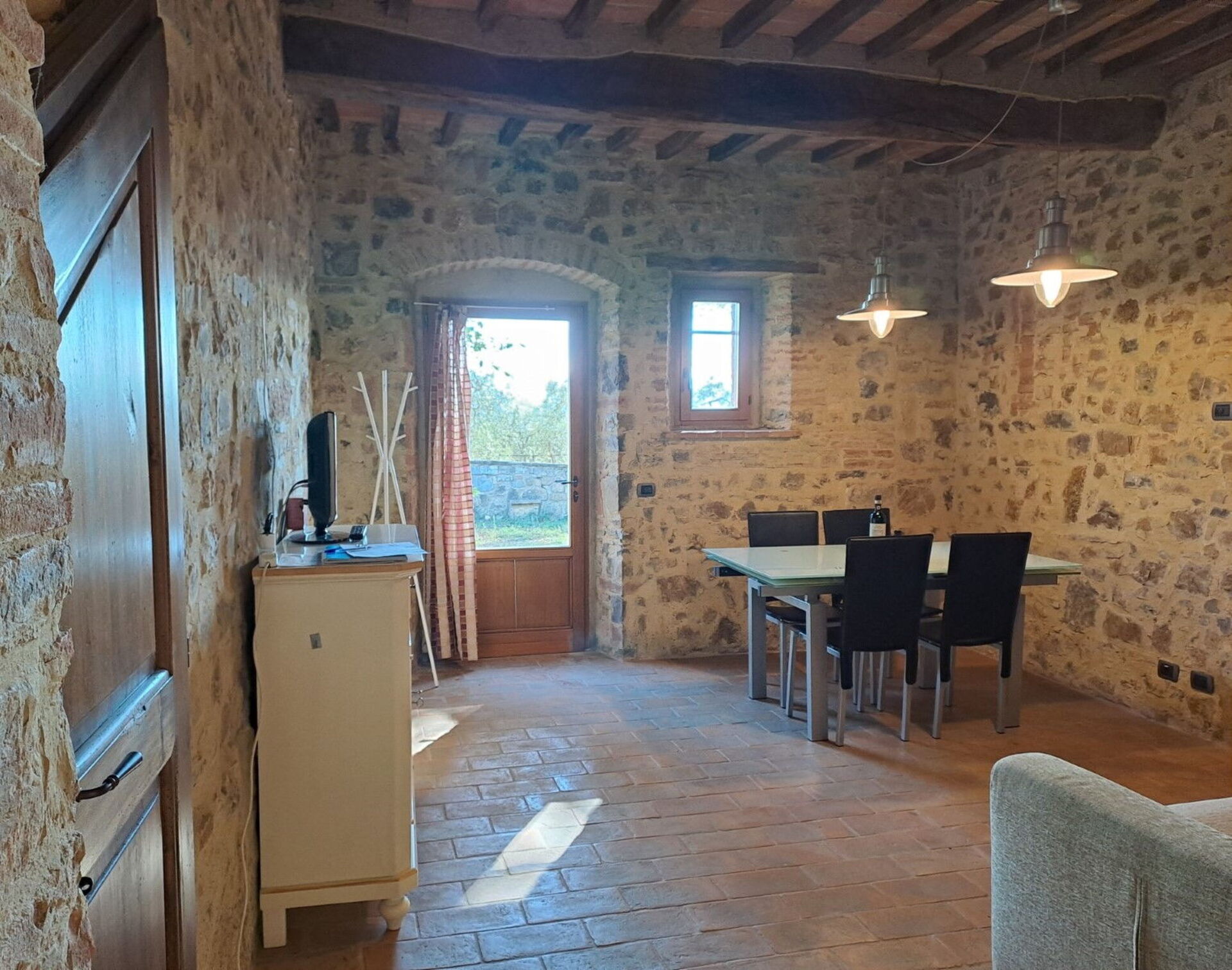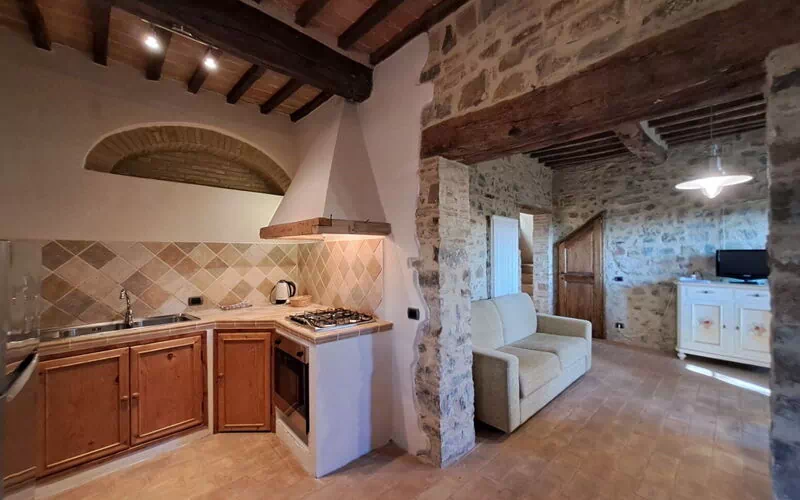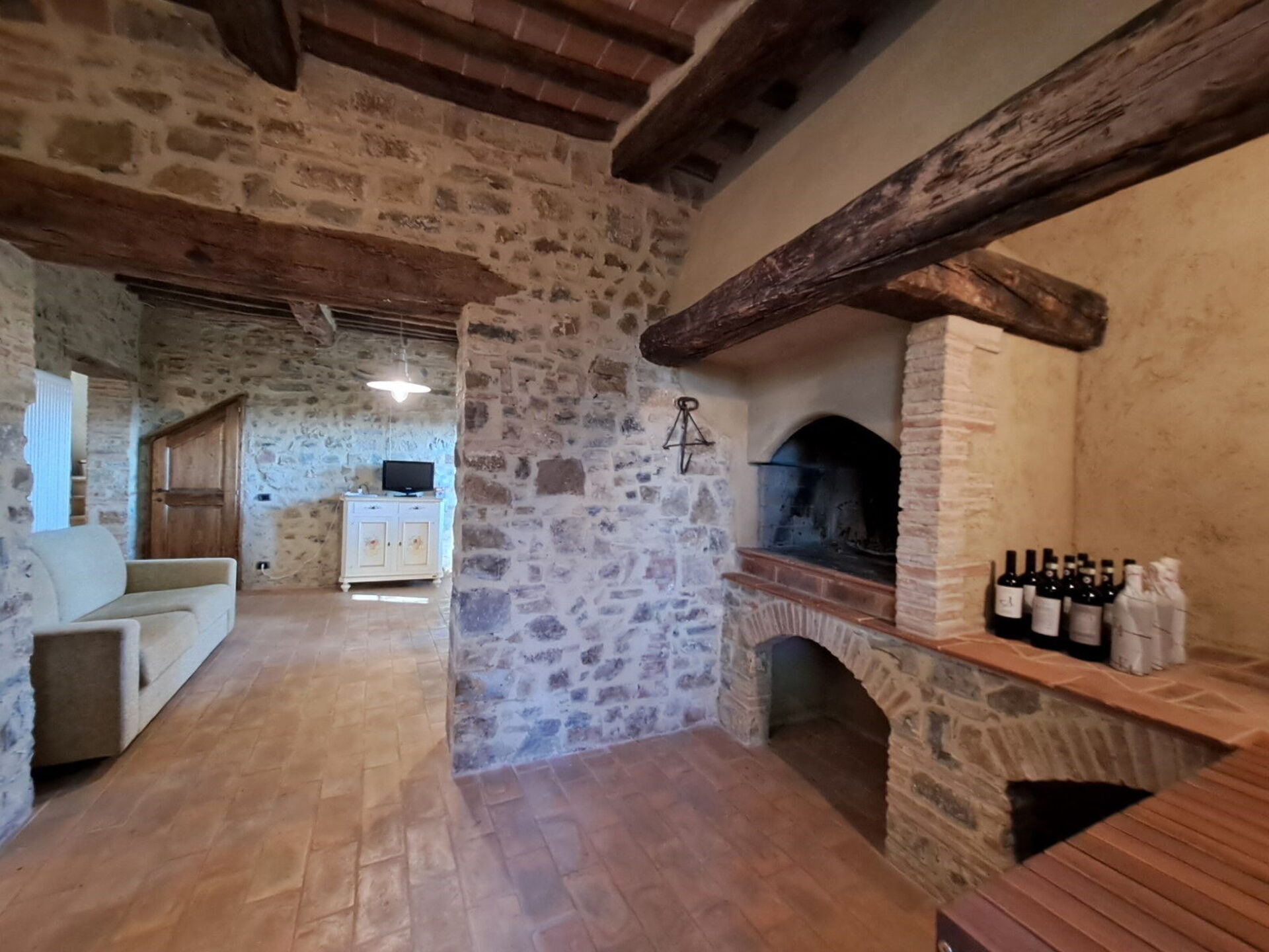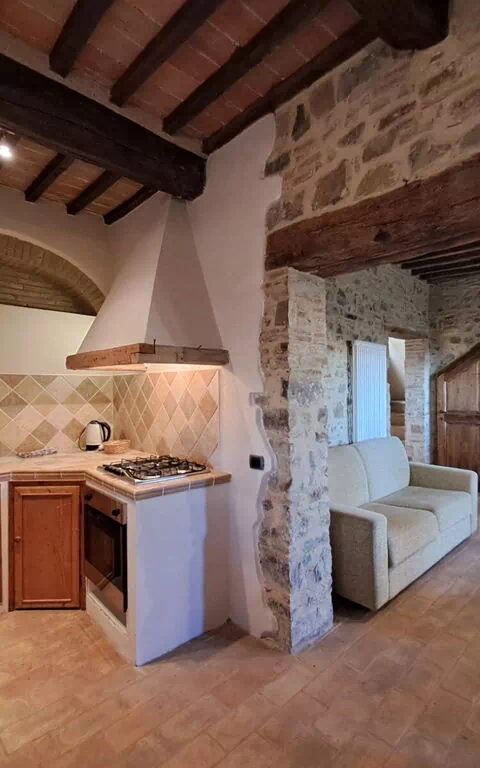 Ground floor: entrance, wc with washing machine, living room with dining area, double sofa bed and access to private furnished outdoor space, utility closet, stone kitchen with fireplace (dishwasher, oven, moka coffee maker, electric kettle, cooktop, refrigerator, freezer, toaster).