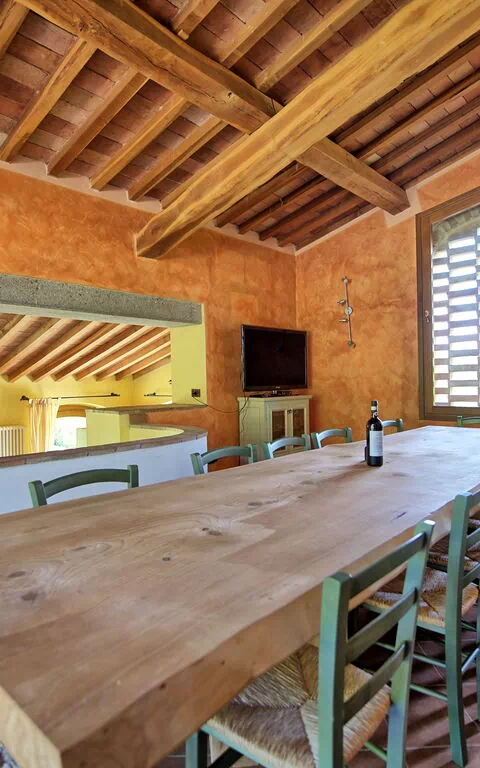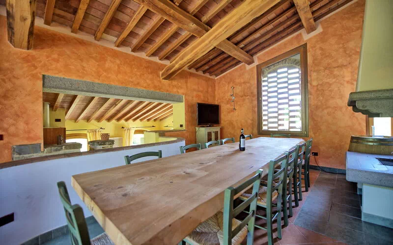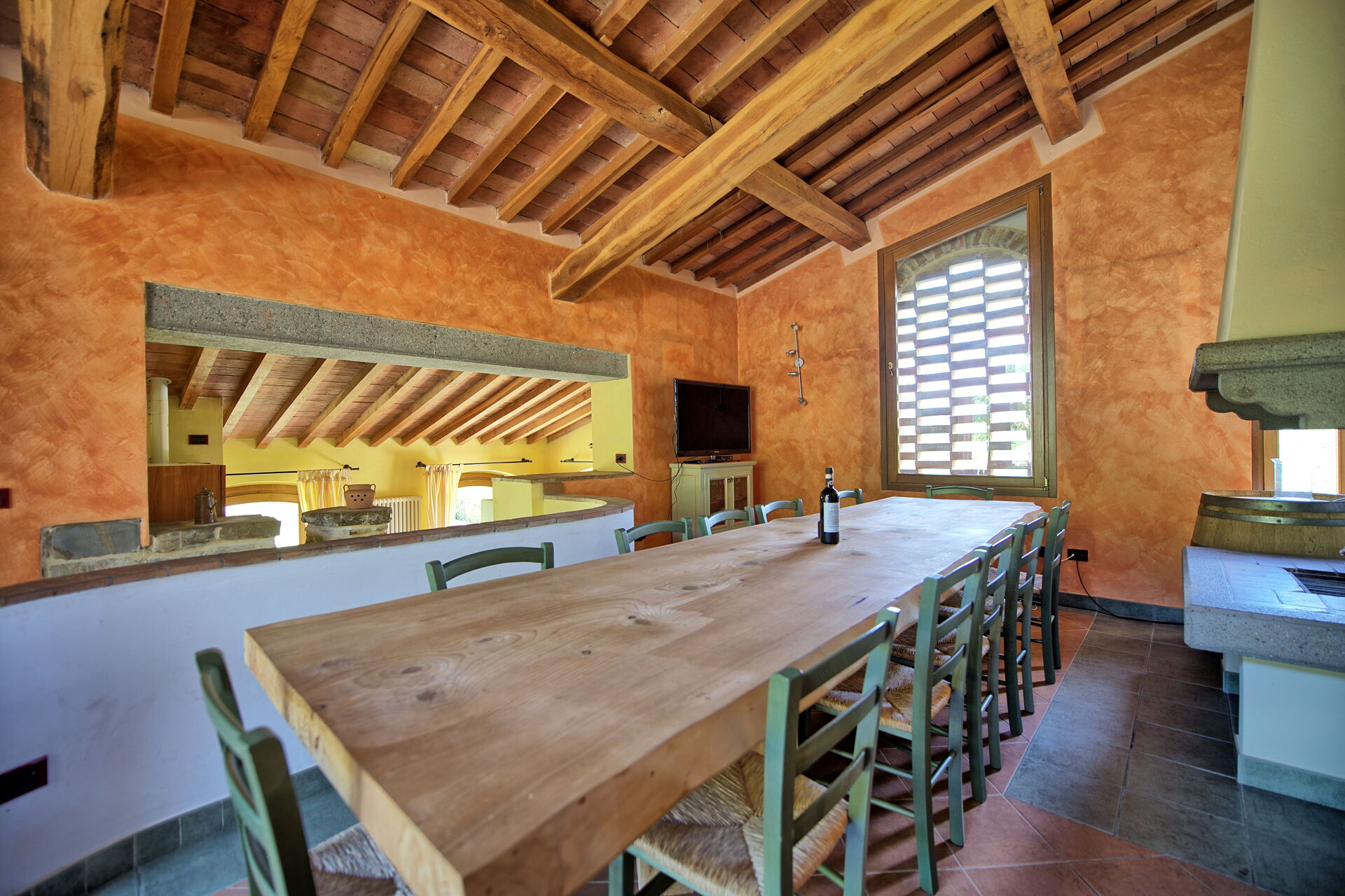 5 steps down: dining area (12 person table) with fireplace, satellite TV, and access to a furnished terrace, double bedroom (air conditioning).
