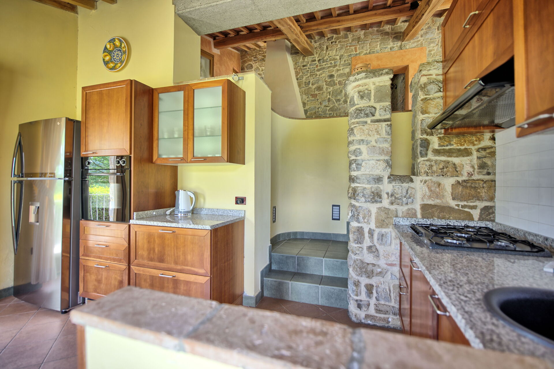 Lower ground floor (7 steps down) (also accessible via independent entrance): kitchen (dishwasher, moka coffee maker, electric kettle, refrigerator, freezer, oven, cooktop, toaster) , bathroom with bathtub.
