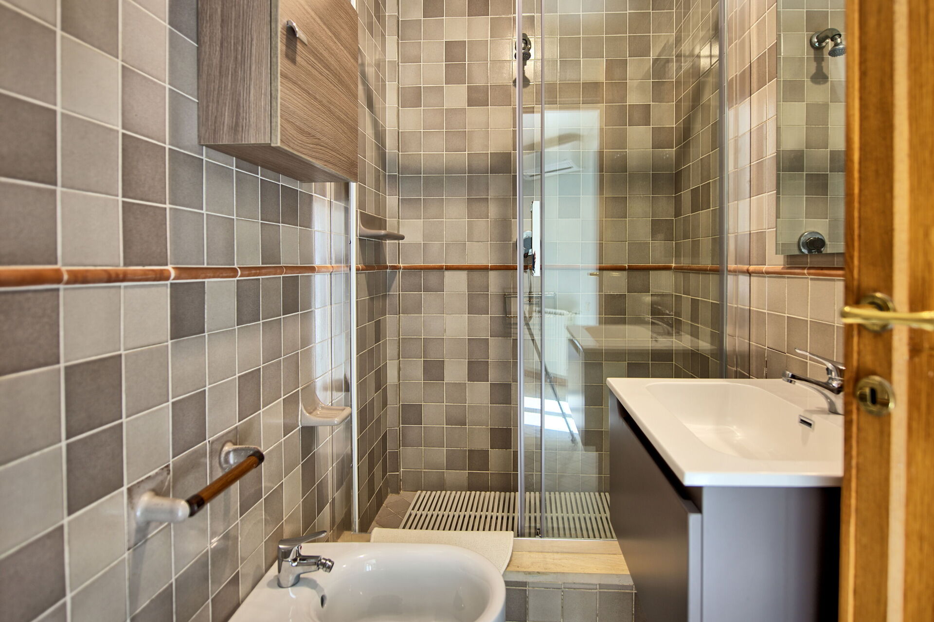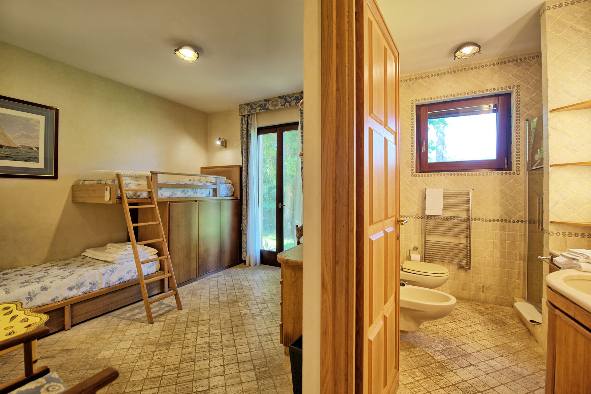 Ground floor: large living room with dining area; kitchen (dishwasher, oven, large refrigerator with ice maker, microwave, 5 burner cooktop, Nespresso coffee maker, toaster, citrus juicer, electric kettle, blender, mixer) with outdoor access; WC; double bedroom with private bathroom with shower and outdoor access; double bedroom with private bathroom with shower and outdoor access; bedroom with offset beds (2 single offset beds, not bunk beds) with private bathroom with shower and outdoor access; double bedroom with private bathroom with shower and outdoor access; master bedroom with double bed and private bathroom with whirlpool bathtub, hydro-massage shower and outdoor access.