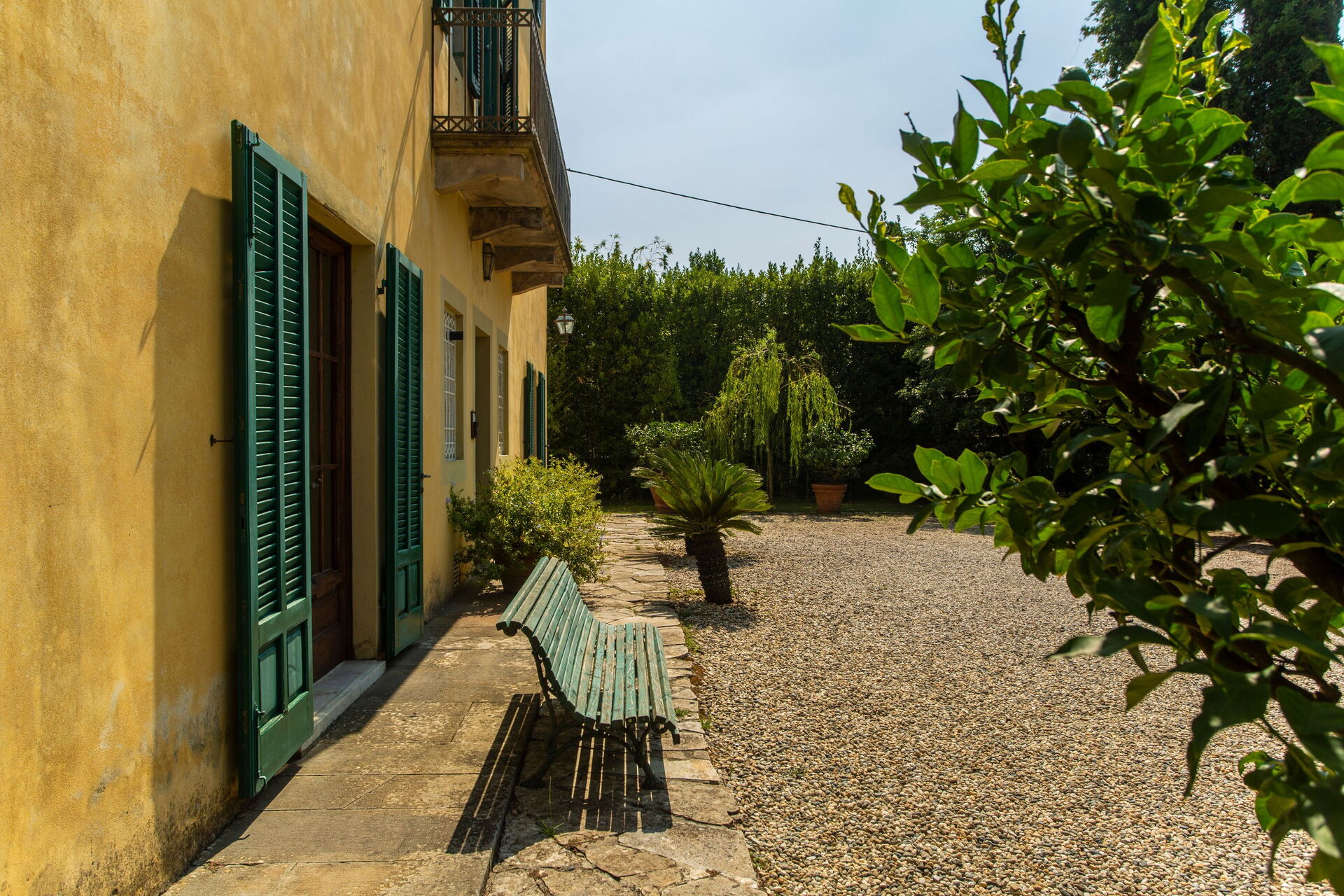 The Italian style garden is partly in grass and partly in pebble stones. The villa's façade is dominated by a palm tree.
