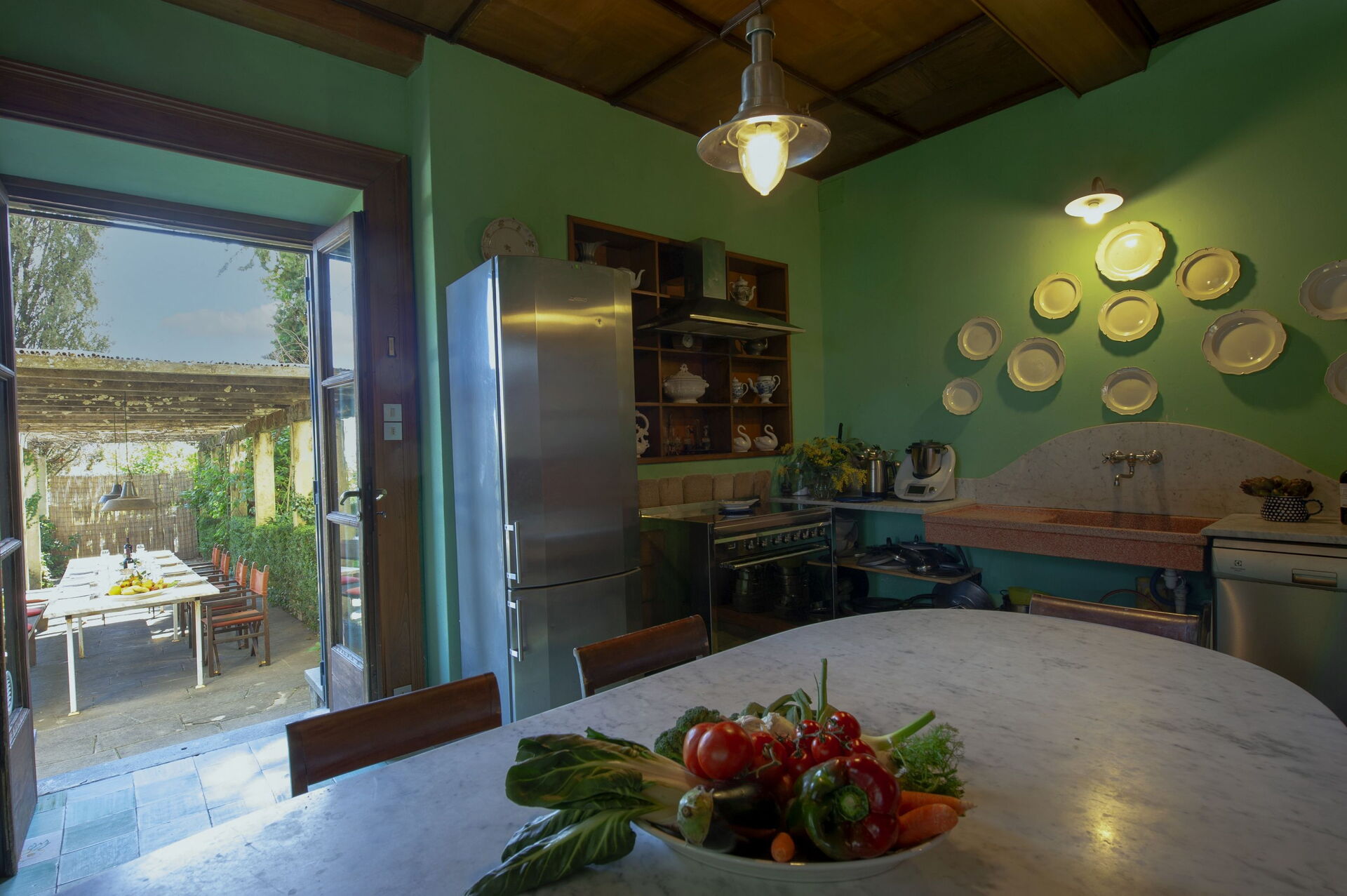 The kitchen has a direct access to the outside part of the garden where you can eat all together on the dining area and have some baths in the adjacent swimming pool.