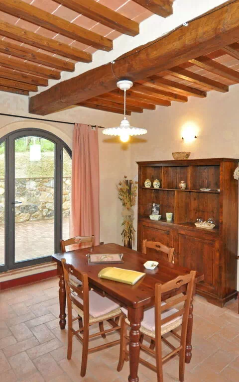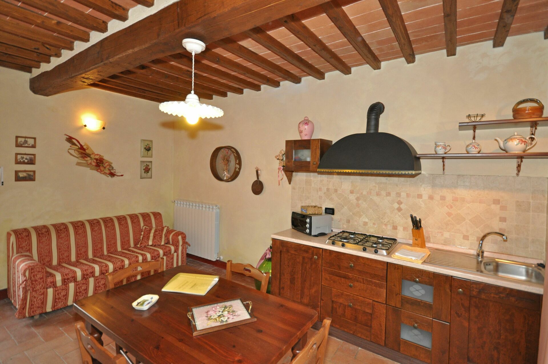 Ground floor (down 2 steps): living room with dining area, double sofa bed (€ 30/day/person) and kitchen corner (toaster oven and small freezer).
