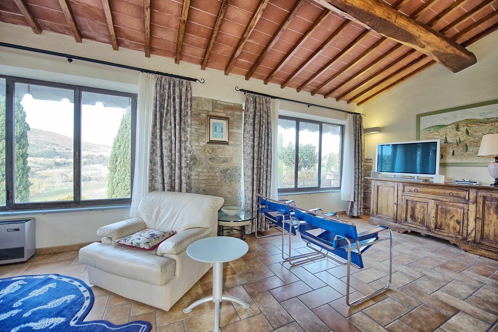 The structure is of a typical Tuscan cottage with high ceiling and wooden beams.