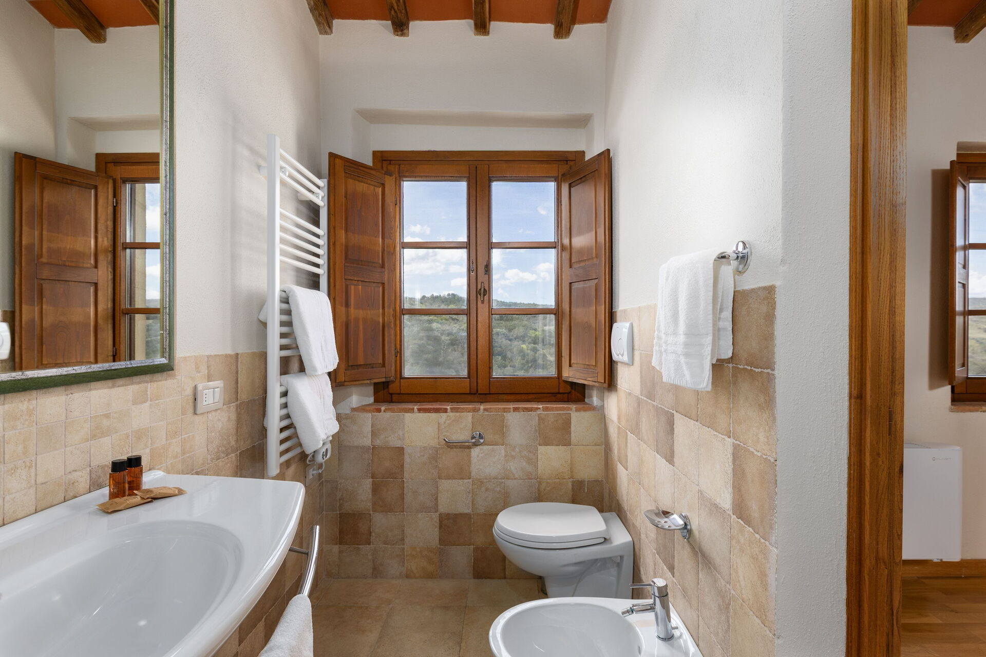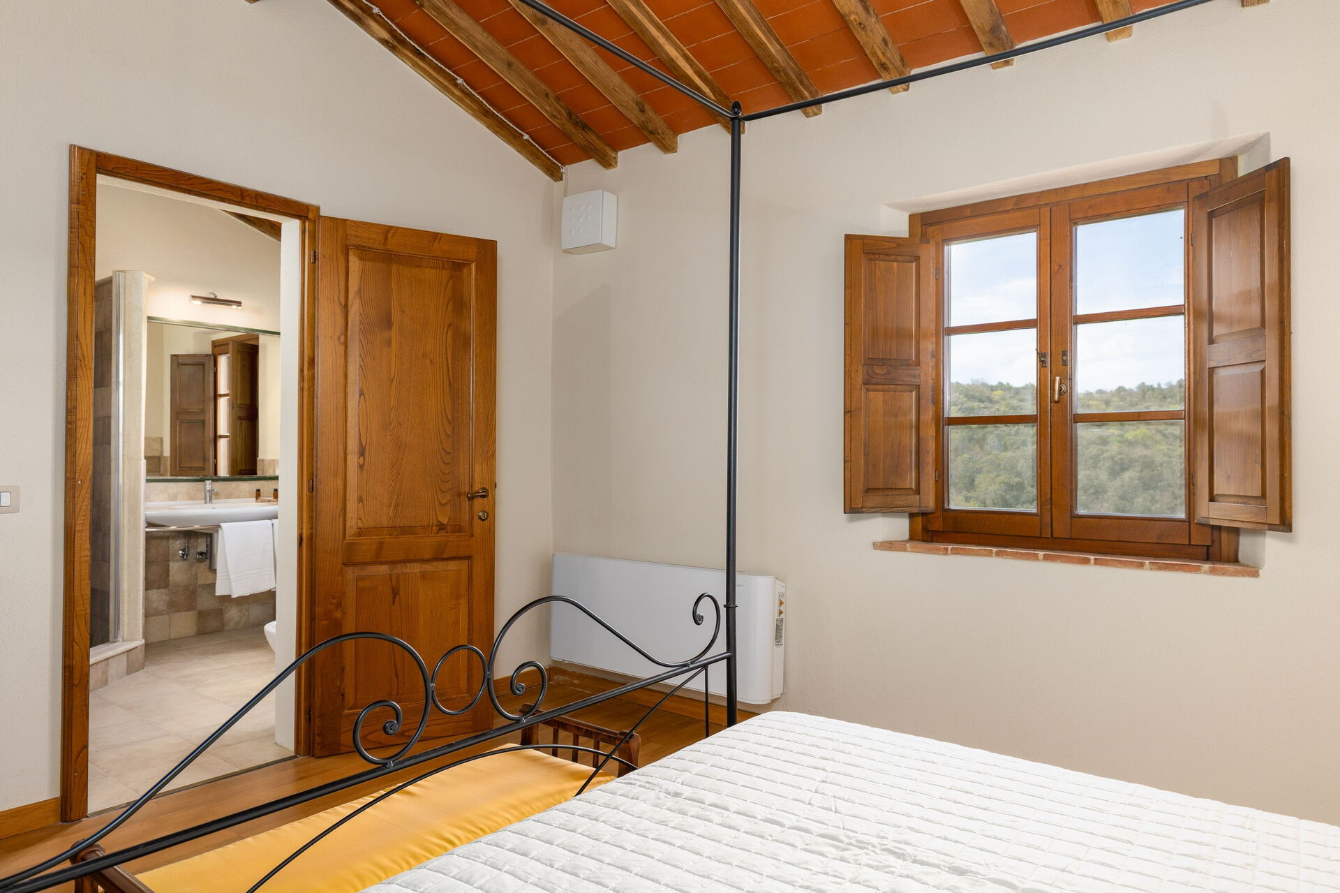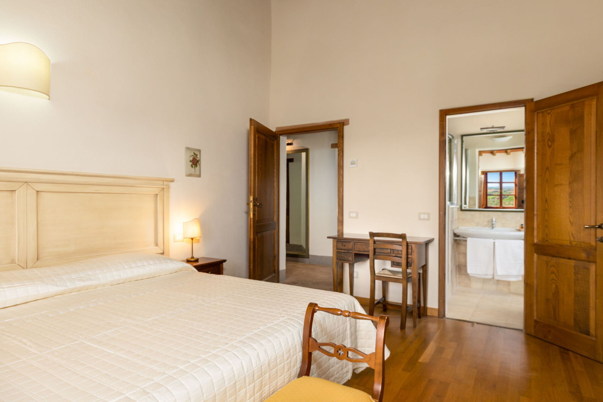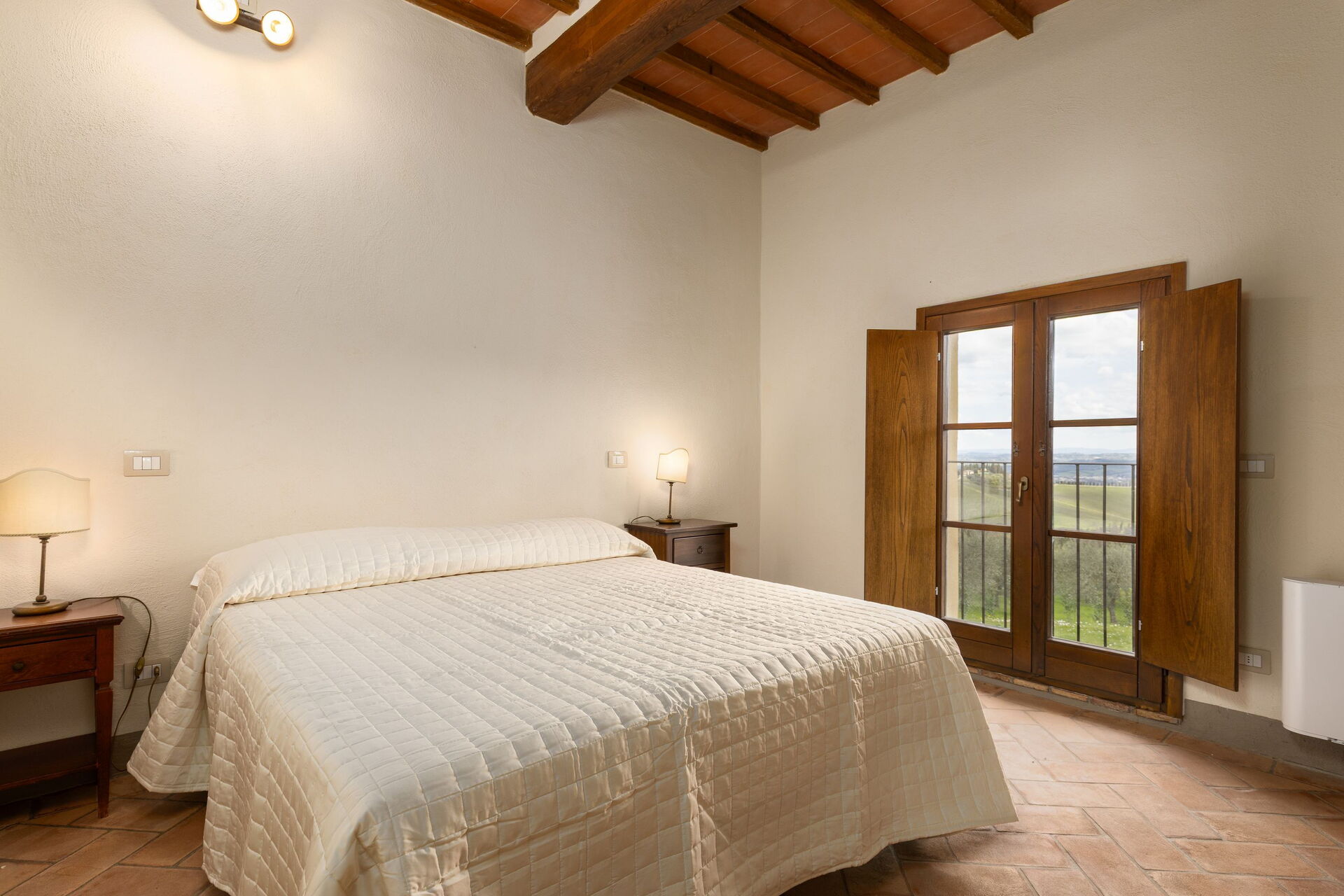 The location, among the vineyards and olive groves of a vast farm in the hills of San Gimignano, offers absolute quiet and privacy.