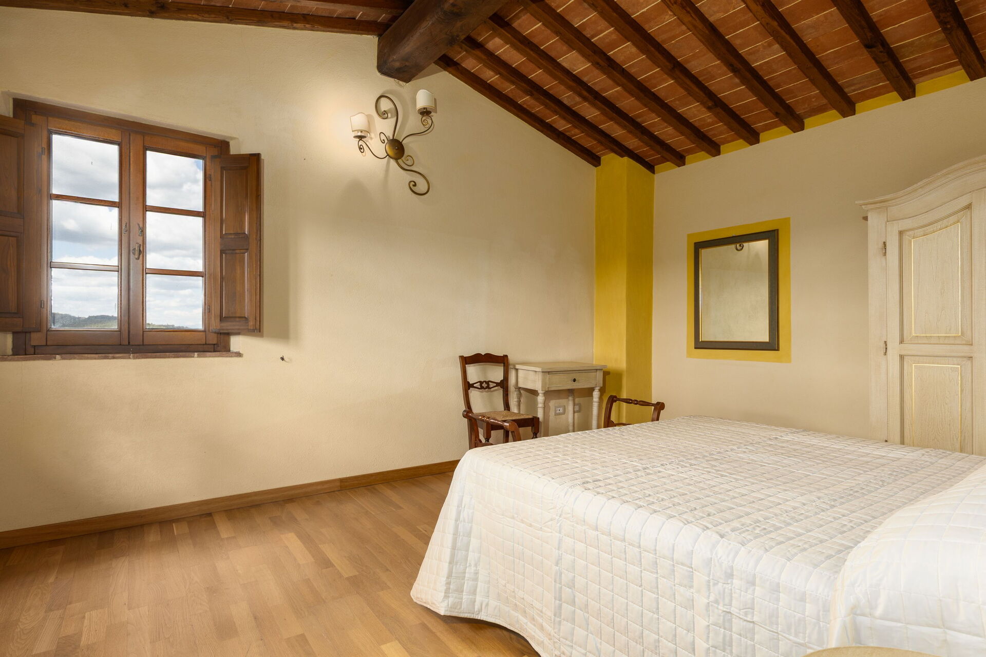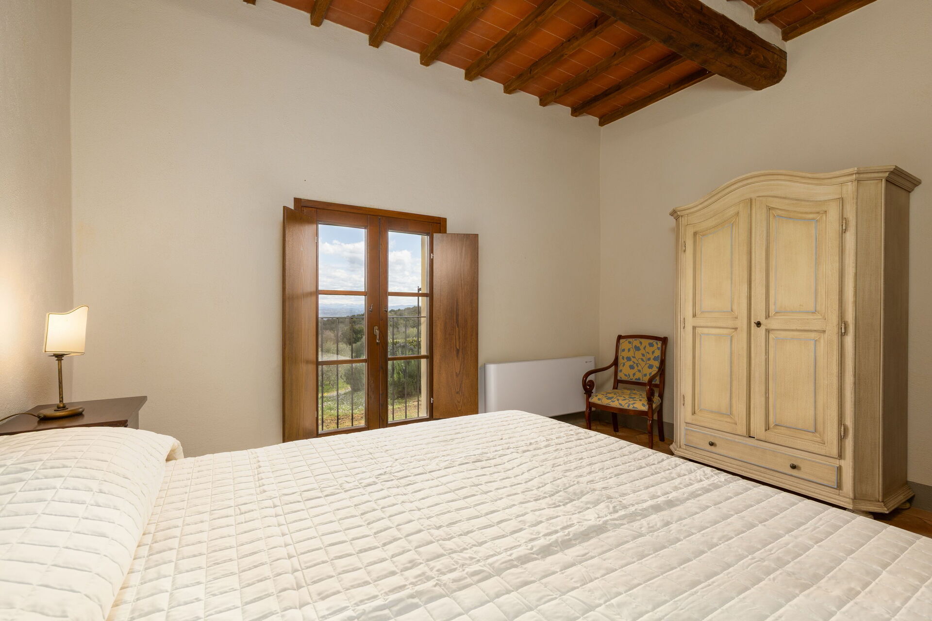 Outside, there is a beautiful garden with panoramic views, and a private pool equipped with sun loungers and gazebos: it is the ideal spot for relaxing and cooling off on summer days, admiring the marvelous sweeping views of the Chianti landscape. A barbecue area and covered pergola are ideal for enjoying meals outside.