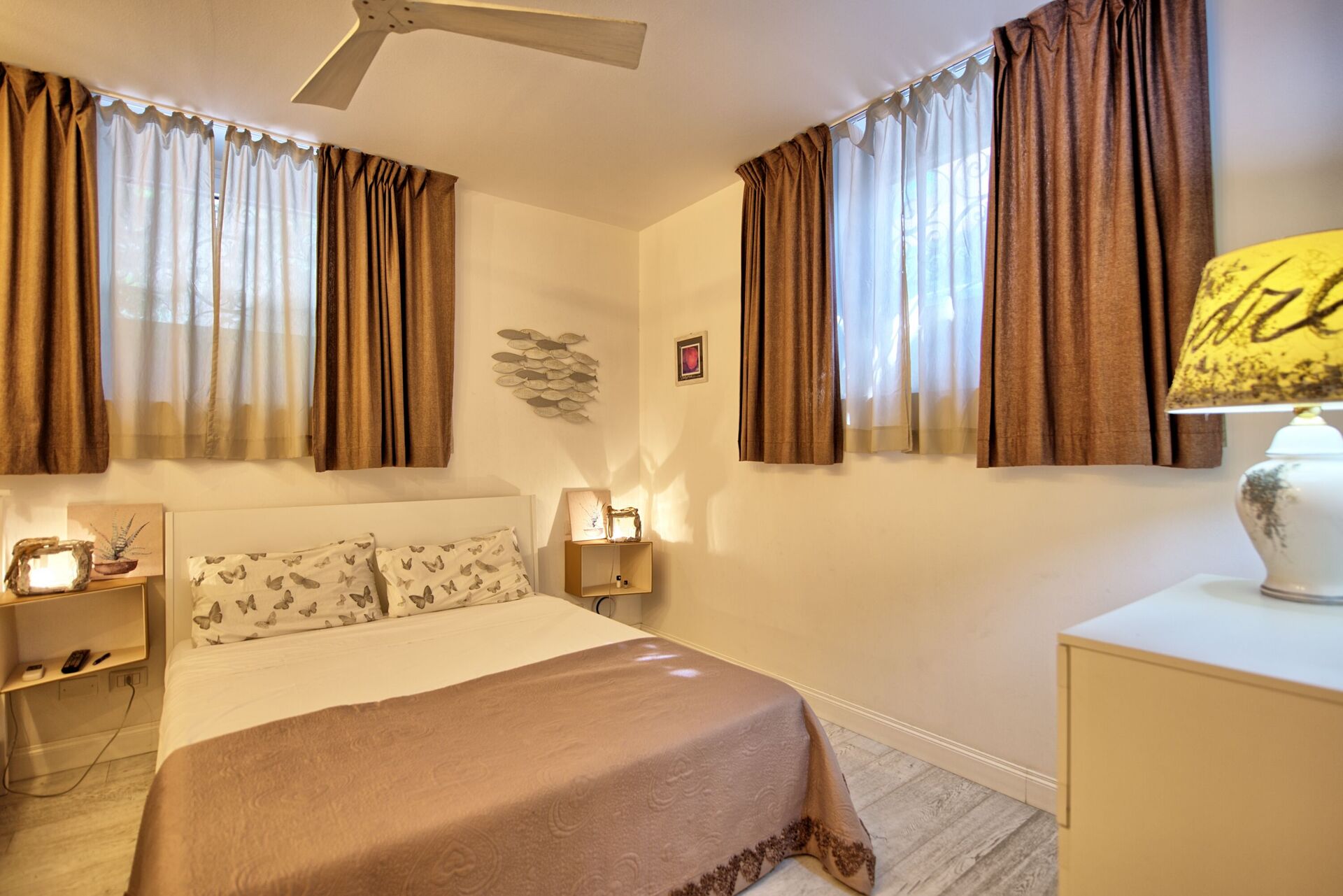 6 steps down: living room with dining area and kitchen (oven, freezer, dishwasher, pod espresso coffee machine) and access to small pocket terrace at the back of the house; living room with TV; 2 double bedrooms; 1 bathroom with shower (without window).