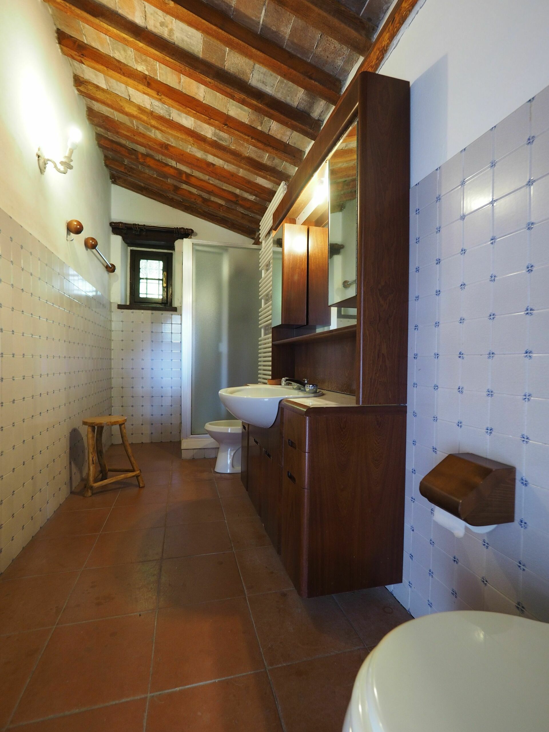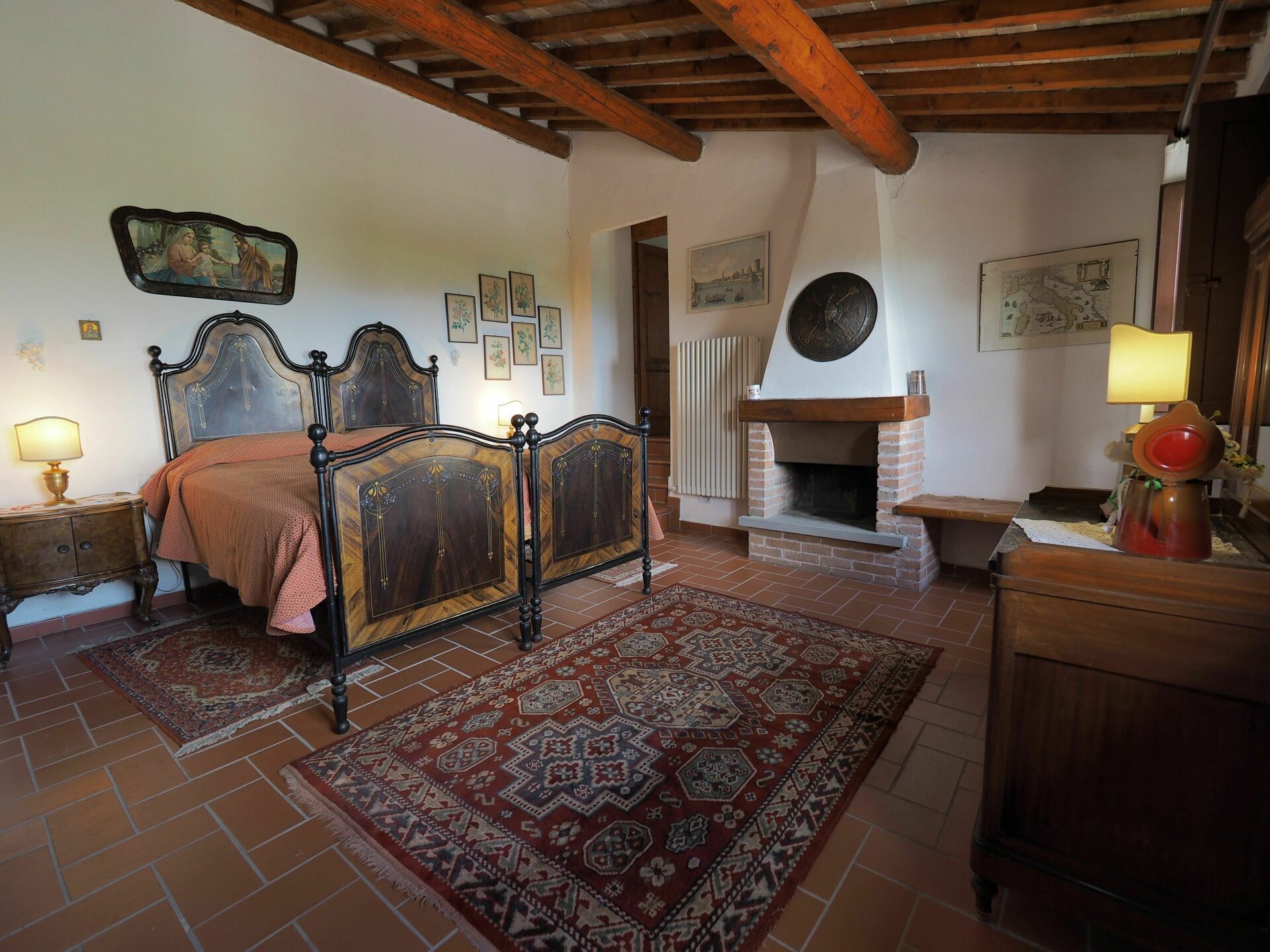 5 steps lower: double bedroom with fireplace and access (via 6 steps) to a bathroom with shower.
