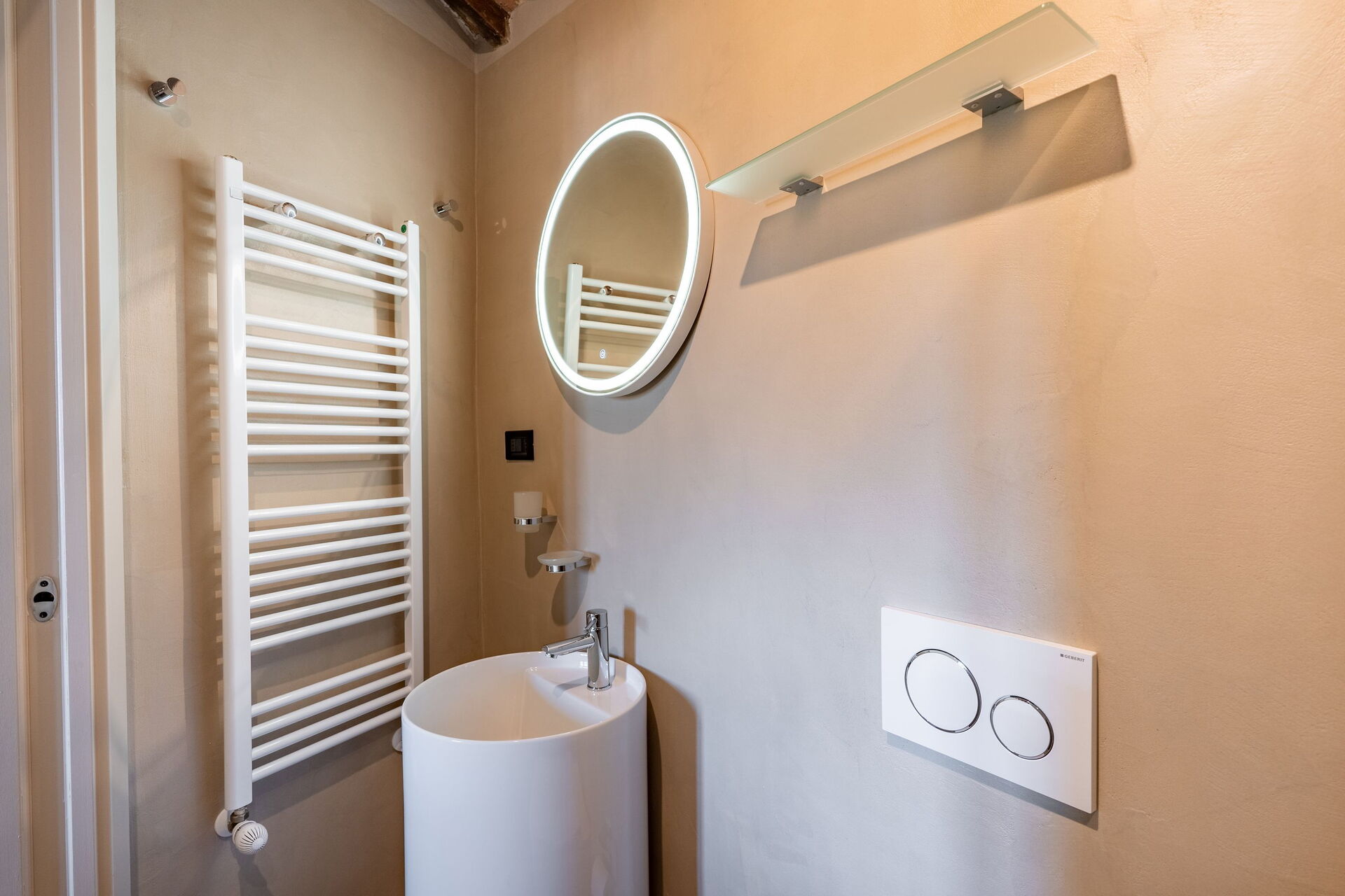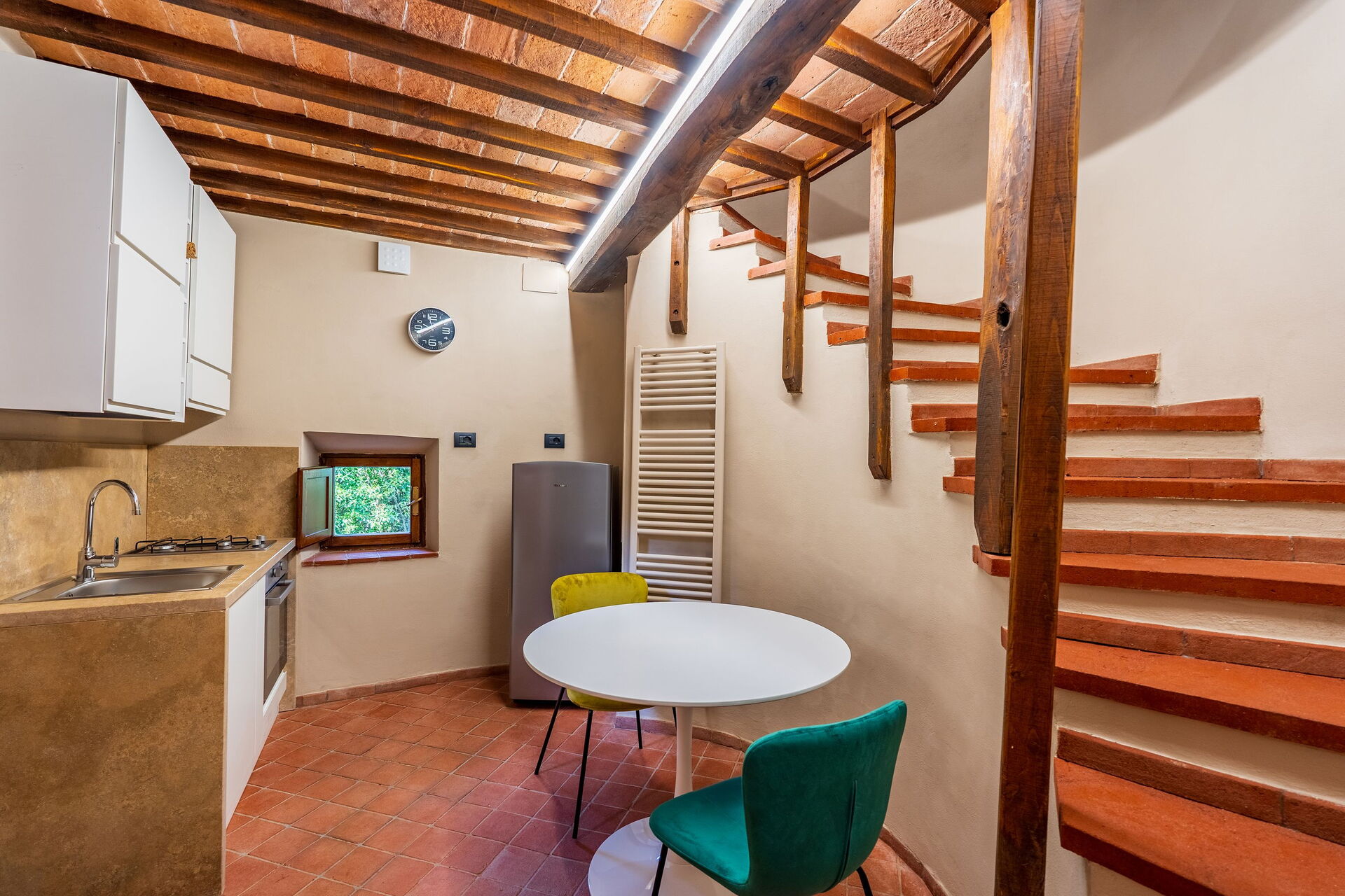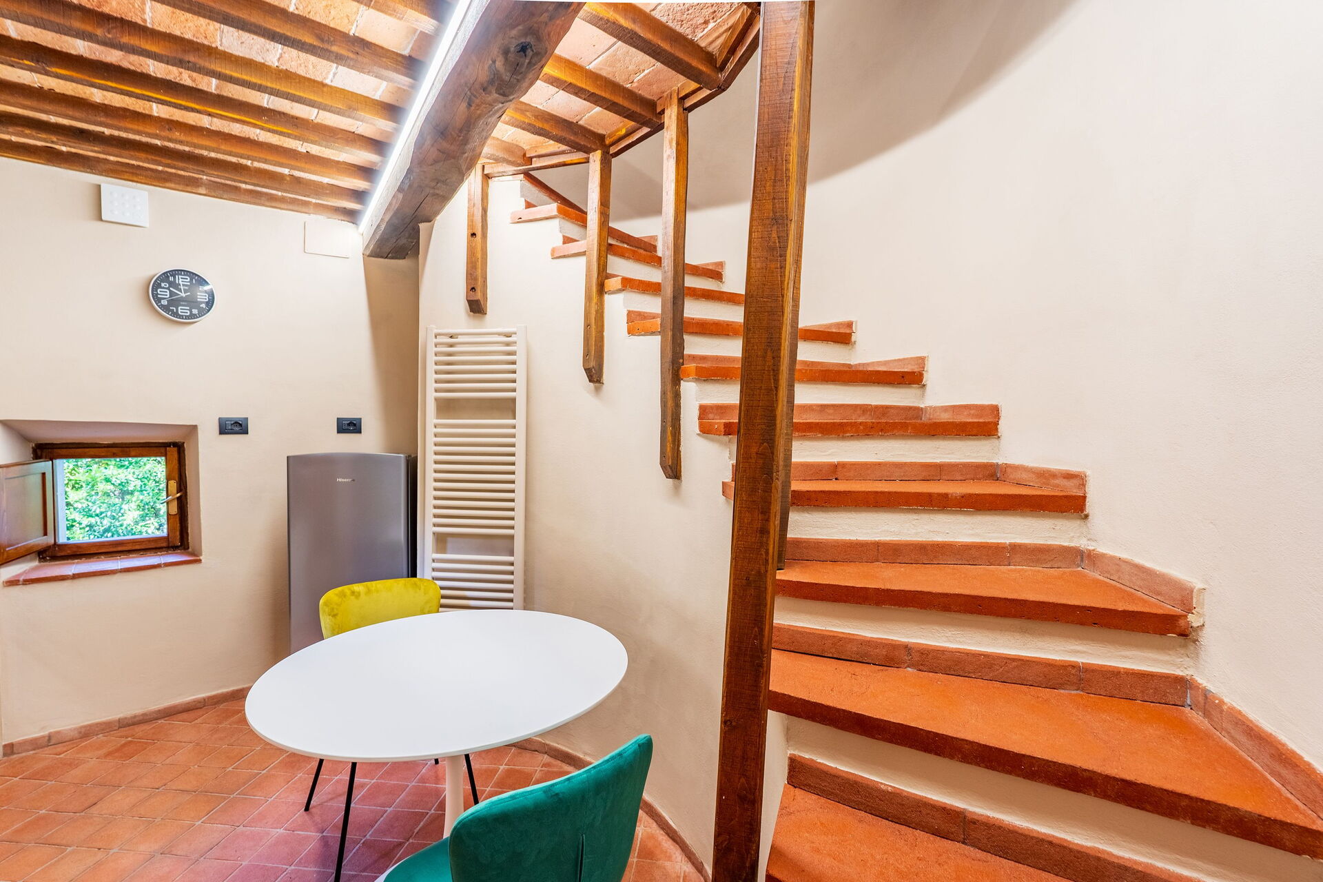 Each of the 3 levels has one room: the ground floor has a kitchen and dining area, the intermediate floor has a living room, and the top floor has the bedroom with bathroom. If you’re looking for a real experience in a Tuscan tower, this unique property is for you.