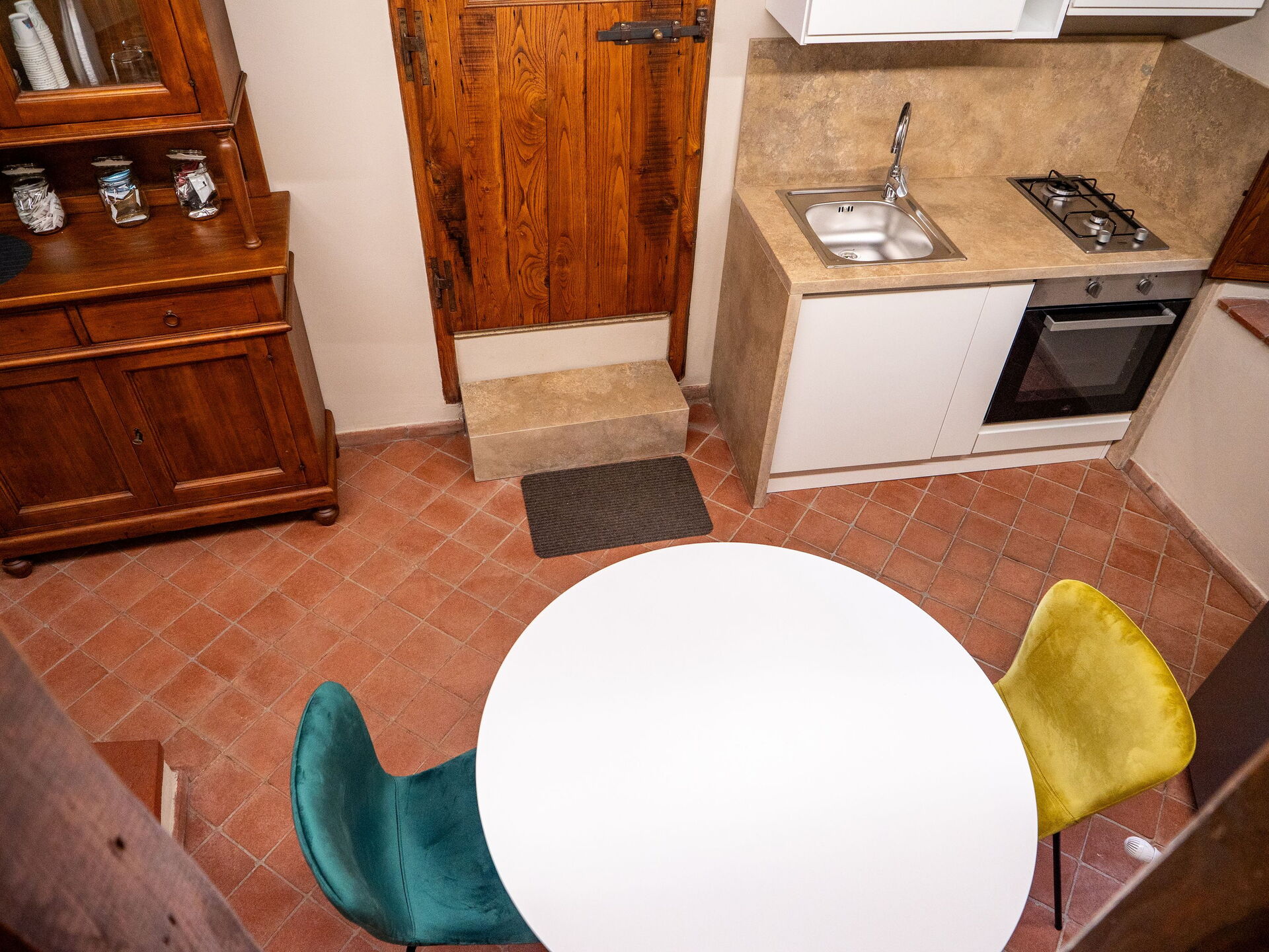 Ground floor: dining area with kitchen corner (oven, 2 burners, refrigerator, toaster, electric kettle, espresso coffee maker) and access to outdoor space.