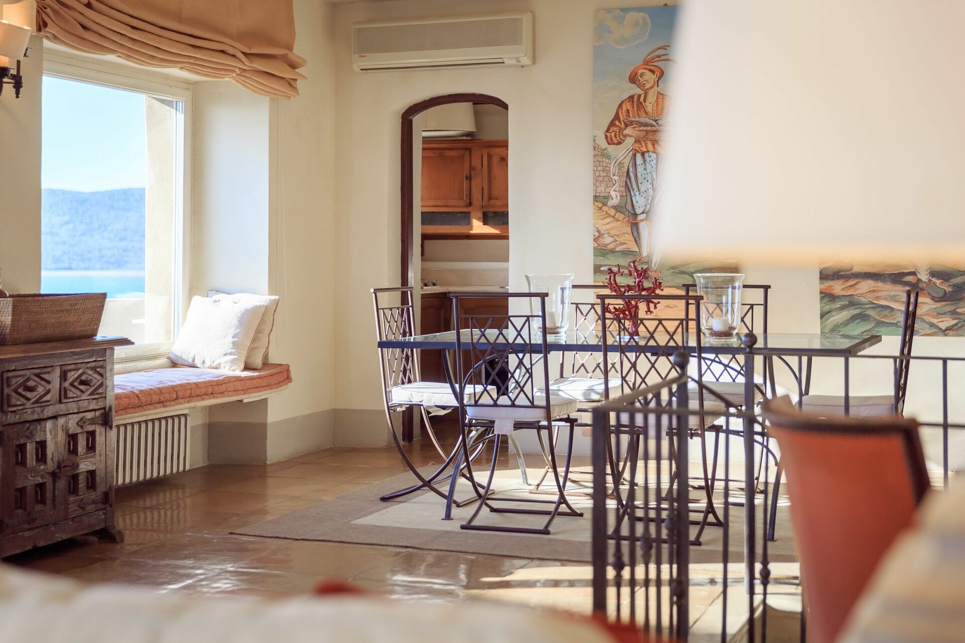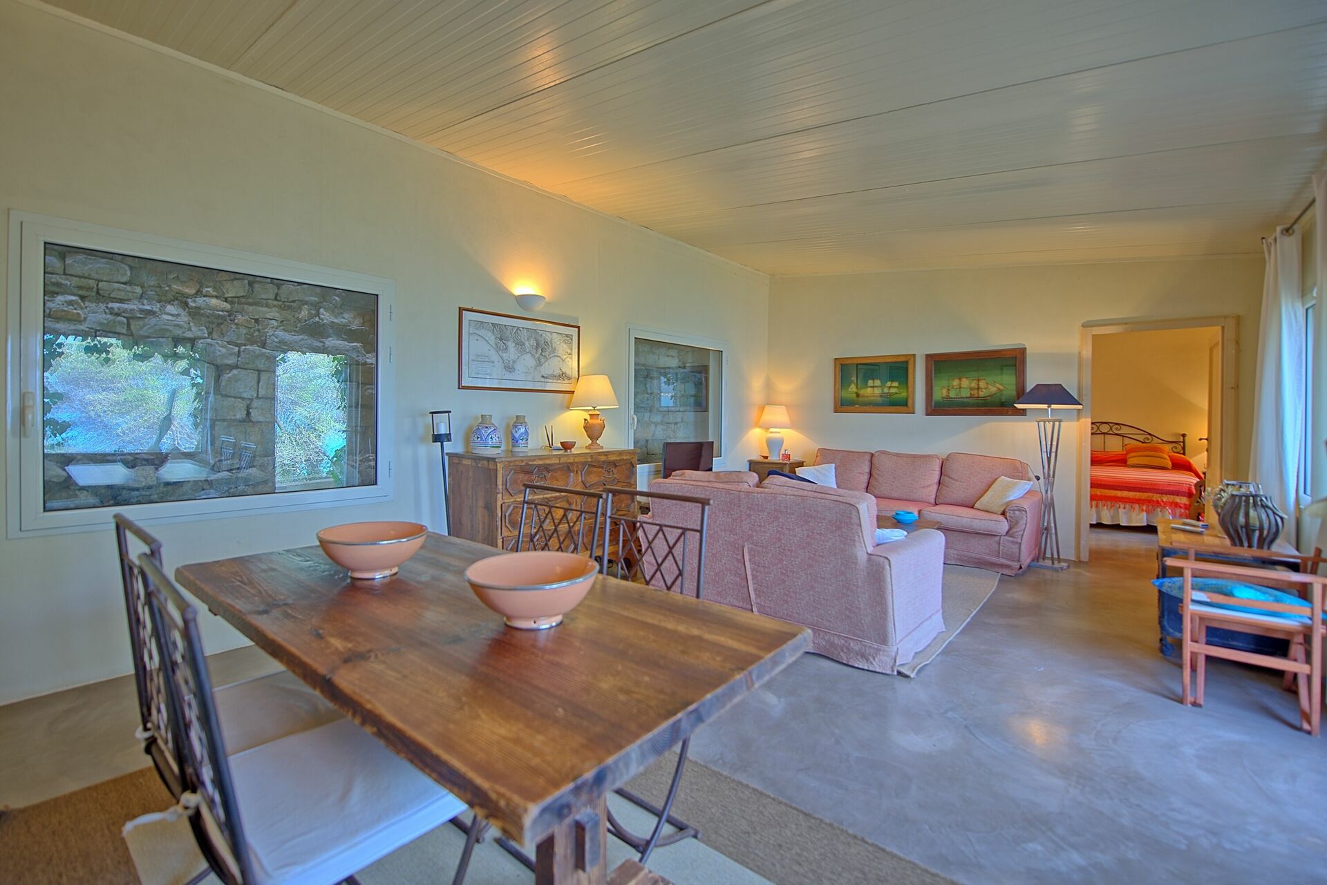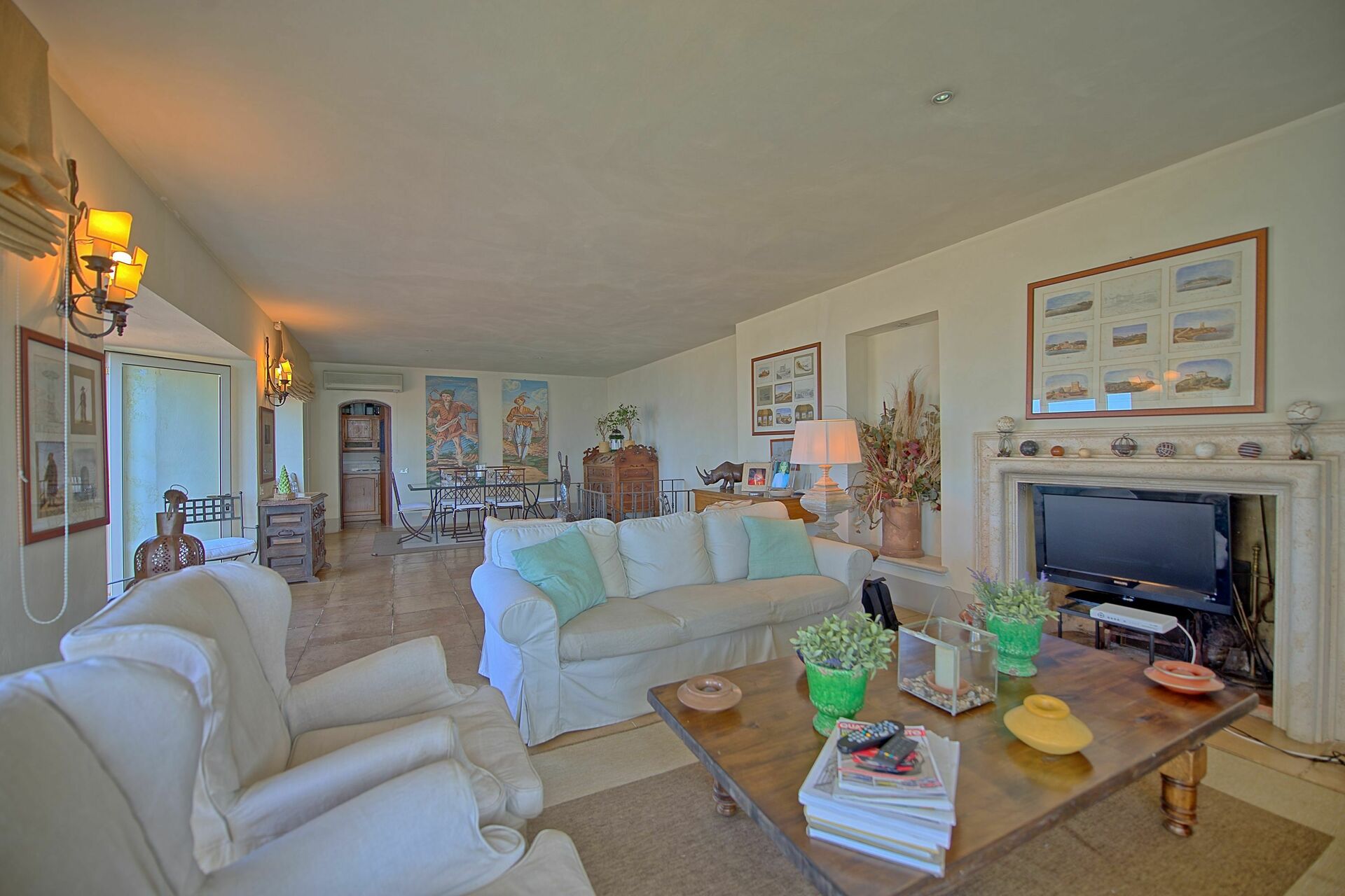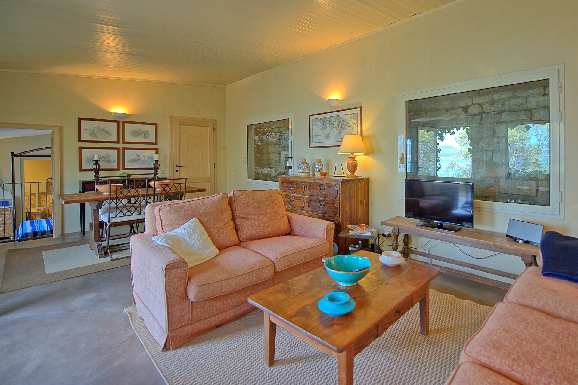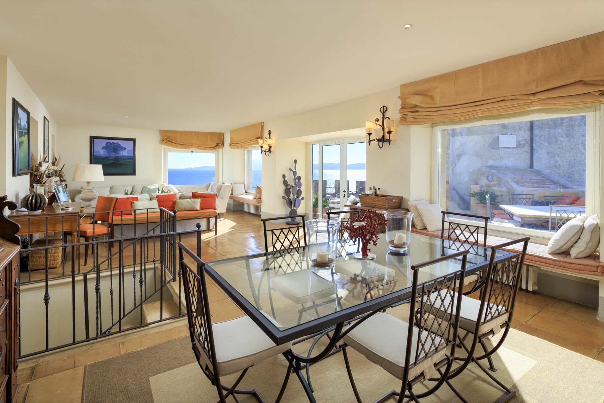 1st floor: large and bright living-room with fireplace providing air-conditioning, dining area with wonderful views over the coastline and access to a beautiful furnished terrace. This area of the villa provides air-conditioning.