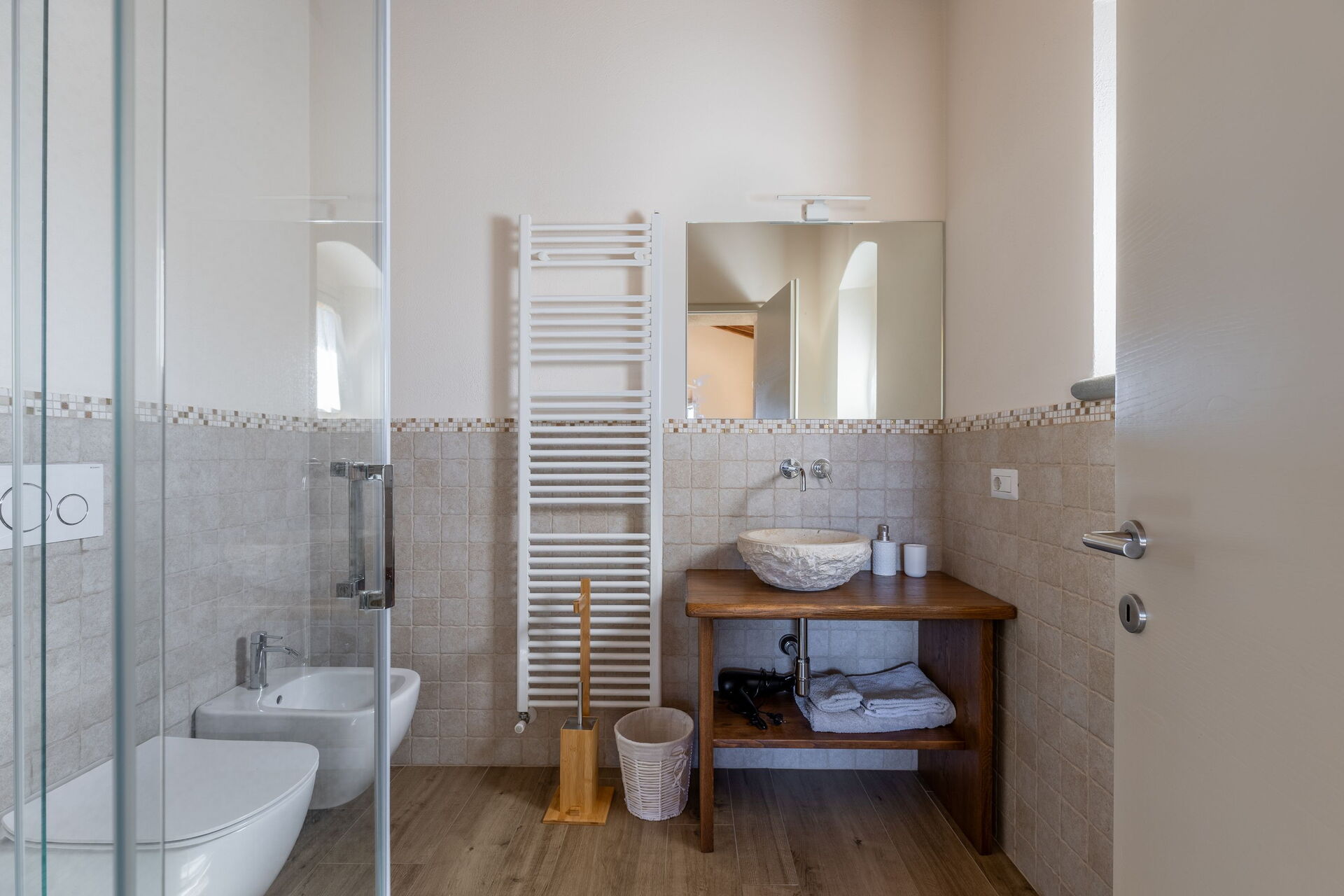 First floor: double bedroom (air conditioning) with ensuite bathroom with shower, double bedroom (air conditioning, non-working fireplace) with ensuite bathroom with shower and direct outdoor access.