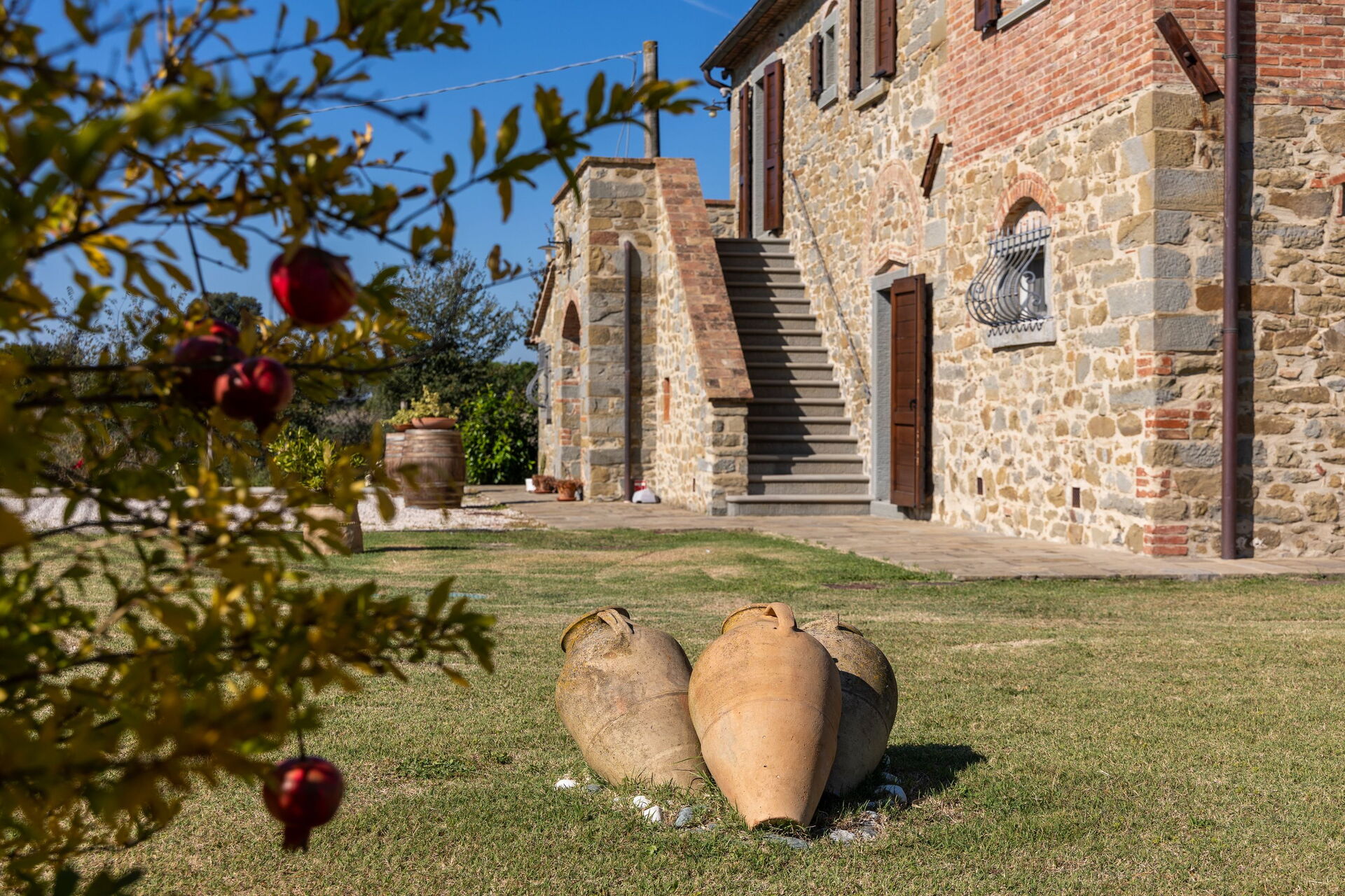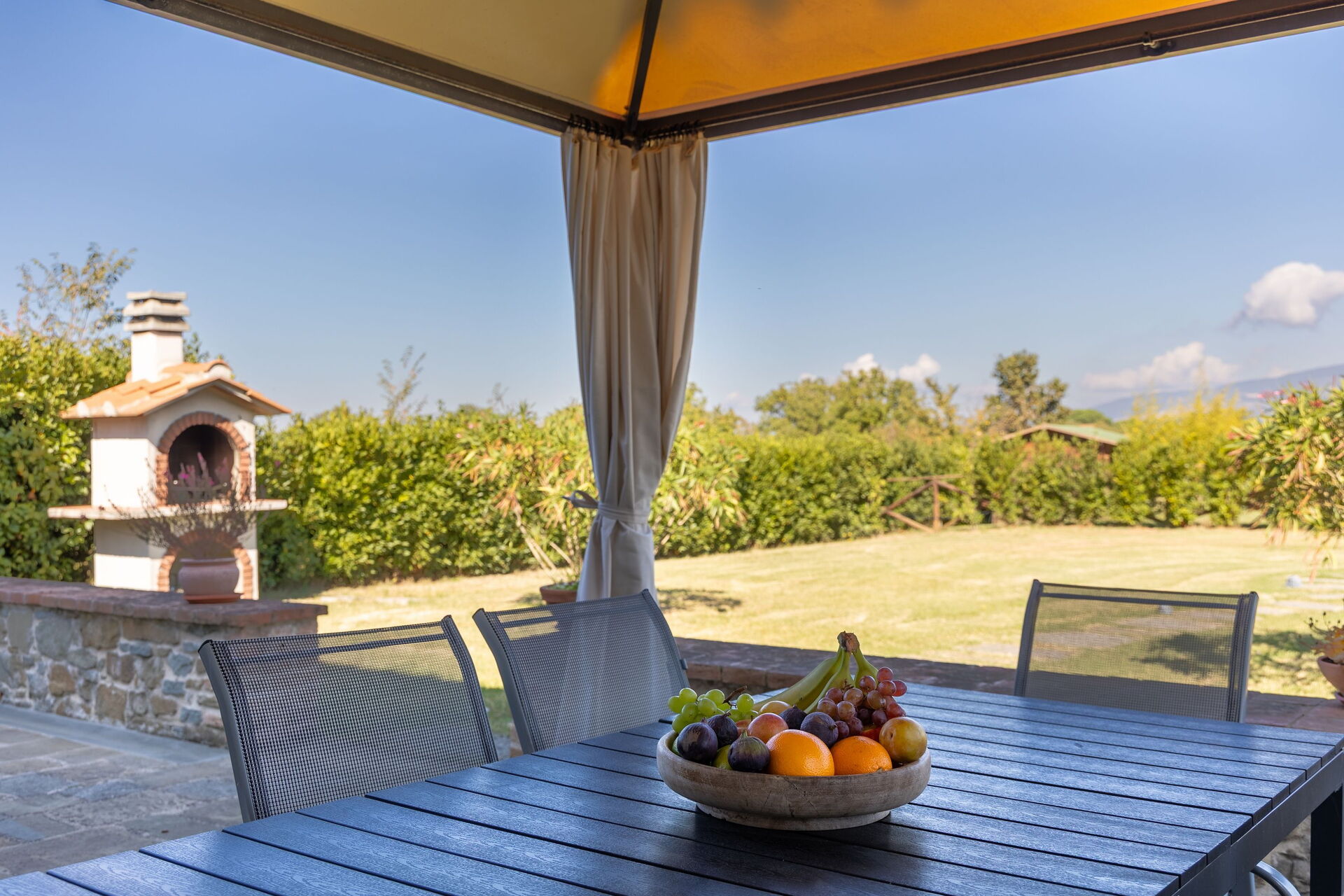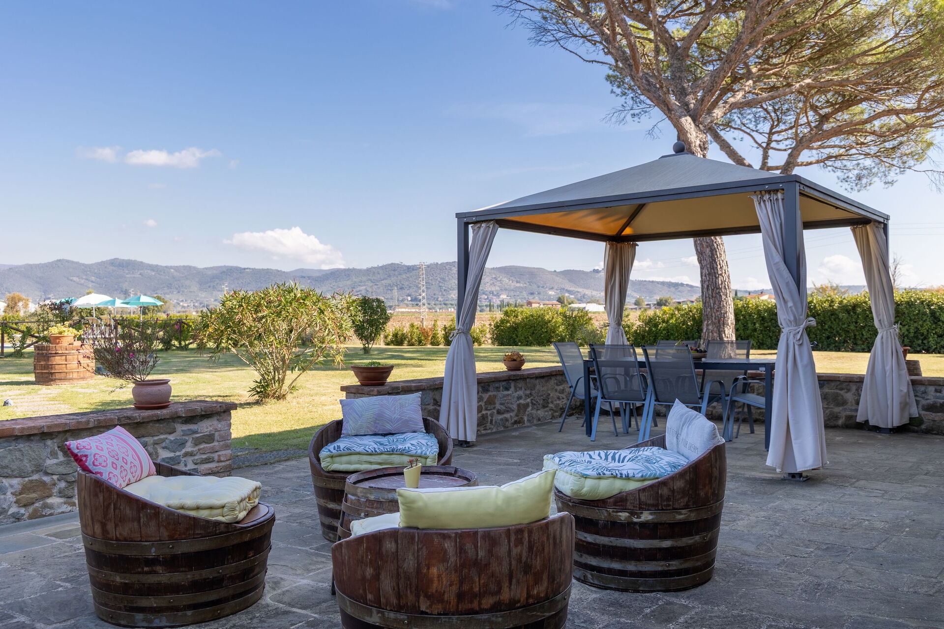 The villa’s large, furnished outdoor spaces are perfect for spending time in the open air. Guests can enjoy a large pool with panoramic views of the countryside and Cortona in the distance, as well as an outdoor terrace next to the villa for dining al fresco.