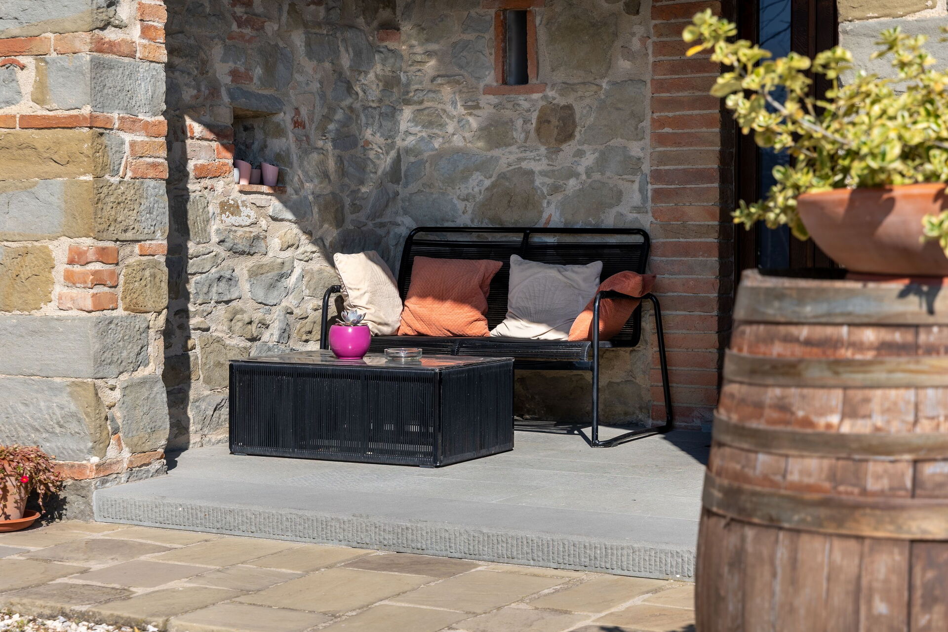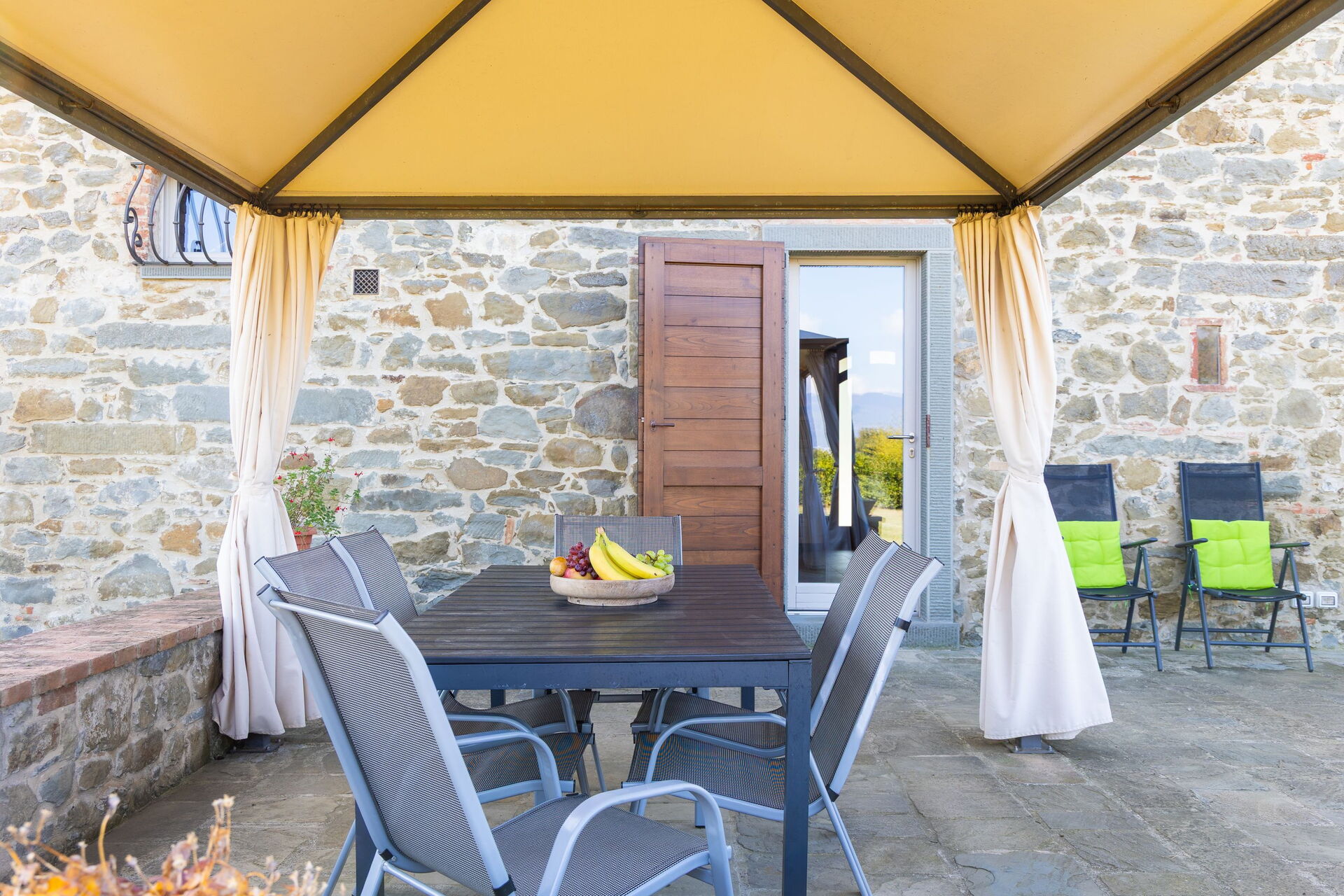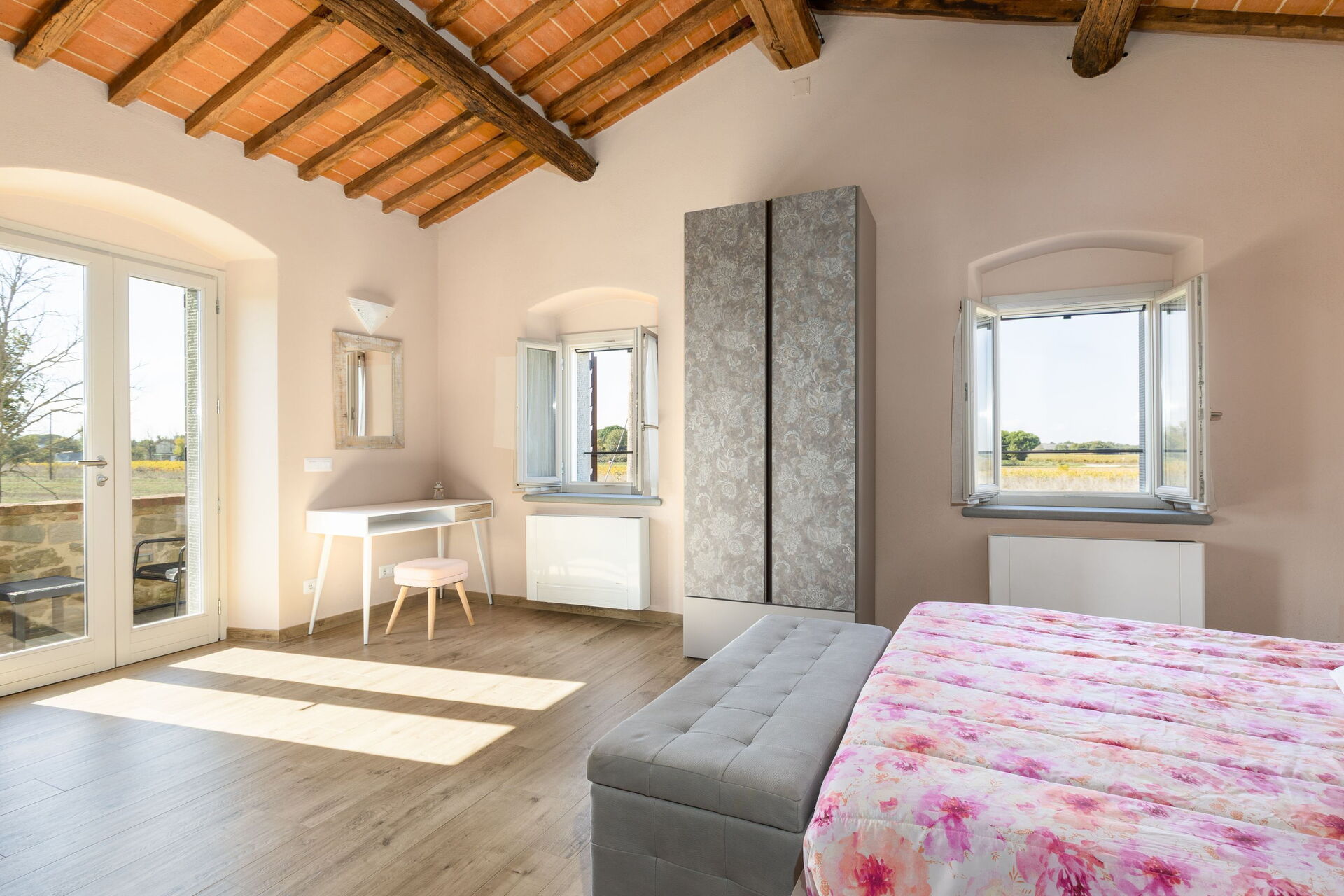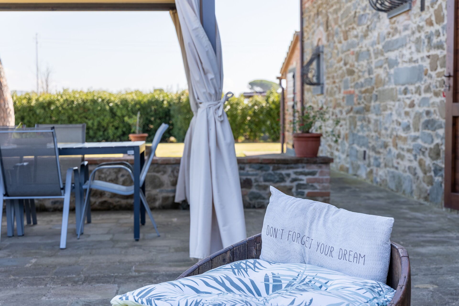 The villa’s large, furnished outdoor spaces are perfect for spending time in the open air. Guests can enjoy a large pool with panoramic views of the countryside and Cortona in the distance, as well as an outdoor terrace next to the villa for dining al fresco.