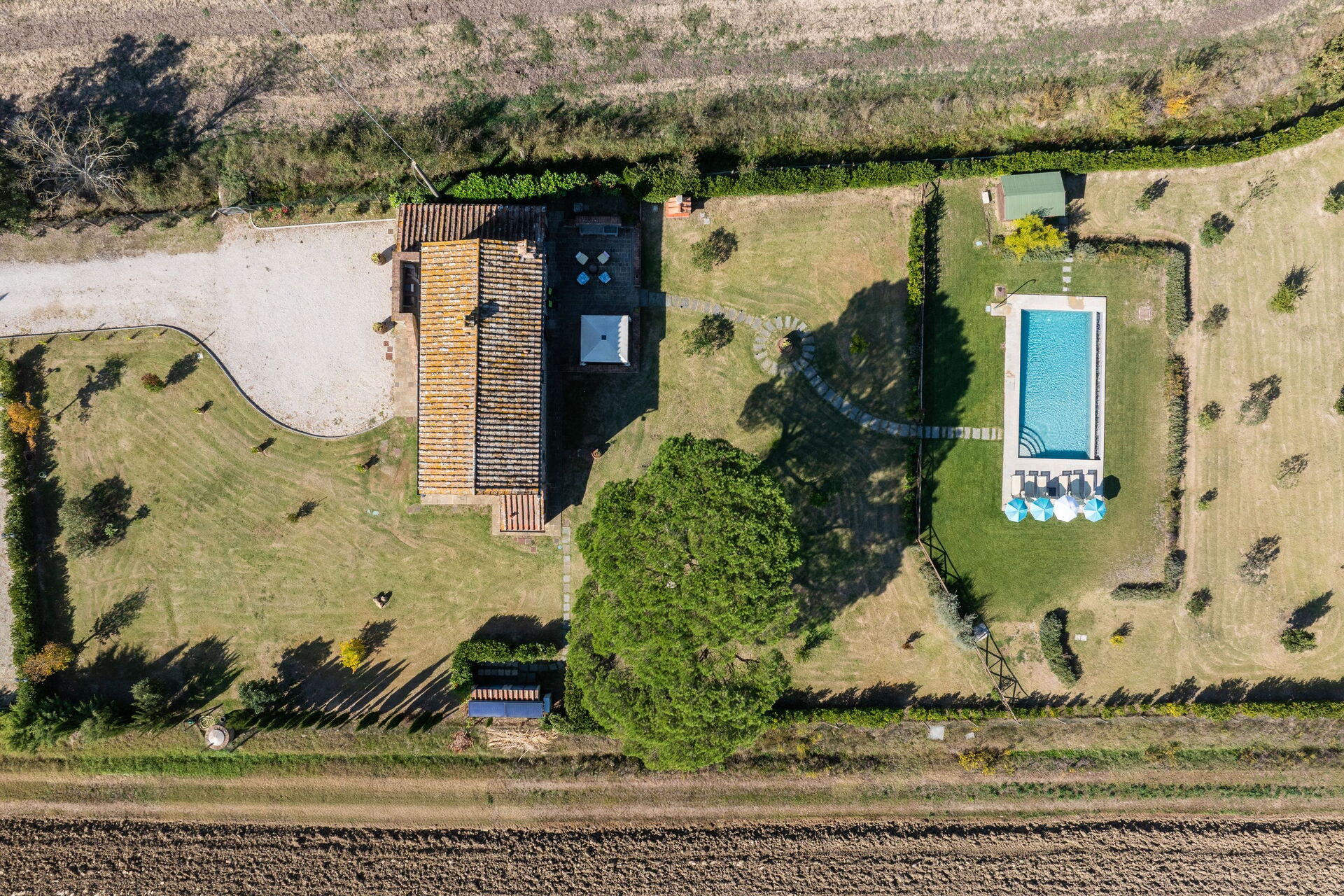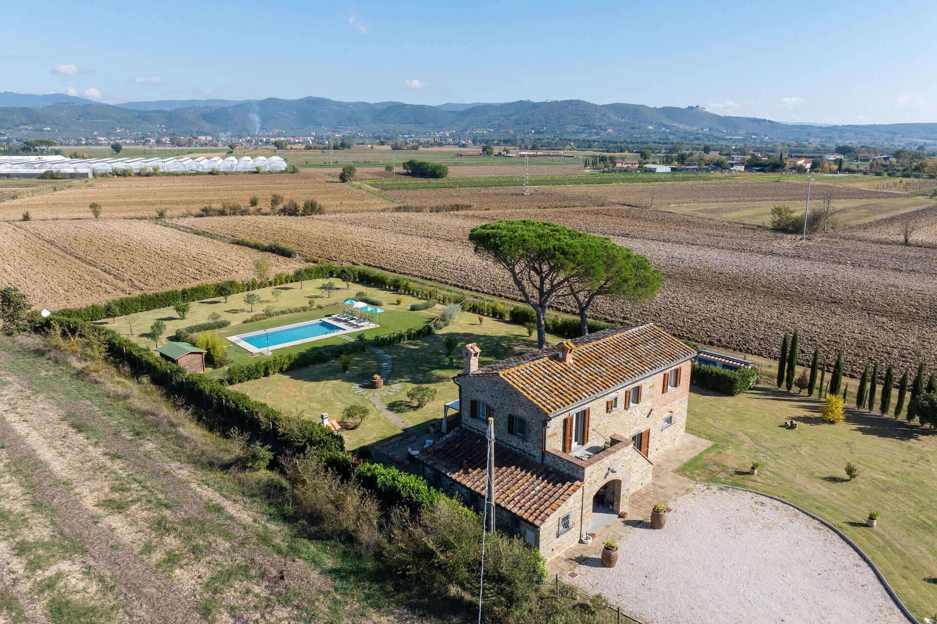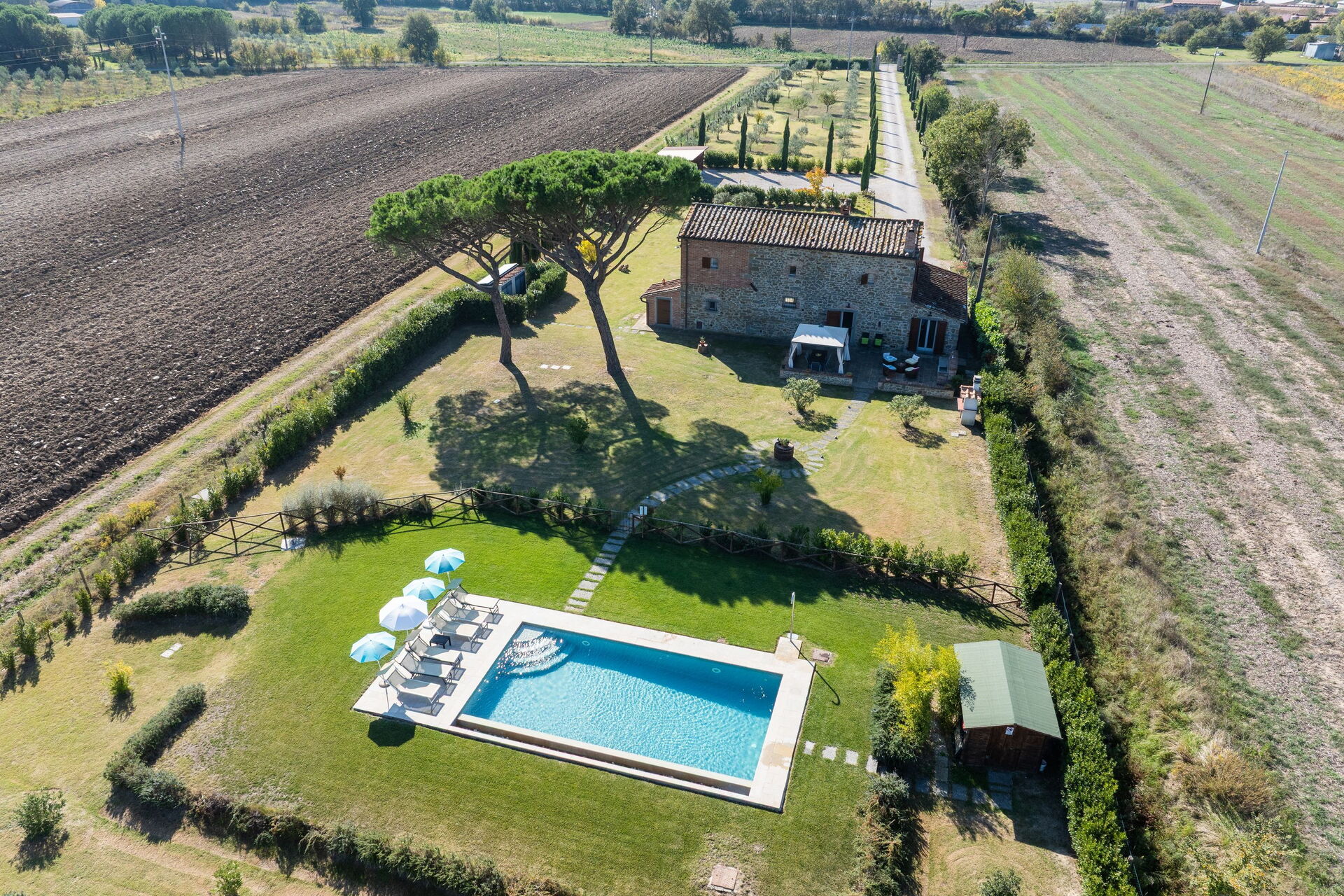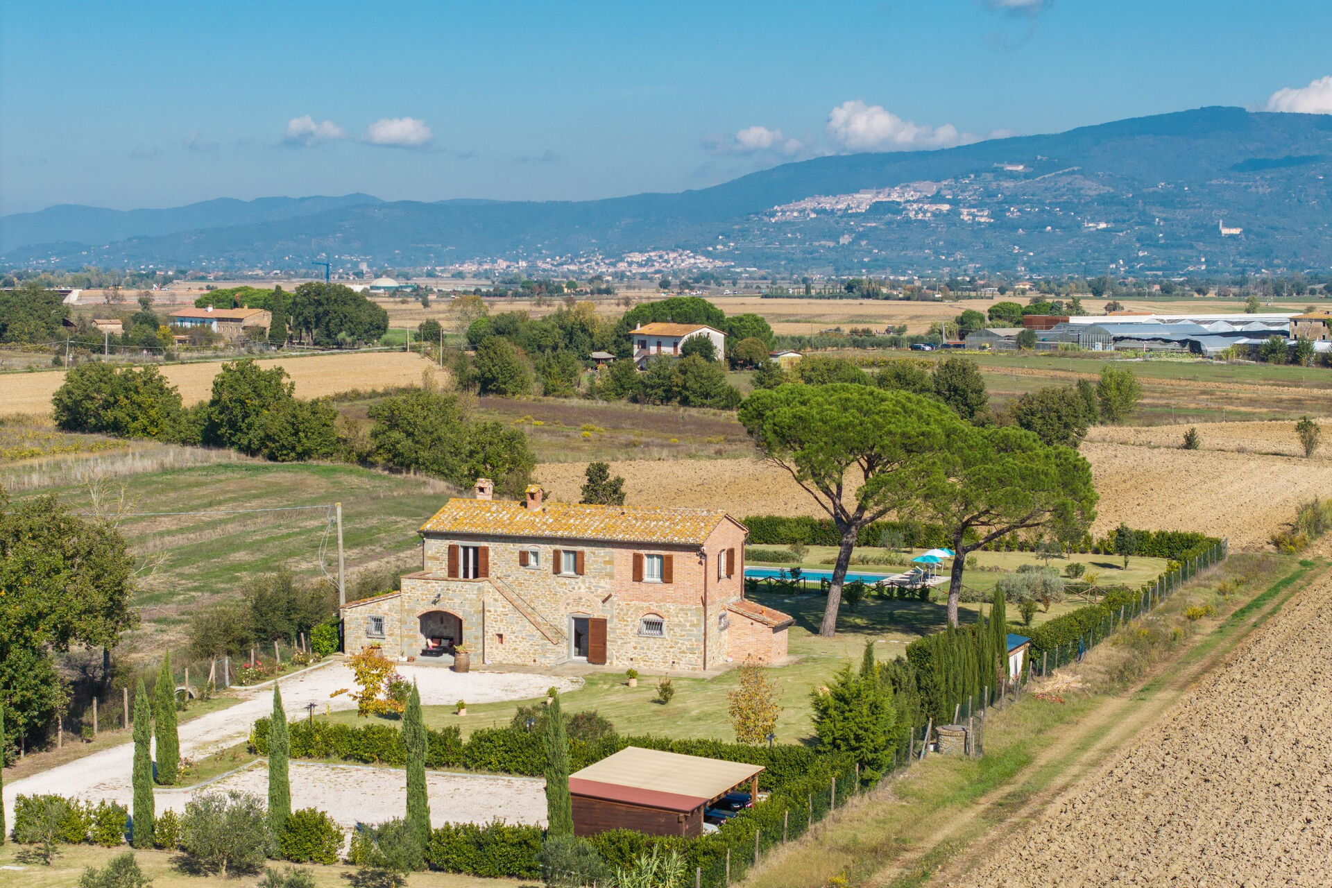 Distances: Terontola (shops of all kinds) 3 km, Cortona 12 km, Lake Trasimeno 10 km, Montepulciano 27 km, Arezzo 35 km, Rapolano Terme (renowned thermal spas) 40 km, Perugia 40 km, Pienza 45 km, Siena 70 km, Florence 115 km.