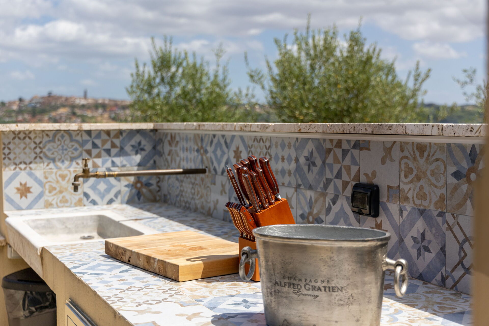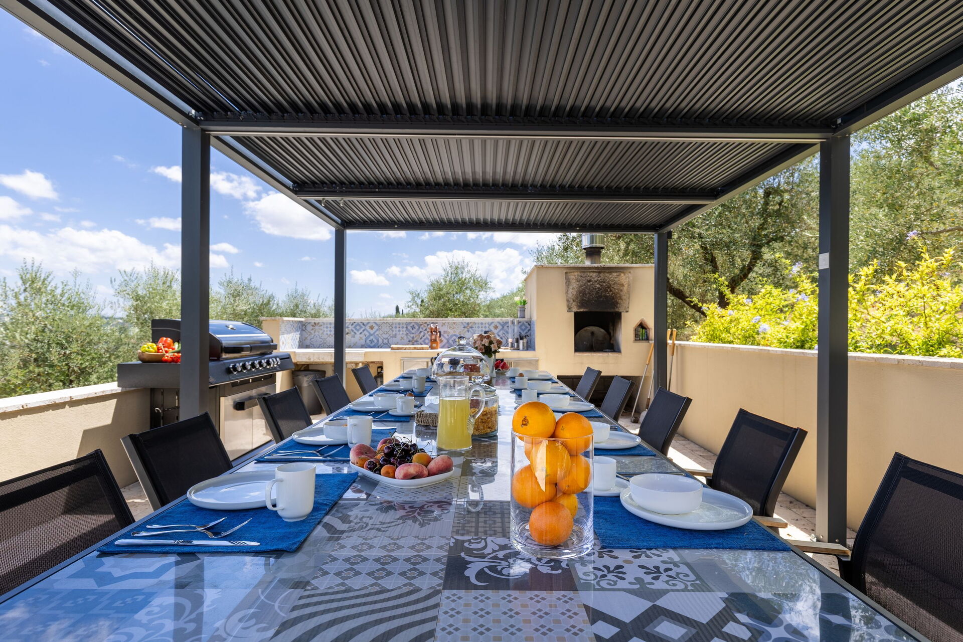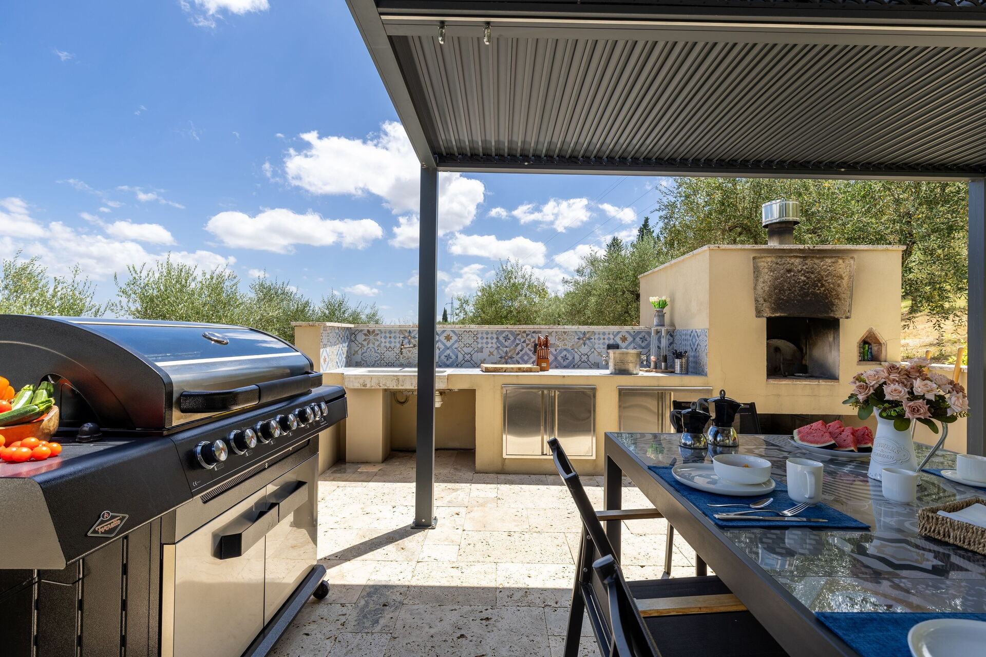 • outdoor dining area equipped with table, chairs, wood burning oven and barbecue