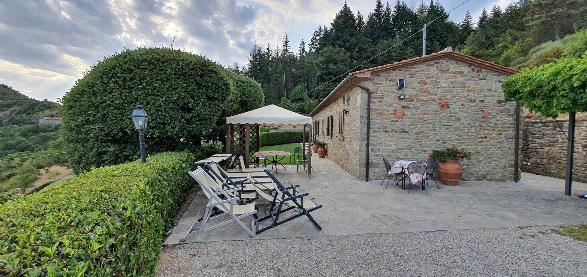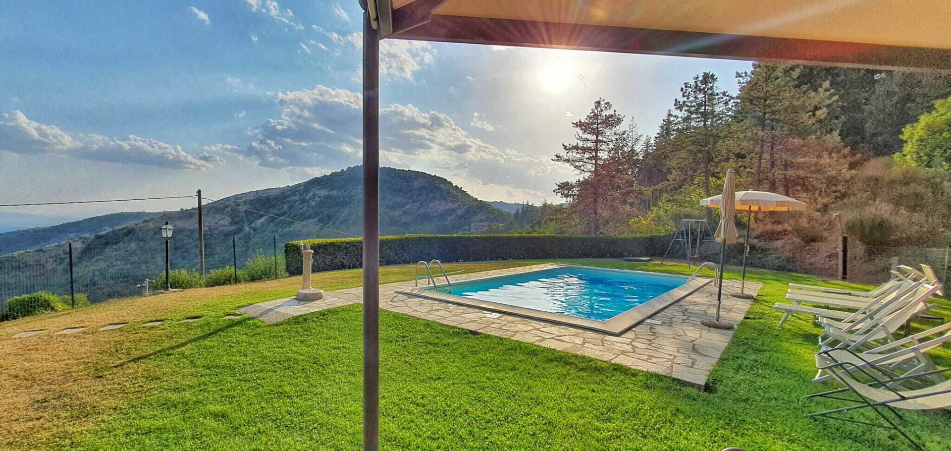 La casa gode di un’ottima vista ed il giardino e la zona piscina sono perfettamente curati e puliti ed inoltre offrono una tranquillità e una privacy impagabili! Inoltre i due gazebo, sia davanti a casa che nella zona piscina, permettono di poter mangiare comodamente fuori casa se si vuole grigliare o di fare dei picnic coi bambini direttamente in piscina.