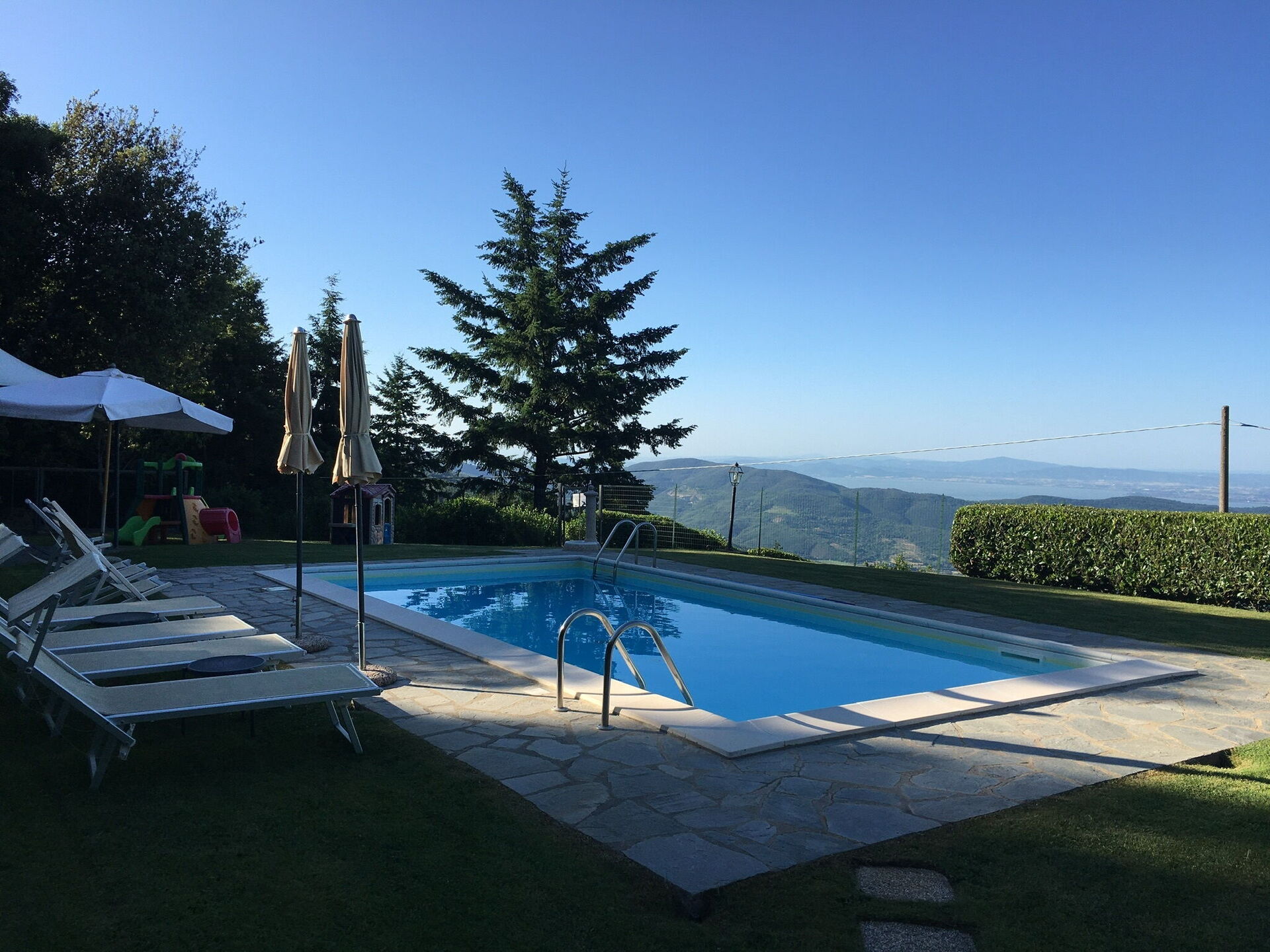 This property is excellent. It is situated with outstanding views of the valley towards Lago Trasimeno. The location is very peaceful with little passing traffic. The property and swimming pool is totally private. The building is very new and is very well equipped. It was spotlessly clean and very comfortable. Air conditioning is included in all rooms which is a bonus. The grounds and swimming pool are immaculately maintained. All outside equipment is of a high quality.