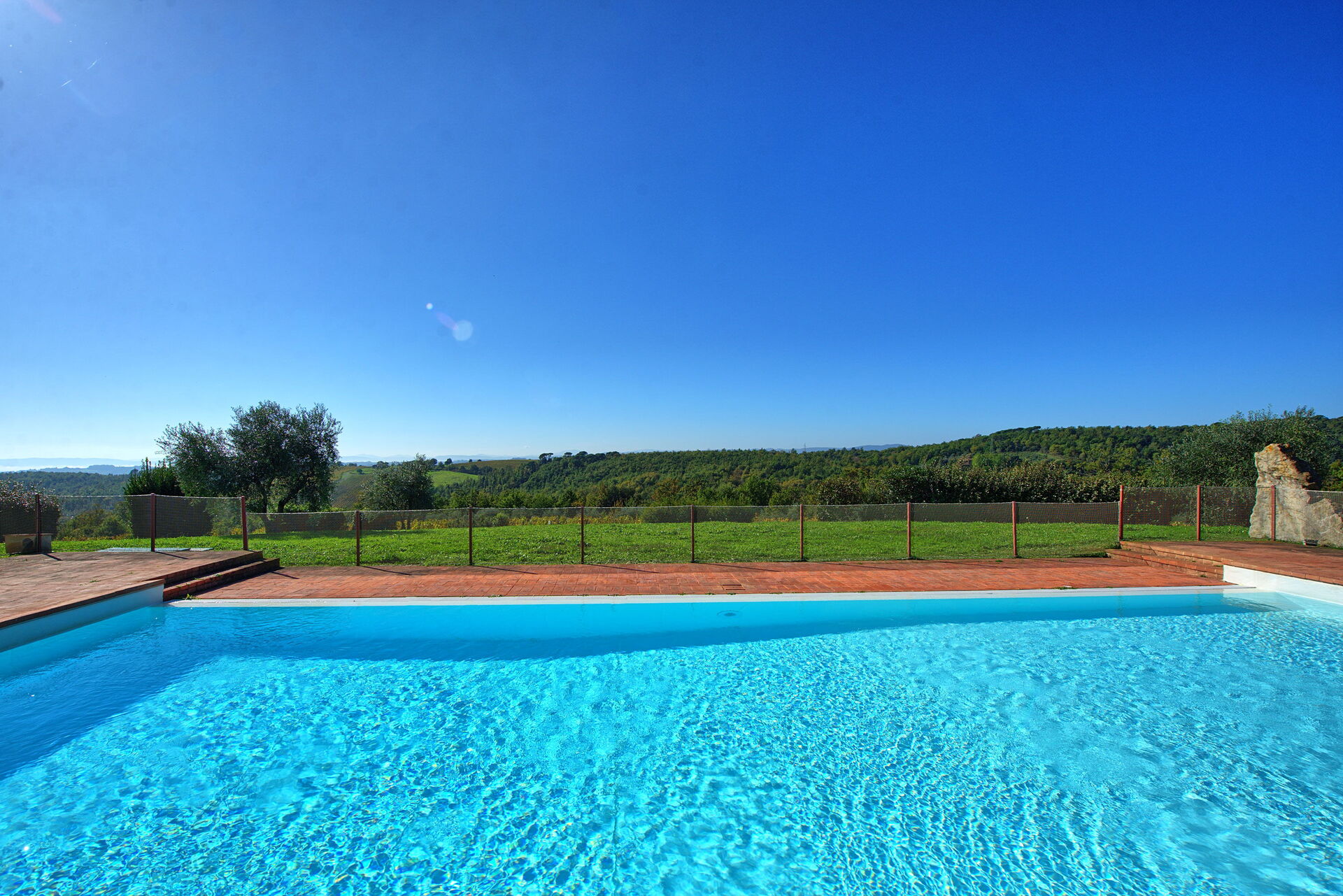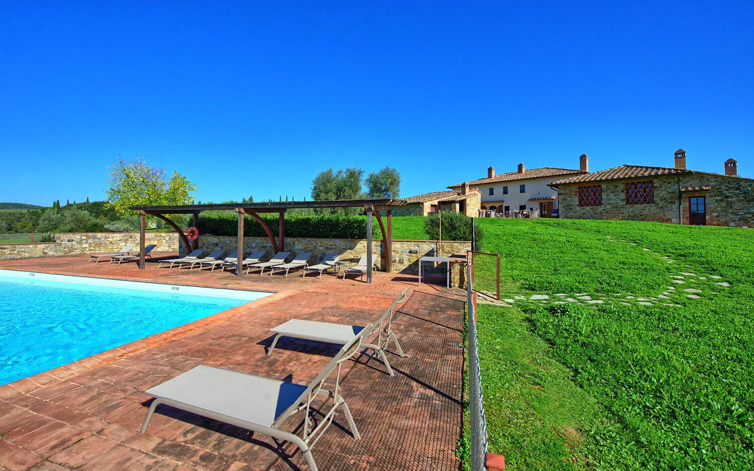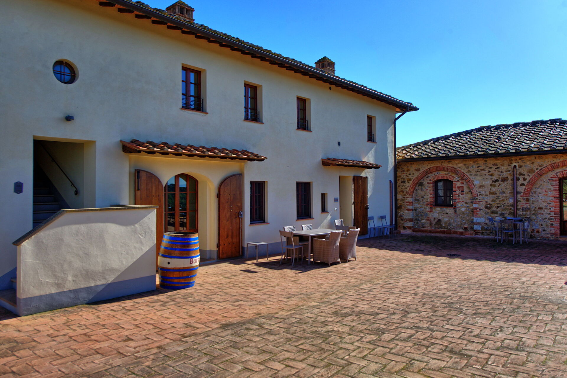 The property is in a beautiful but quiet location surrounded by vineyards and spectacular Tuscan scenery. The apartment was spacious and generally cool inside despite the high temperatures outside. The pool area is superb with extensive paving and plenty of sun-loungers.