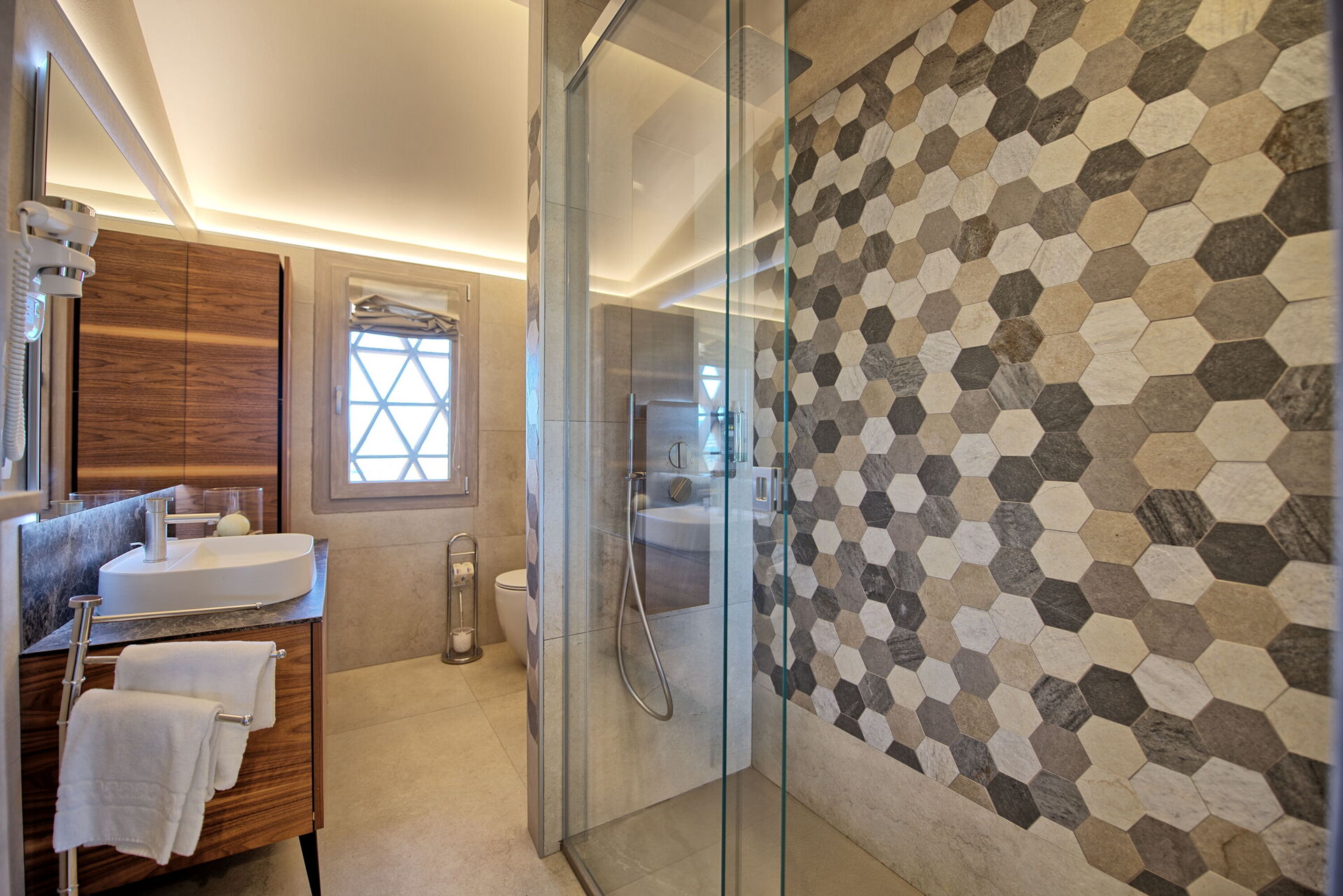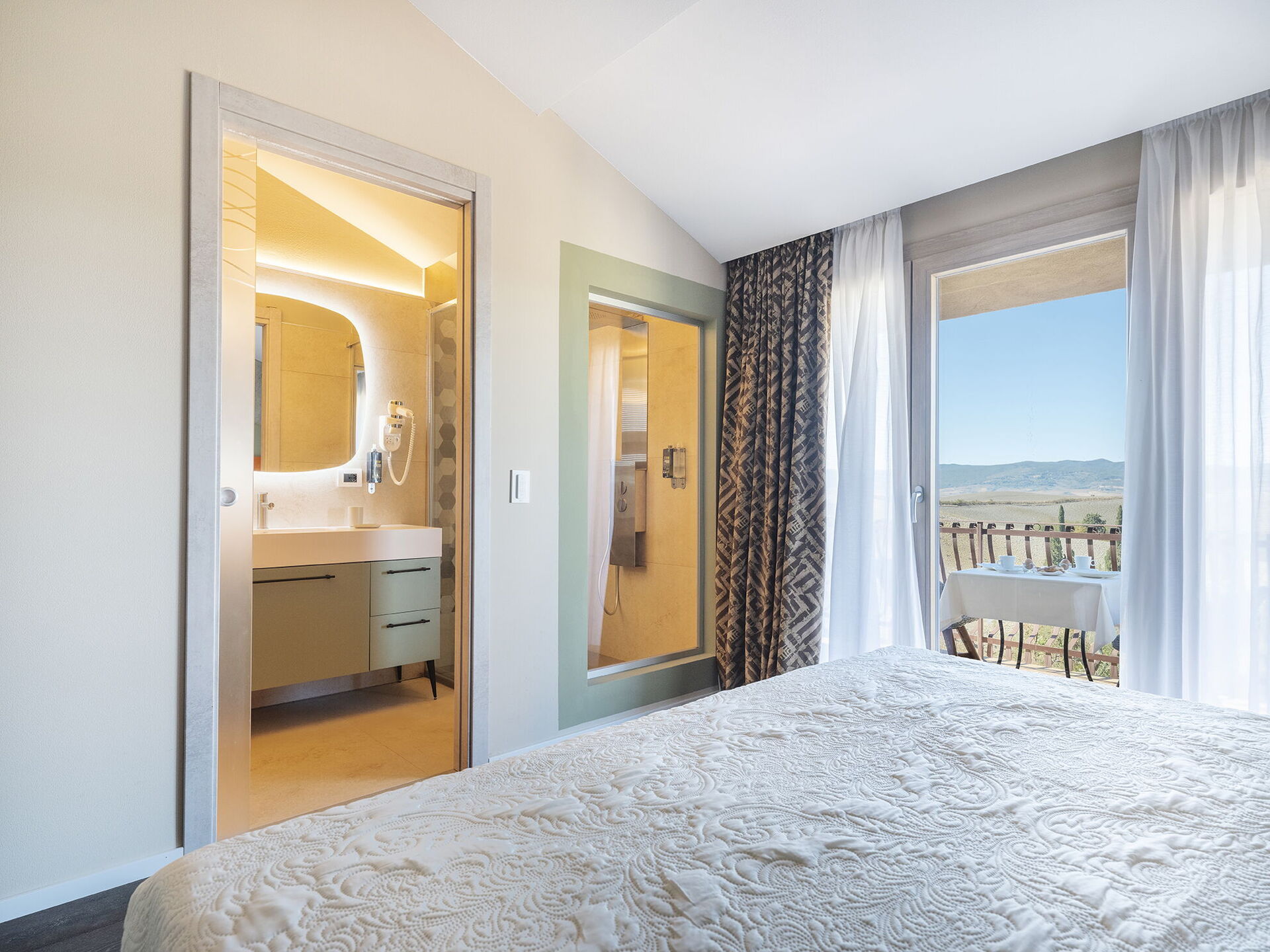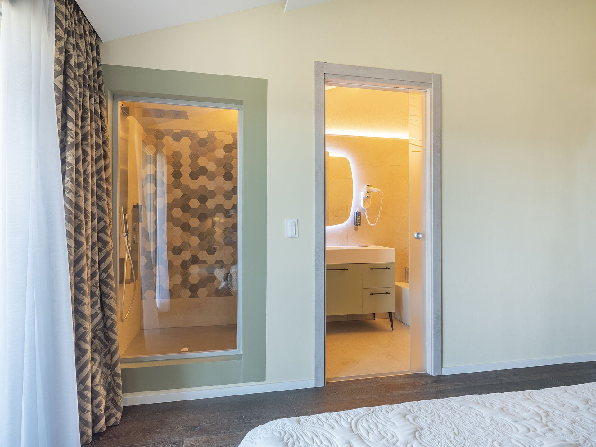 1 double bedroom with bathtub in the room and private bathroom with shower; access to private terrace