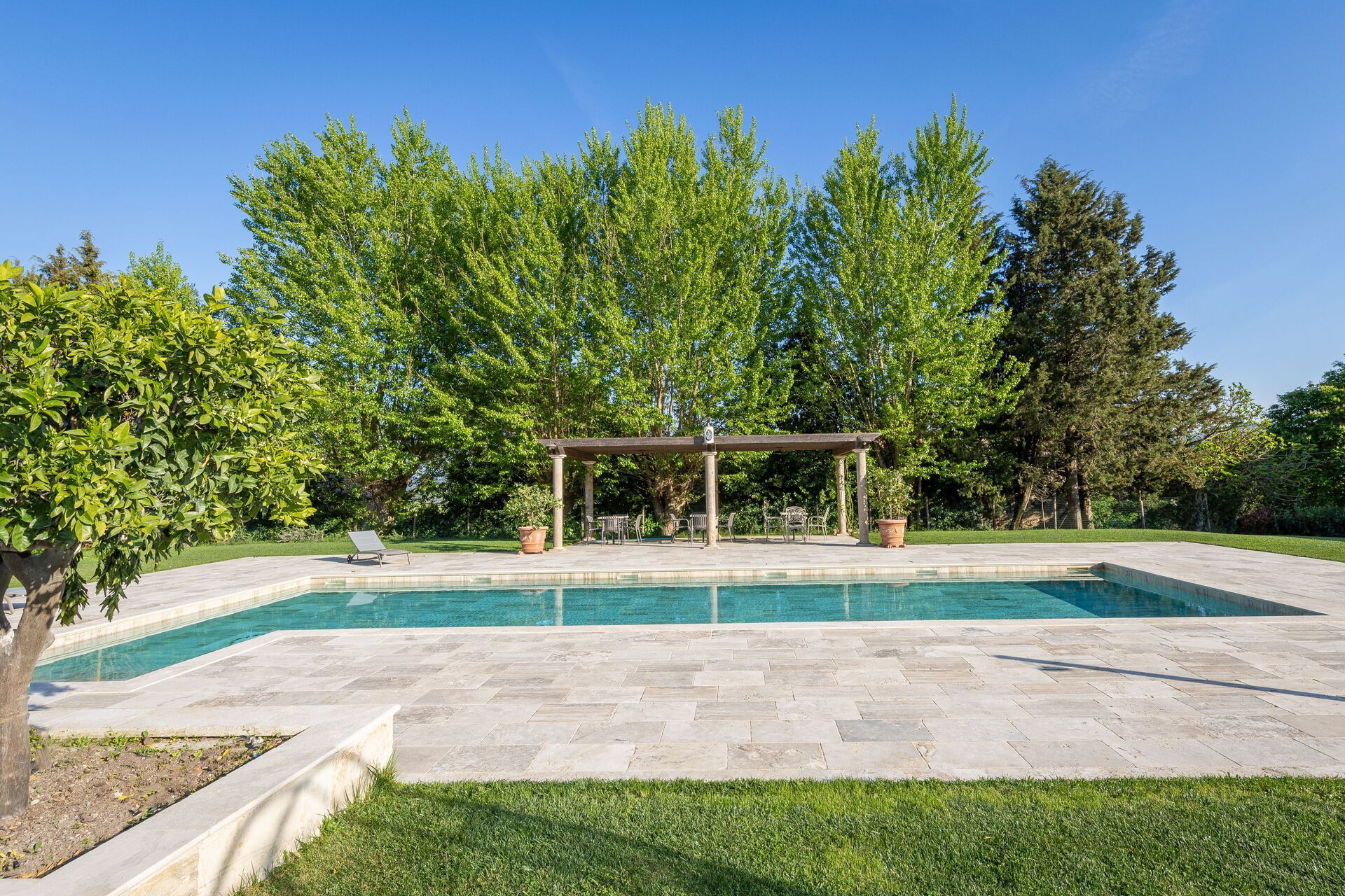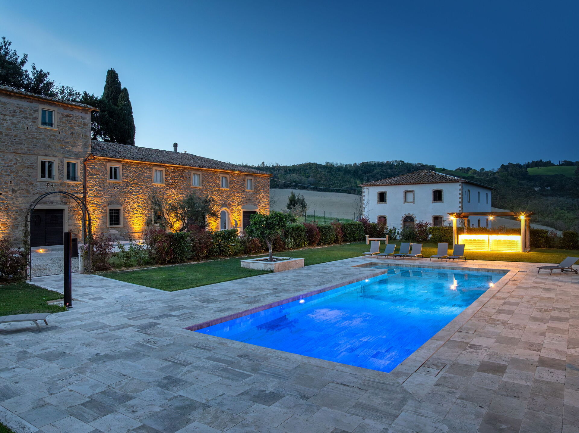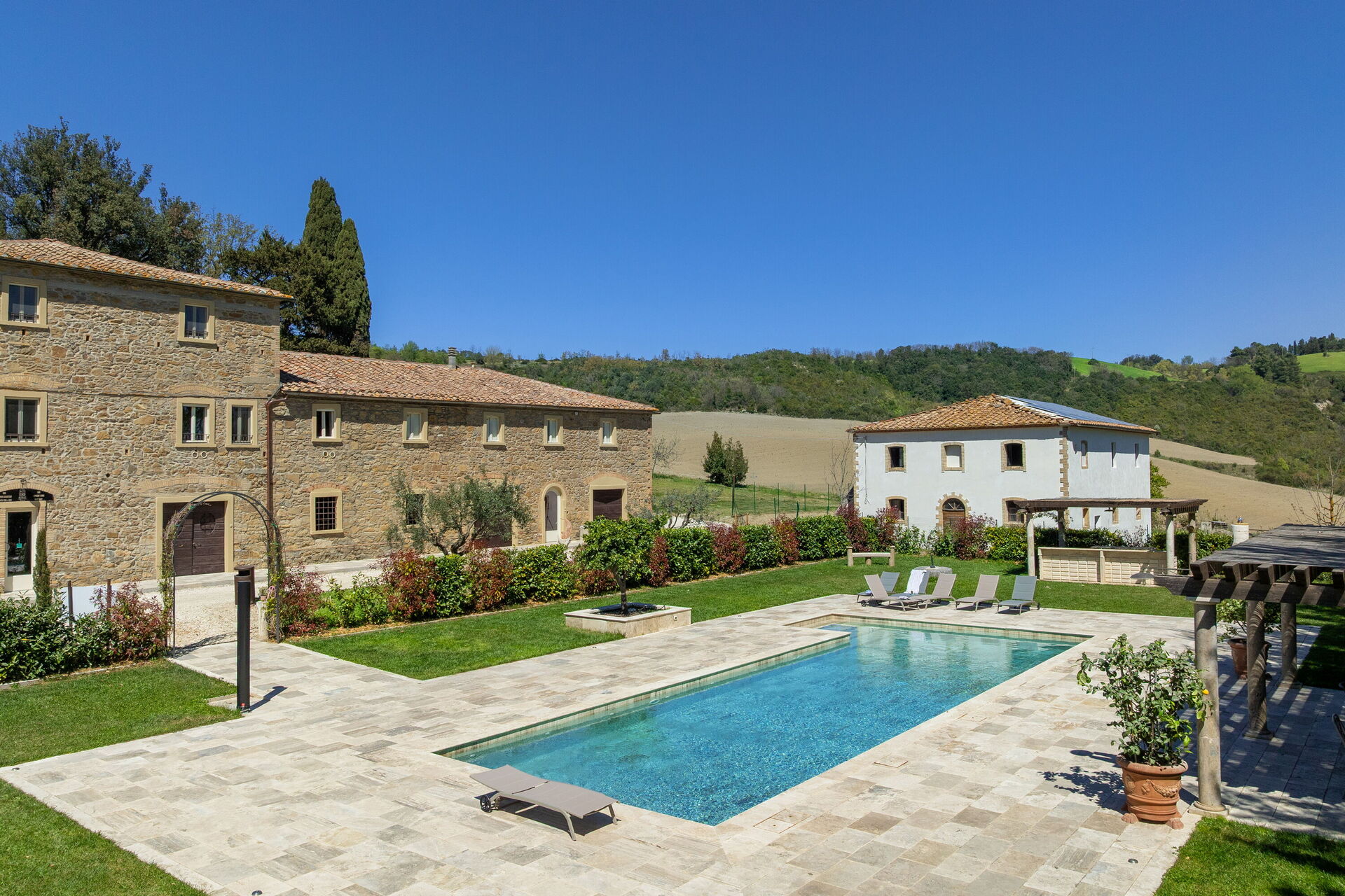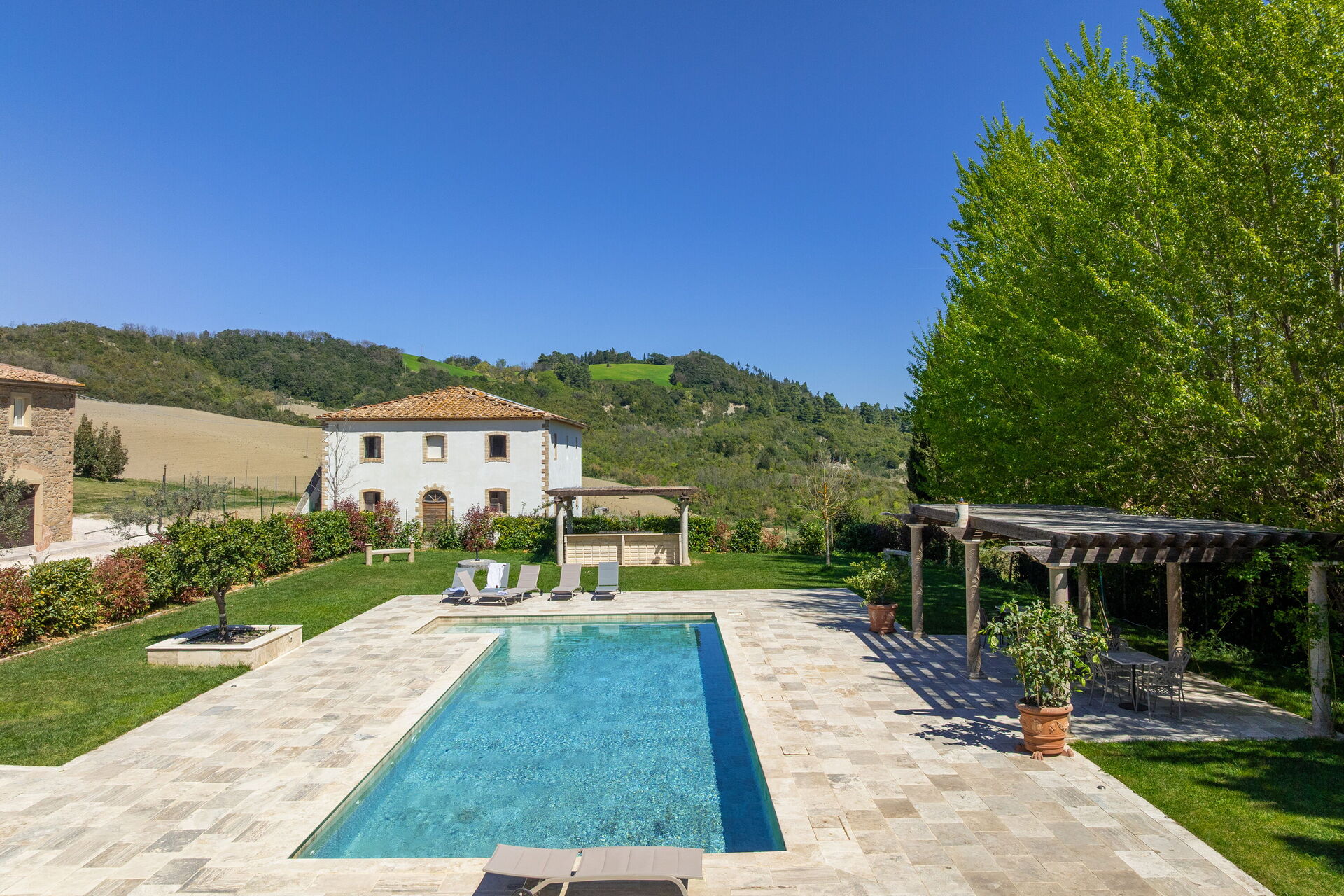 This exclusive retreat is nestled among the rolling hills of the Tuscan countryside, surrounded by olive groves and vineyards. The beautifully maintained garden boasts a lovely swimming pool, shared by guests of the property. The pool is bordered by a travertine sunbathing area, complete with sun loungers and umbrellas — the perfect spot to relax and cool off with family or friends on warm summer days.
