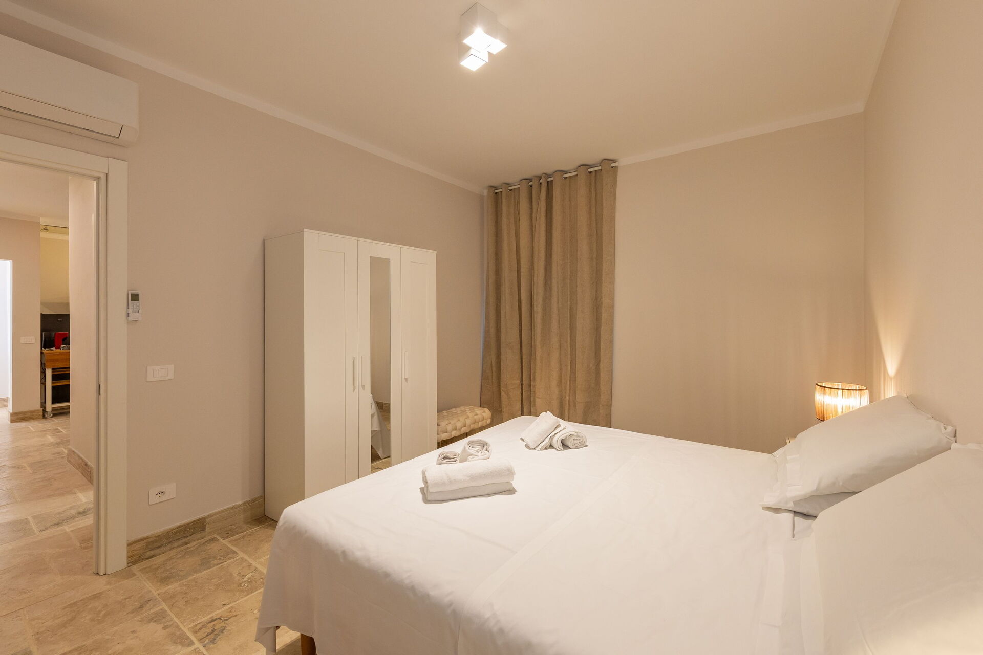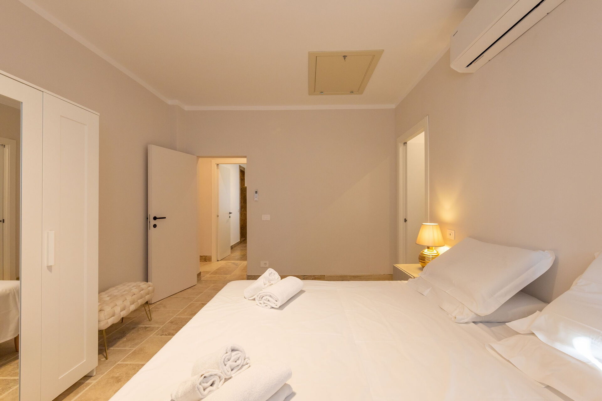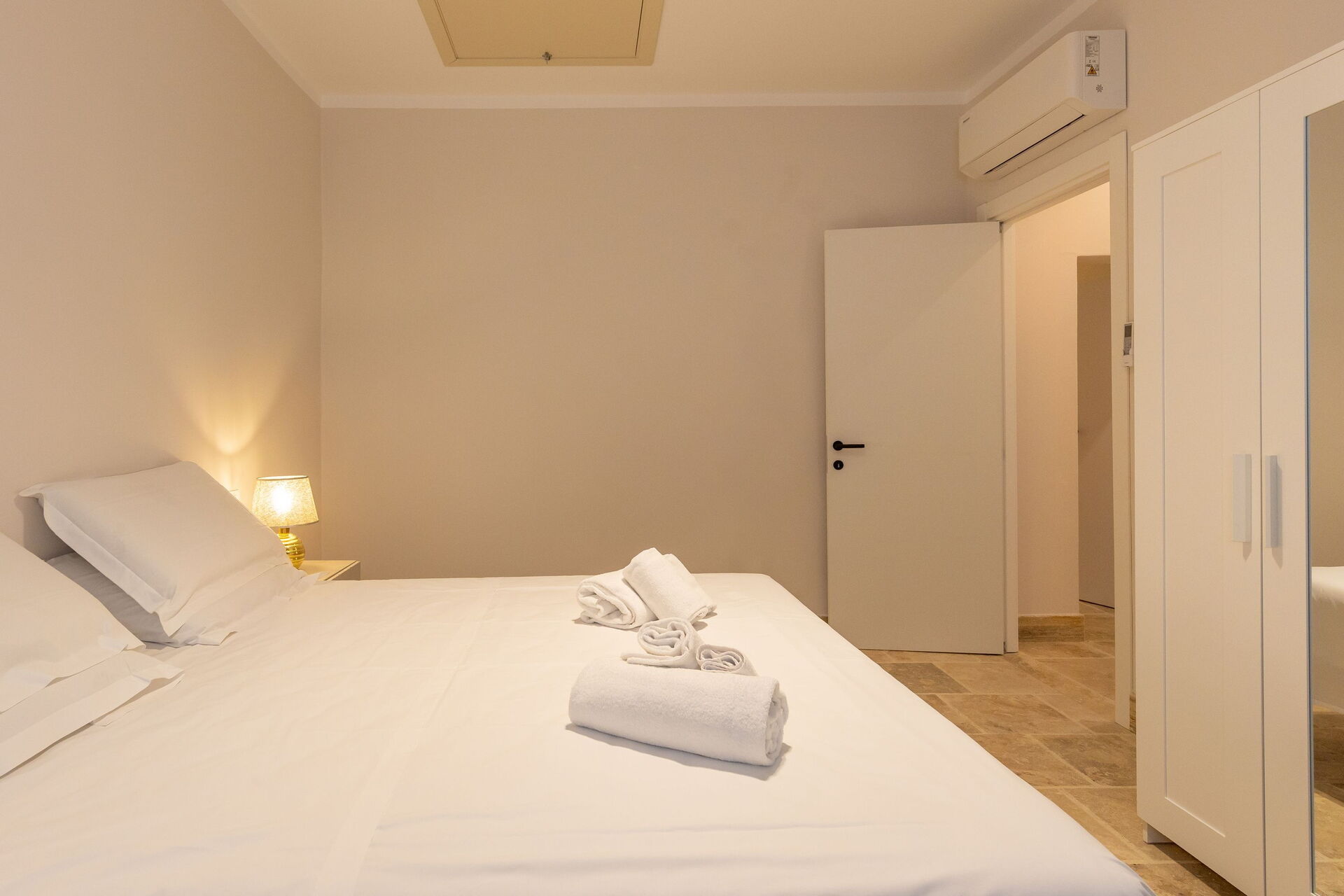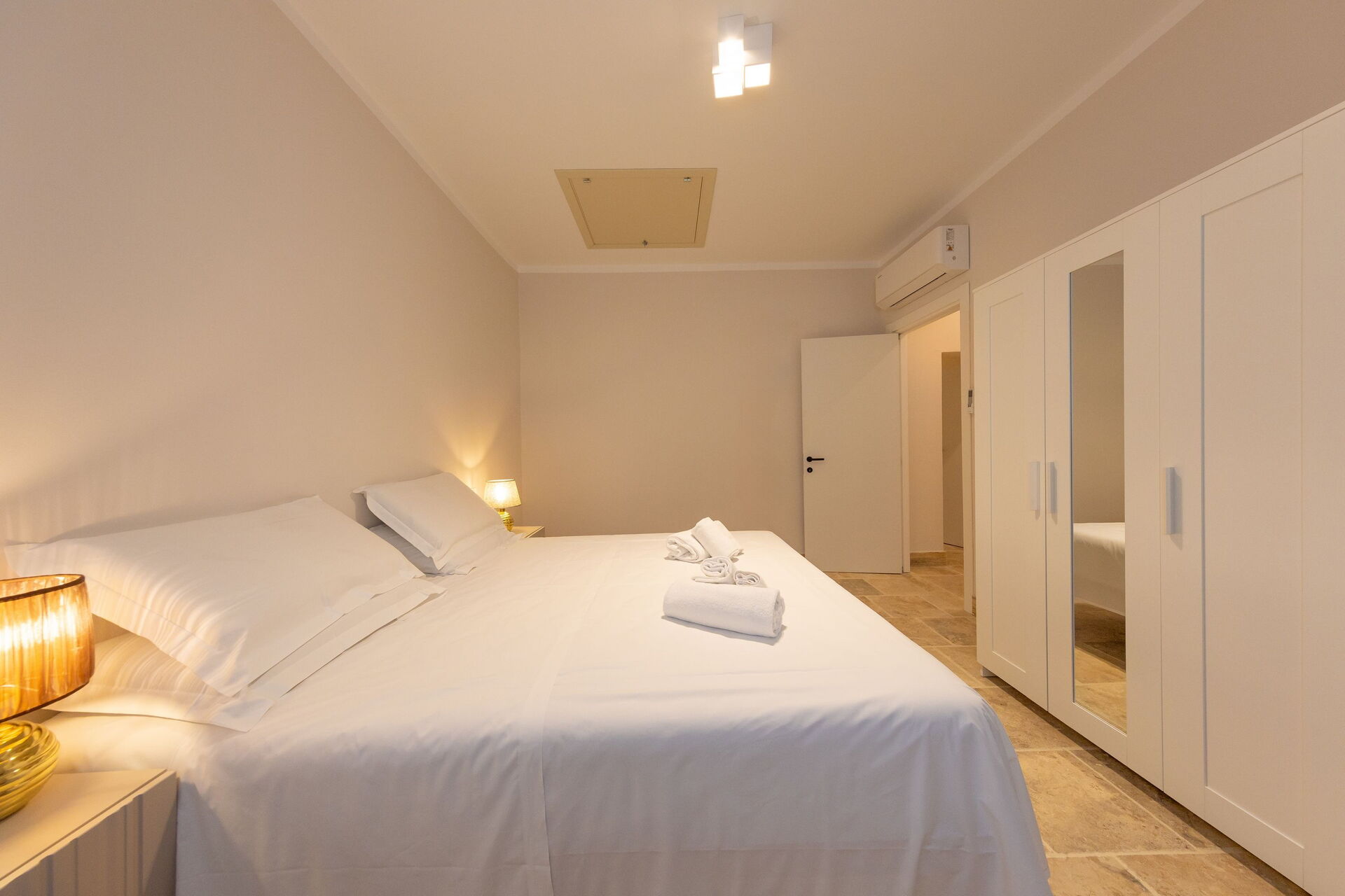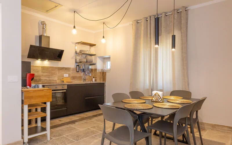 First floor: living room (smart TV and air conditioning) with double sofa bed, dining area ank kitchen corner (dishwasher, oven, refrigerator, espresso coffee maker, toaster), 2 double bedrooms (air conditioning), 2 bathrooms with shower.