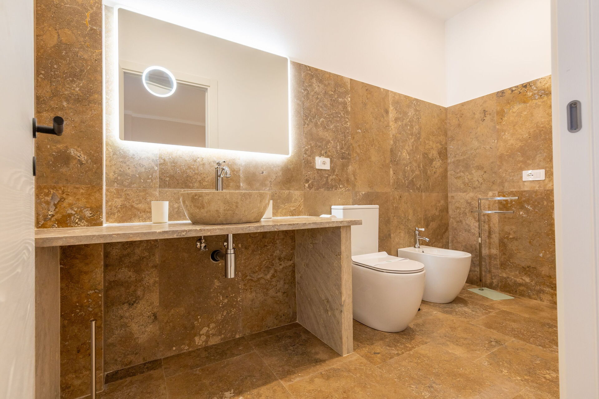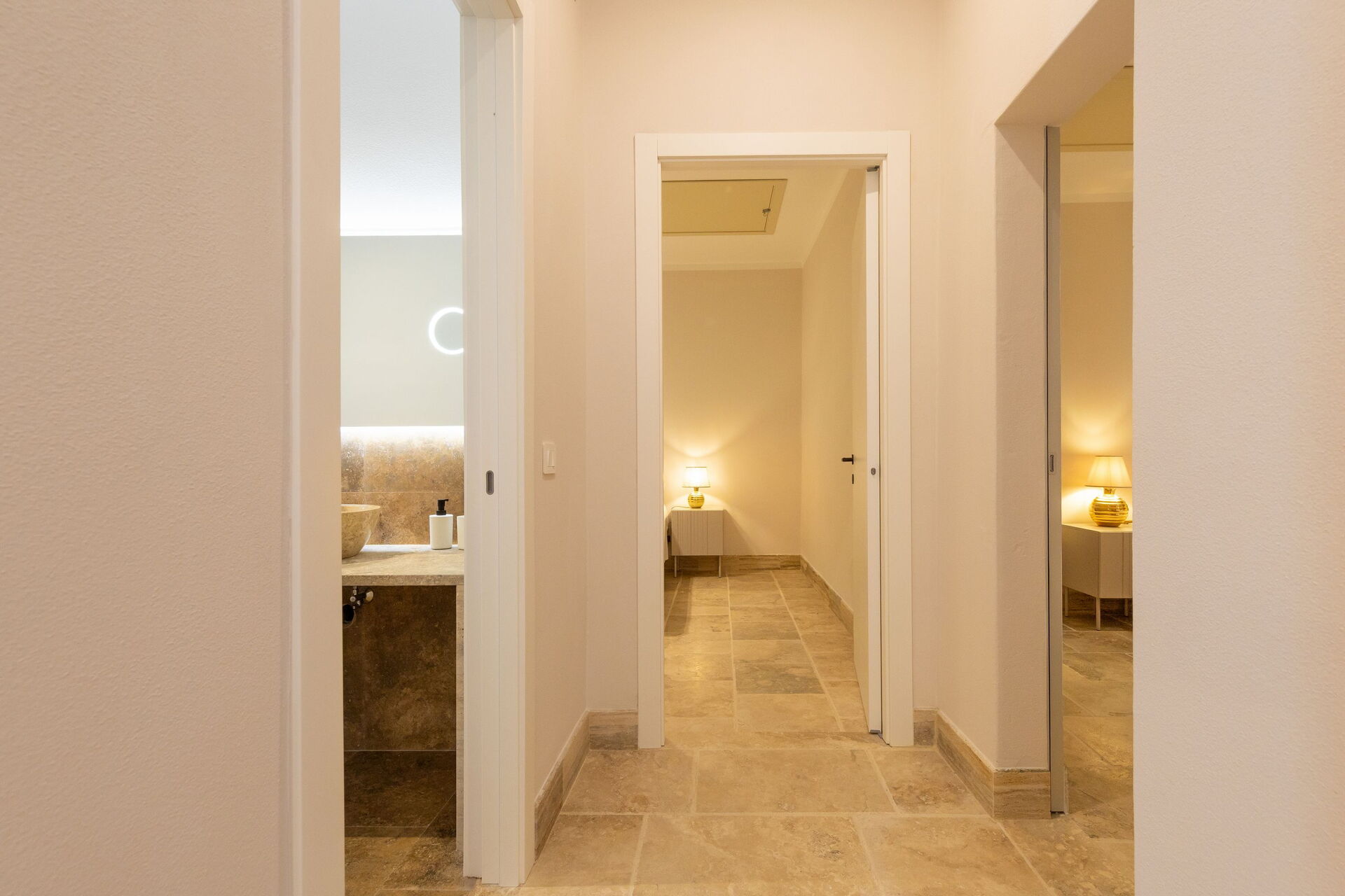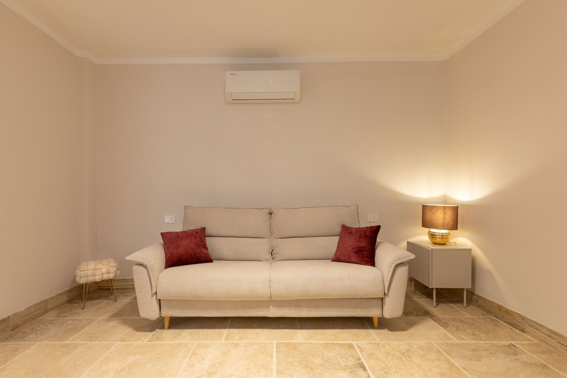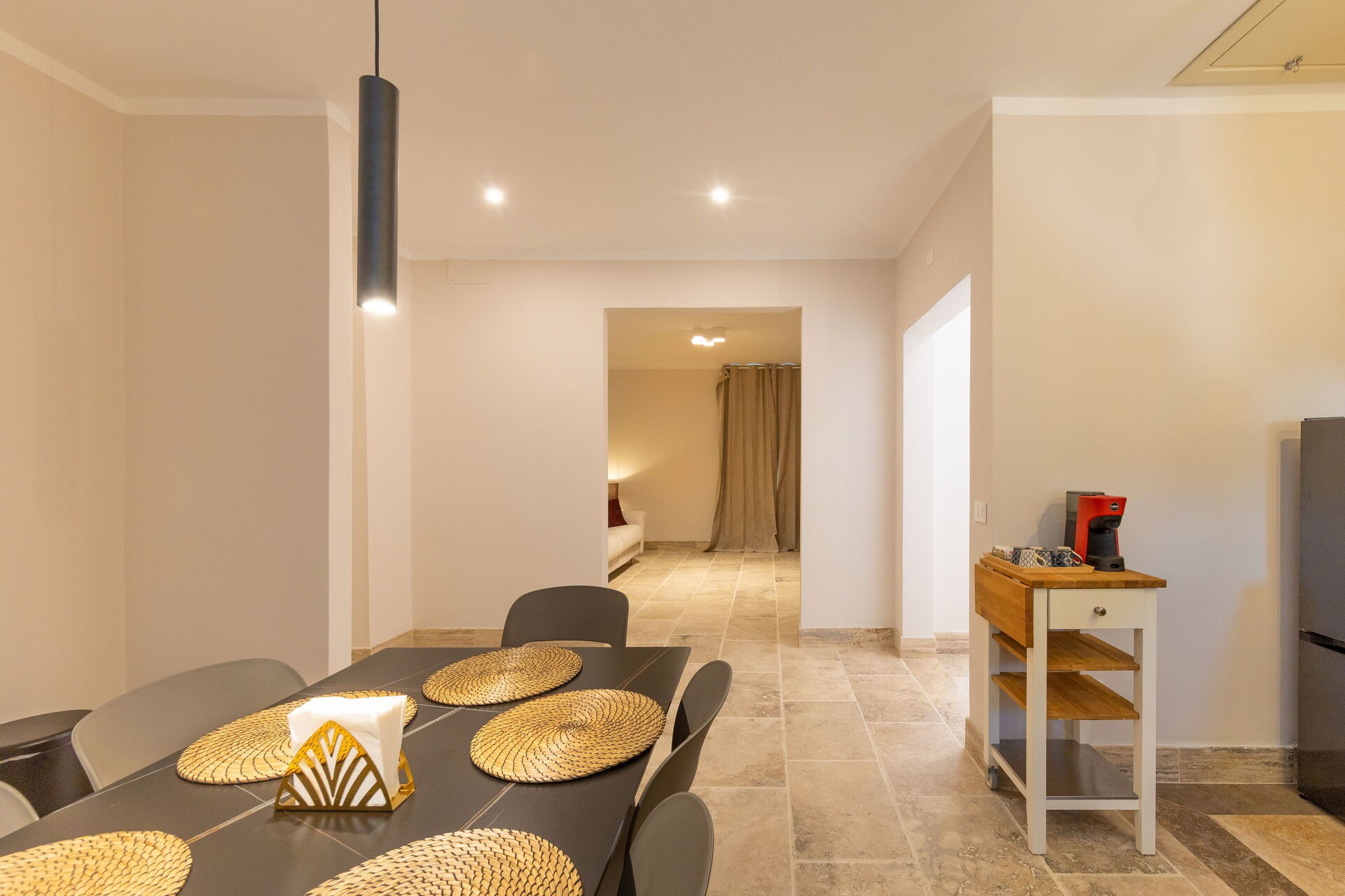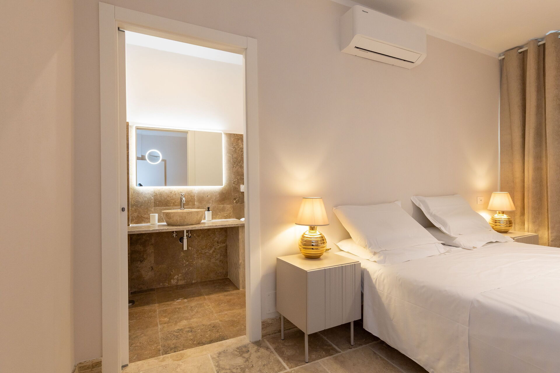 First floor: living room (smart TV and air conditioning) with double sofa bed, dining area ank kitchen corner (dishwasher, oven, refrigerator, espresso coffee maker, toaster), 2 double bedrooms (air conditioning), 2 bathrooms with shower.