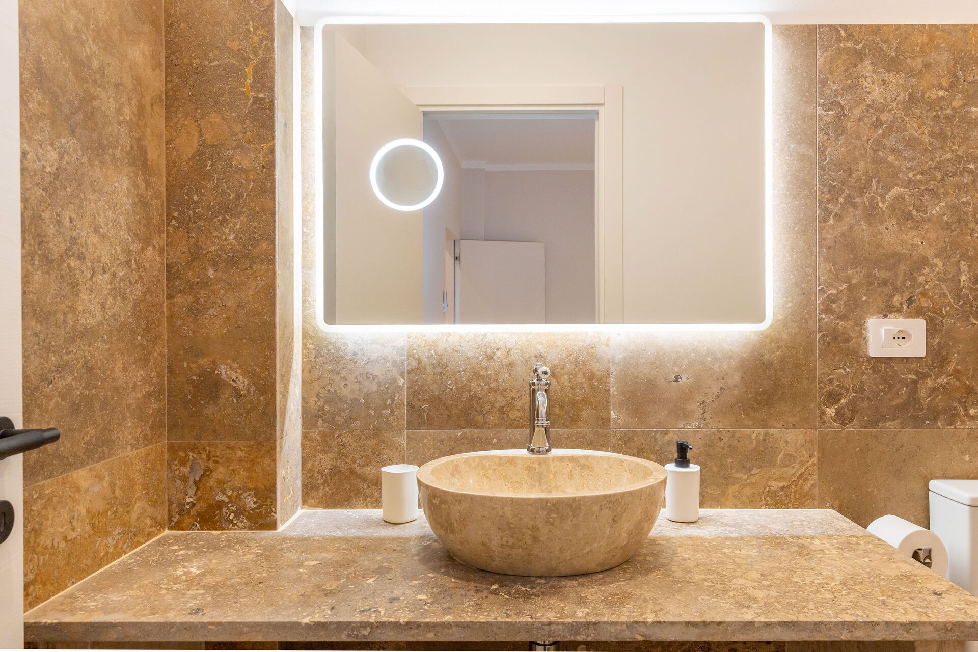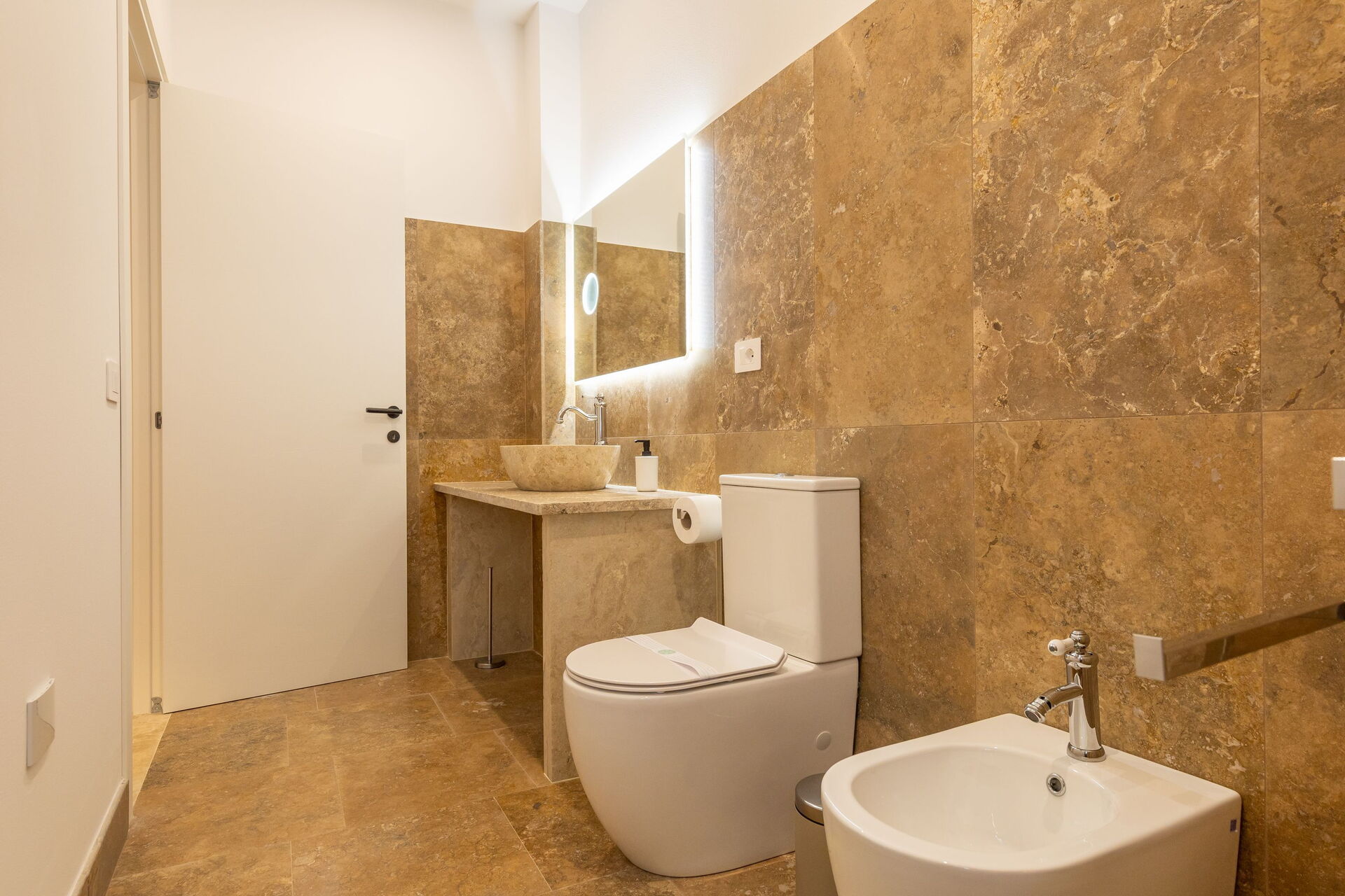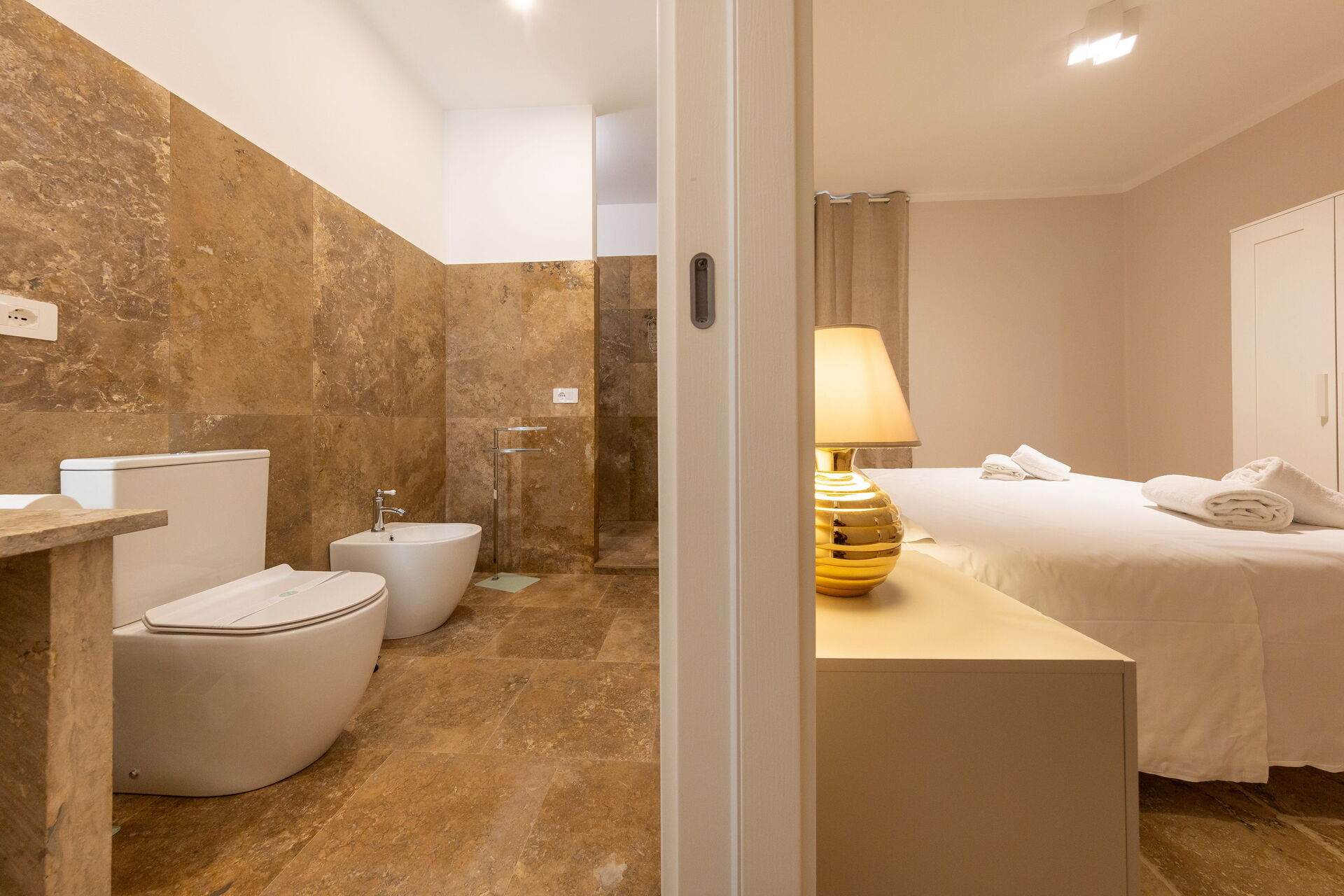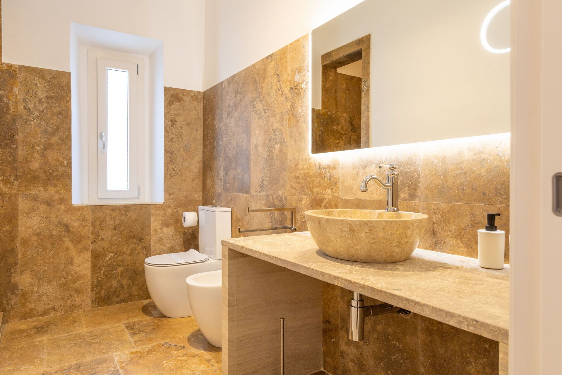 First floor: living room (smart TV and air conditioning) with double sofa bed, dining area ank kitchen corner (dishwasher, oven, refrigerator, espresso coffee maker, toaster), 2 double bedrooms (air conditioning), 2 bathrooms with shower.