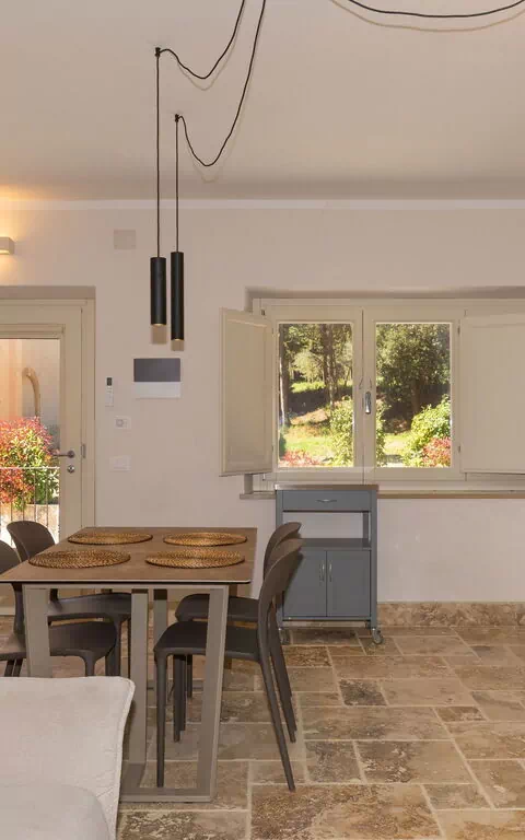 Raised ground floor: living room (smart TV, air conditioning) with double sofa bed, dining area and kitchenette (dishwasher, oven, refrigerator, espresso coffee maker, toaster), double bedroom (air conditioning), bathroom with shower.