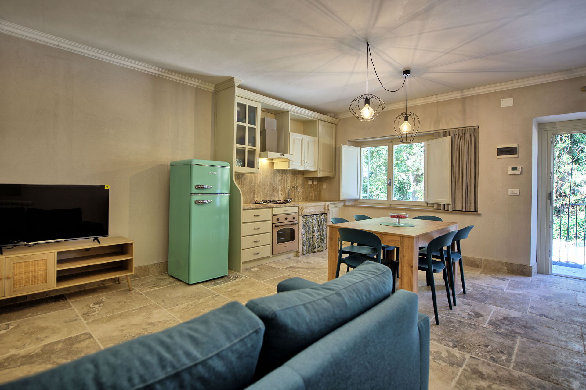 Raised ground floor: living room (smart TV, air conditioning) with double sofa bed, dining area and kitchenette (dishwasher, oven, refrigerator, espresso coffee maker, toaster), double bedroom (air conditioning), bathroom with shower.