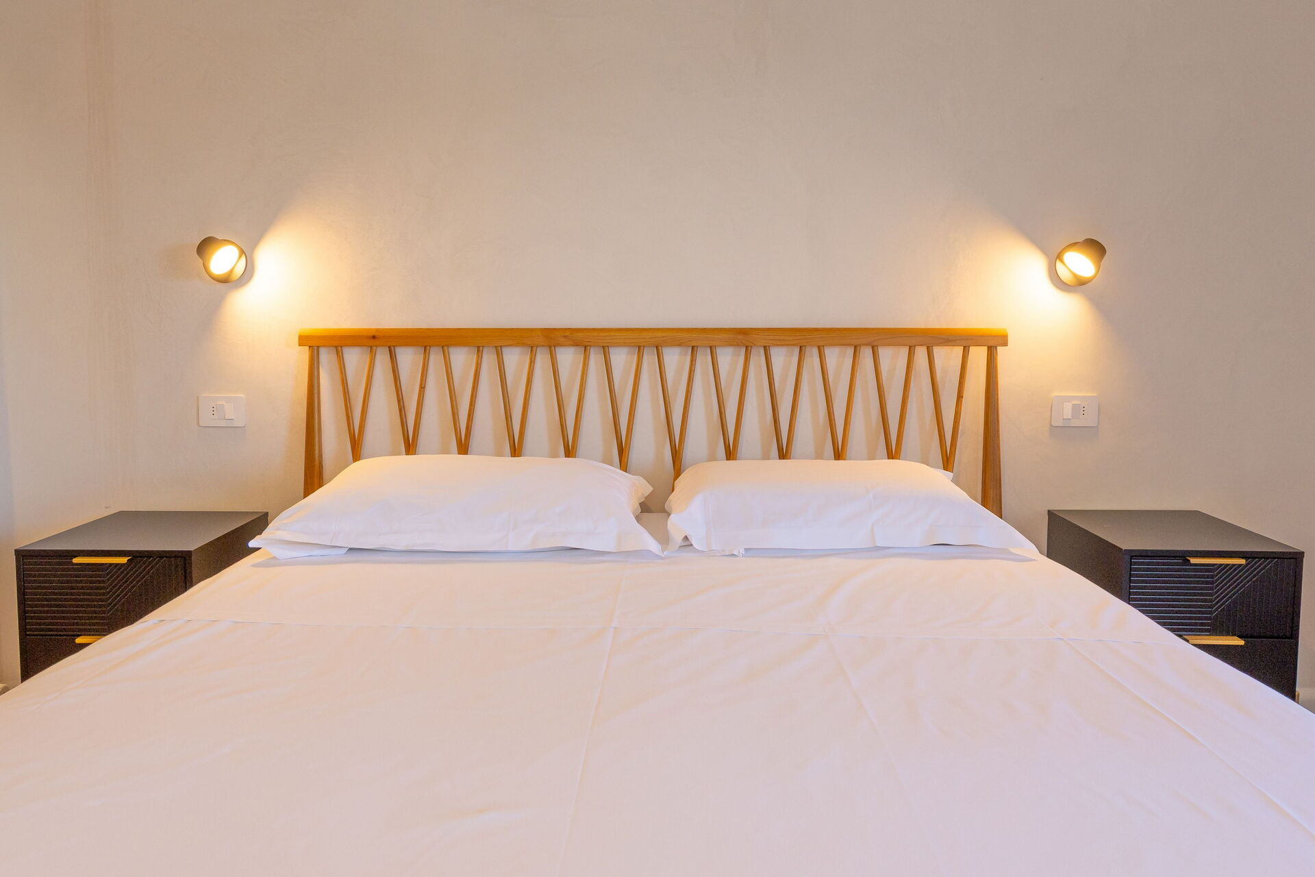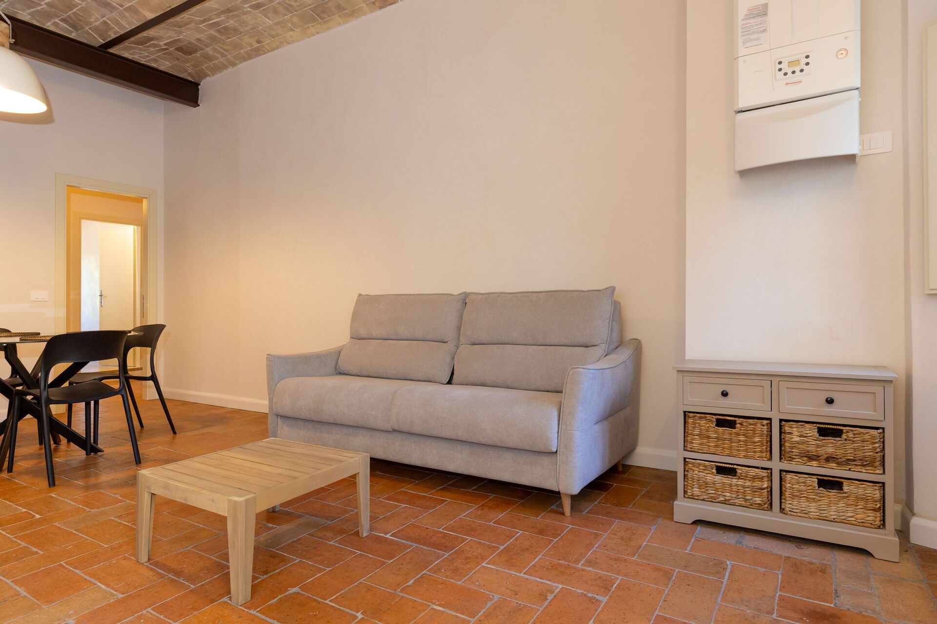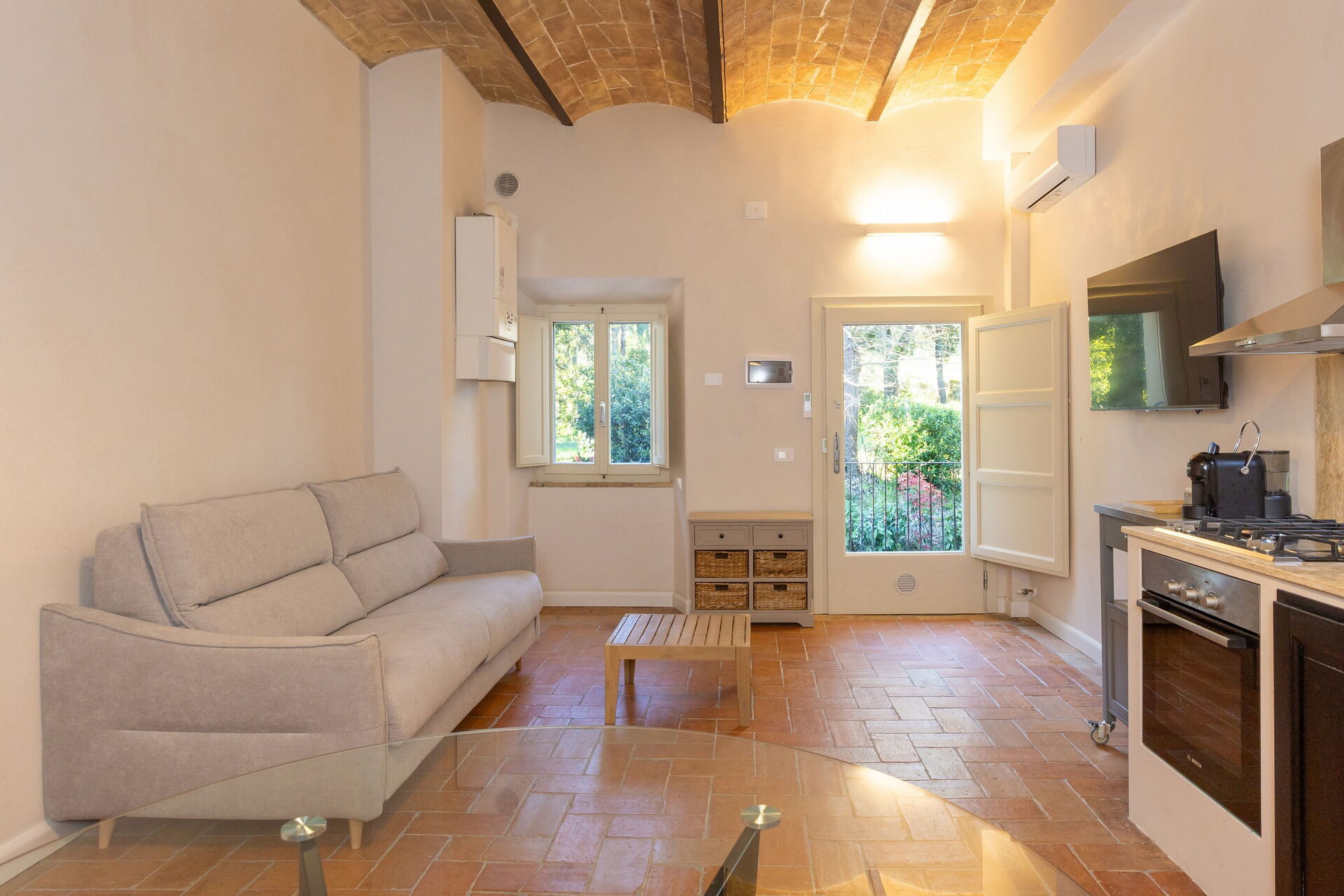 Raised ground floor: living room (smart TV, air conditioning) with double sofa bed, dining area and kitchenette (dishwasher, oven, refrigerator, espresso coffee maker, toaster), double bedroom (air conditioning), bathroom with shower.