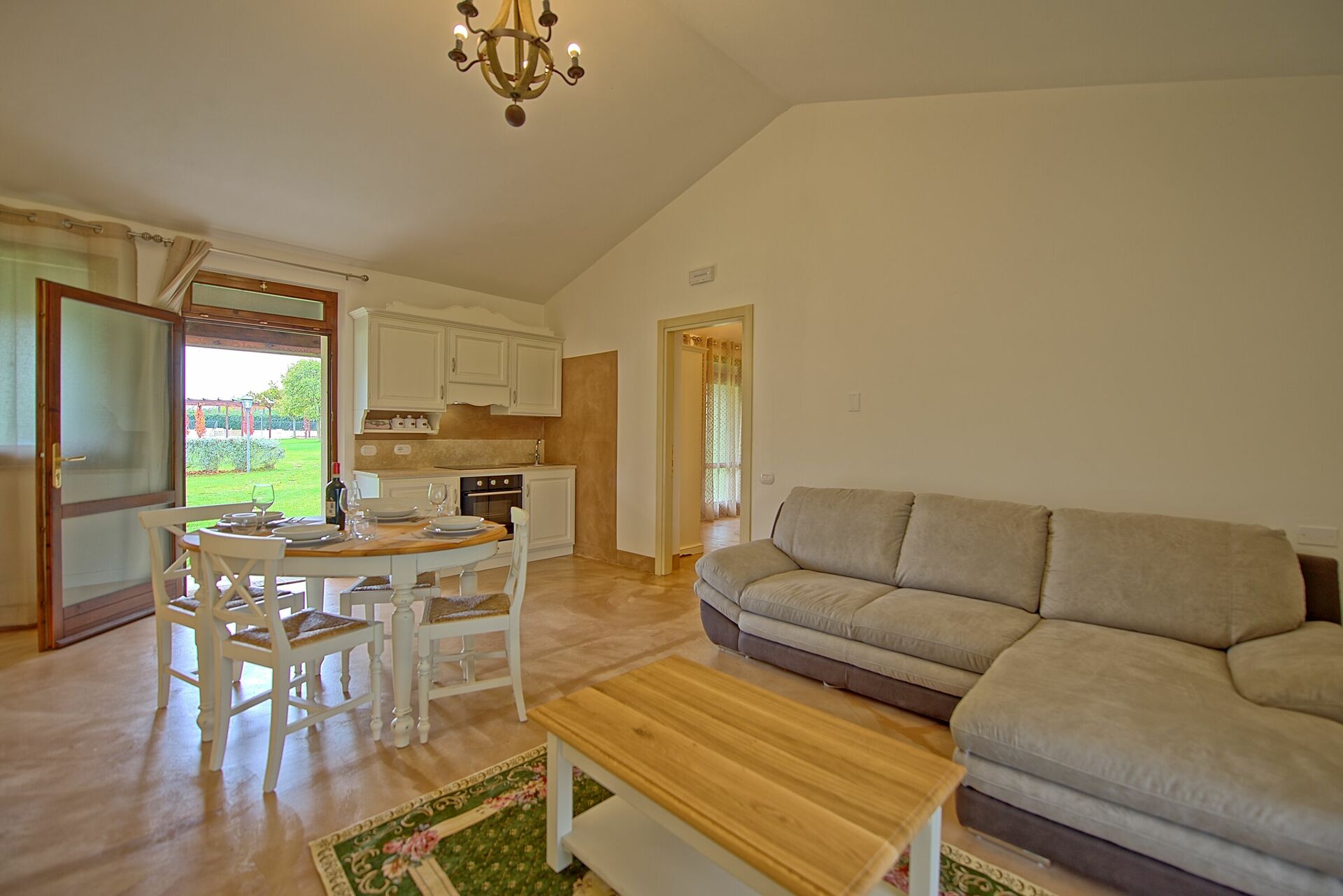 Ground floor: living area with double sofa bed and kitchen corner; suite with double bed and whirlpool tub in the bedroom, bathroom with shower equipped with steam bath and chromotherapy.