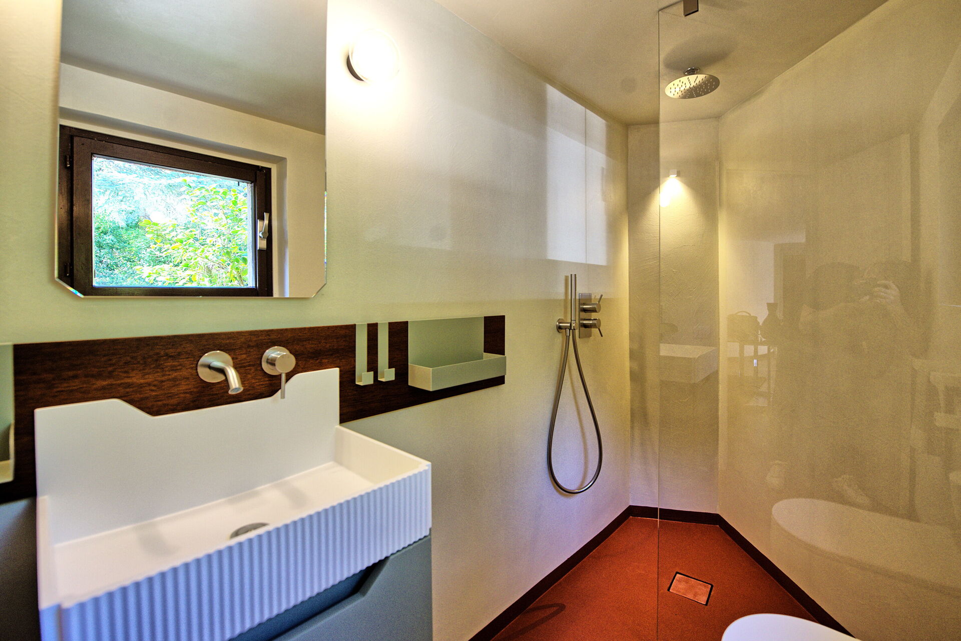 An additional double bedroom (high window) with bathroom with shower is 50 m away under the pool level.