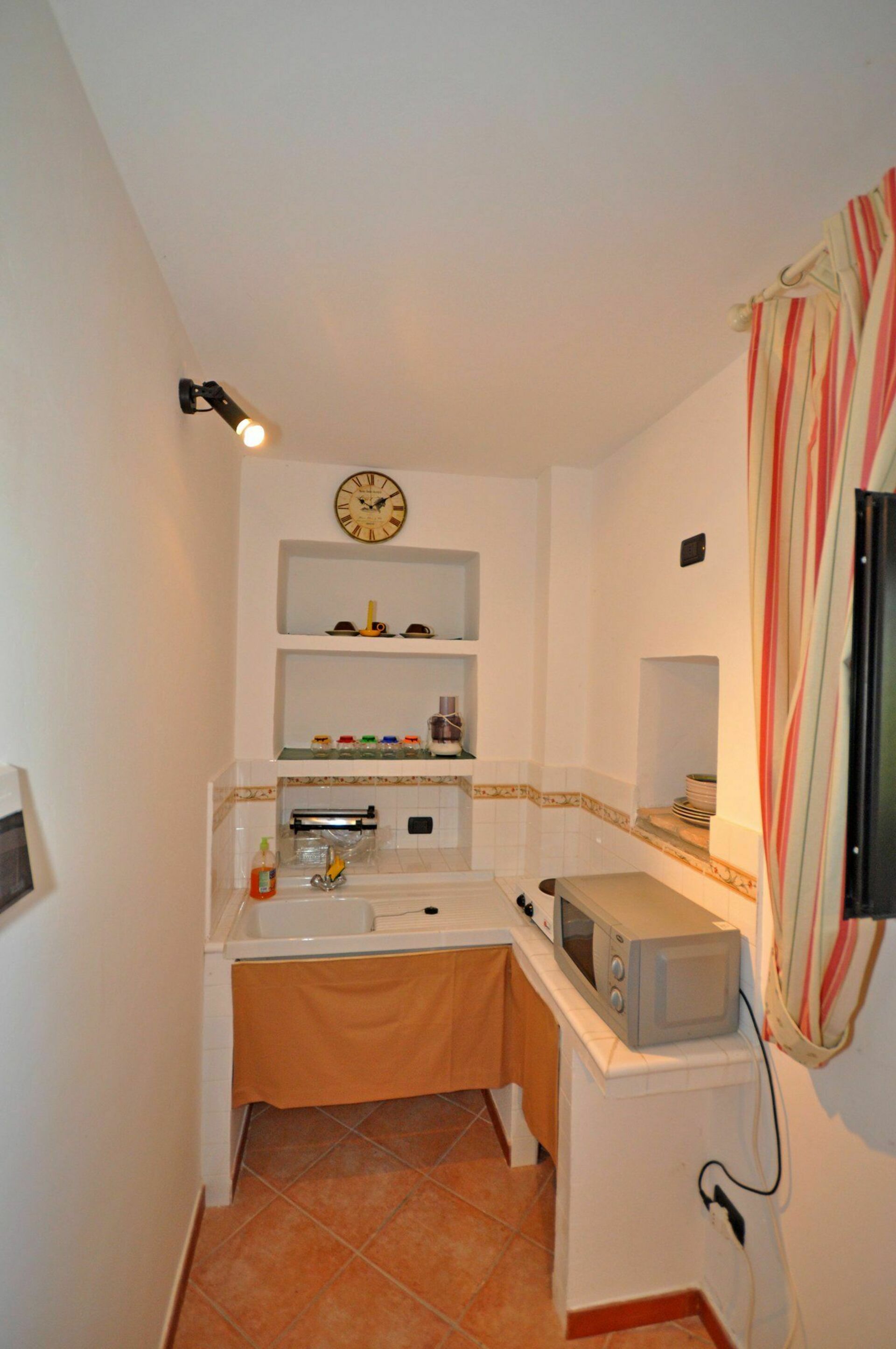 Ground floor: living-room (TV) with 2 single beds, bathroom with shower, double bedroom, kitchen corner (2 electric hot plates, microwaves).
