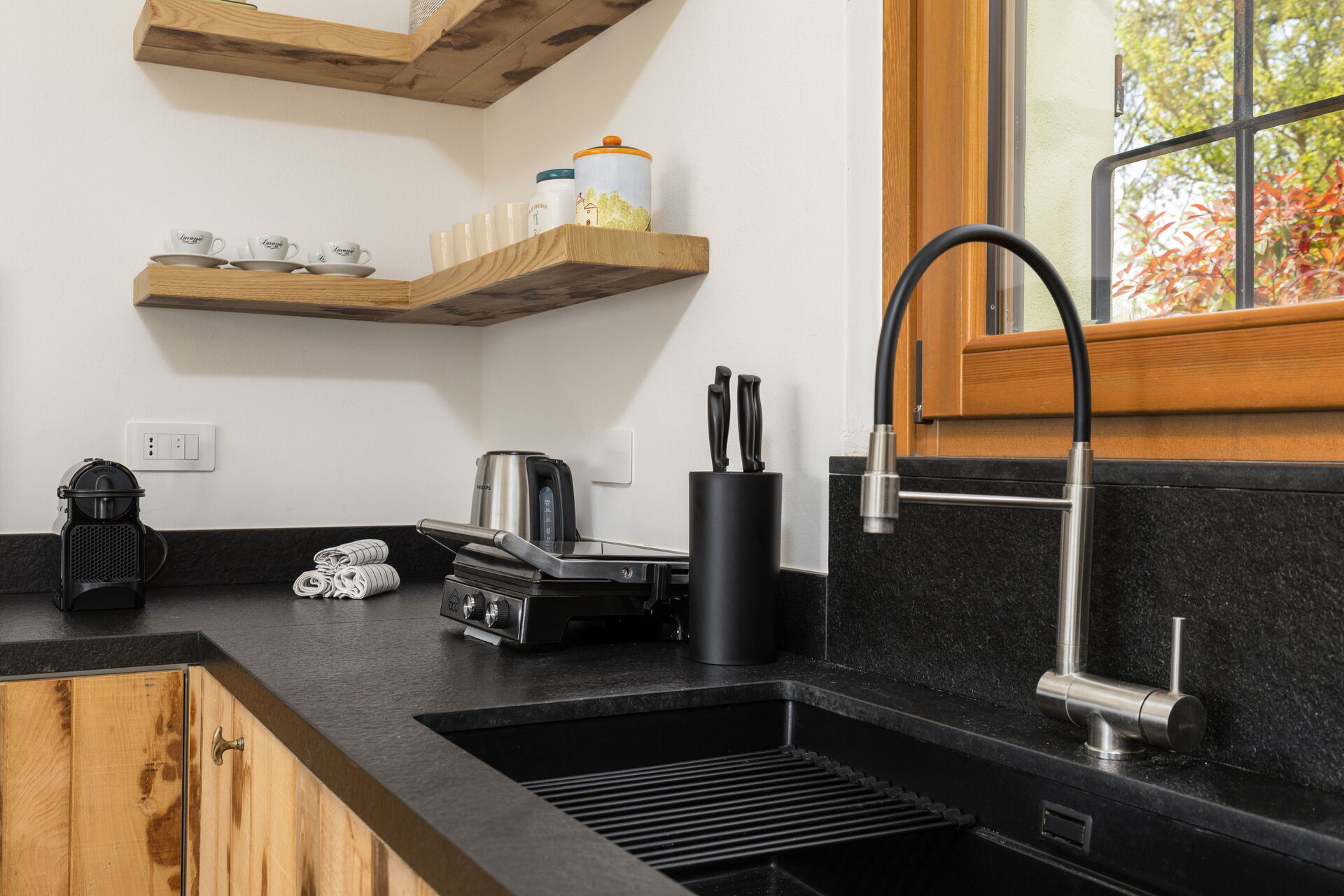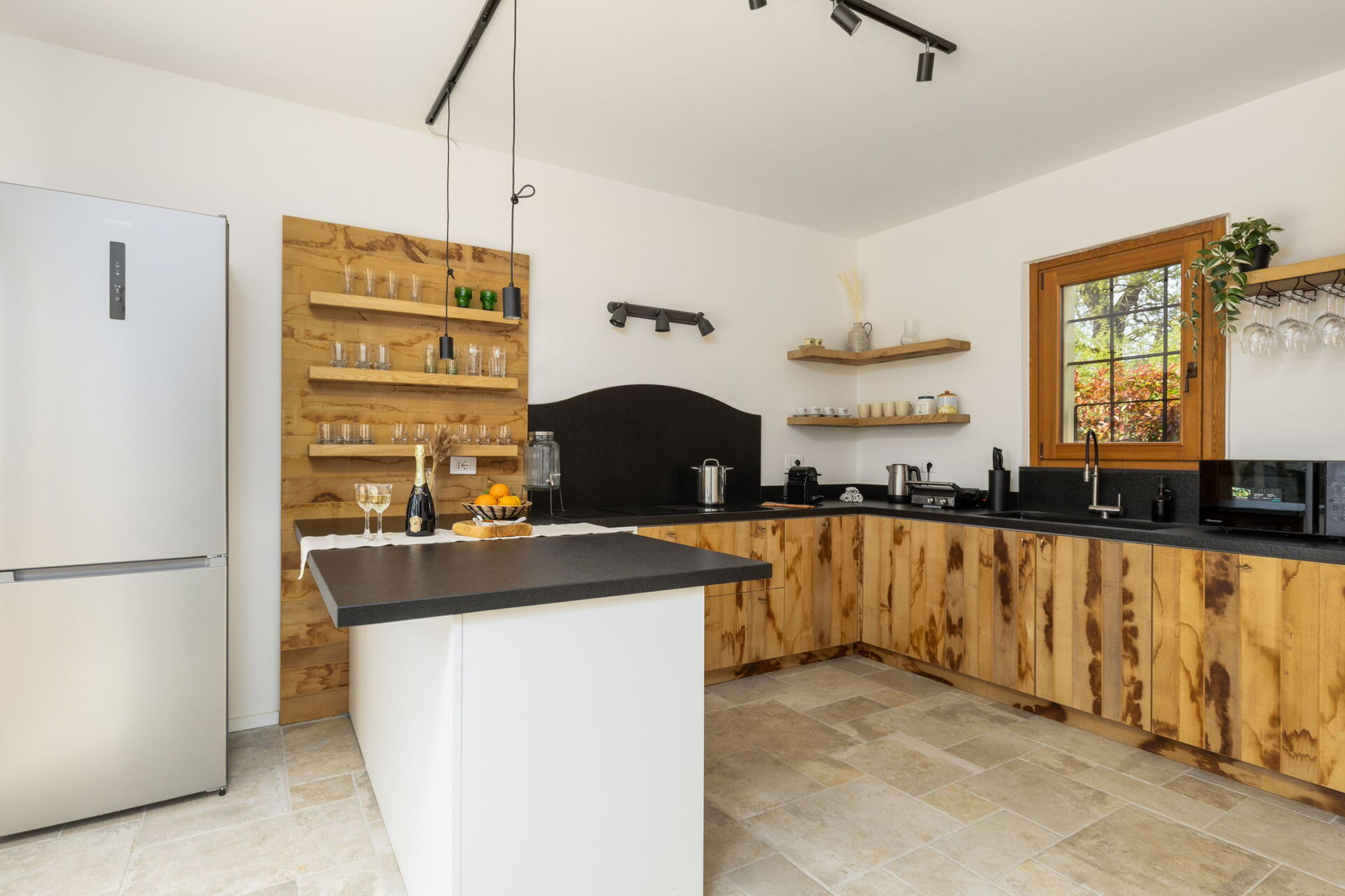 Ground floor: entrance and large living area (piano) and kitchen (oven, freezer, microwave, Nespresso coffee maker, toaster, electric kettle, washing machine), double bedroom, bathroom with shower.