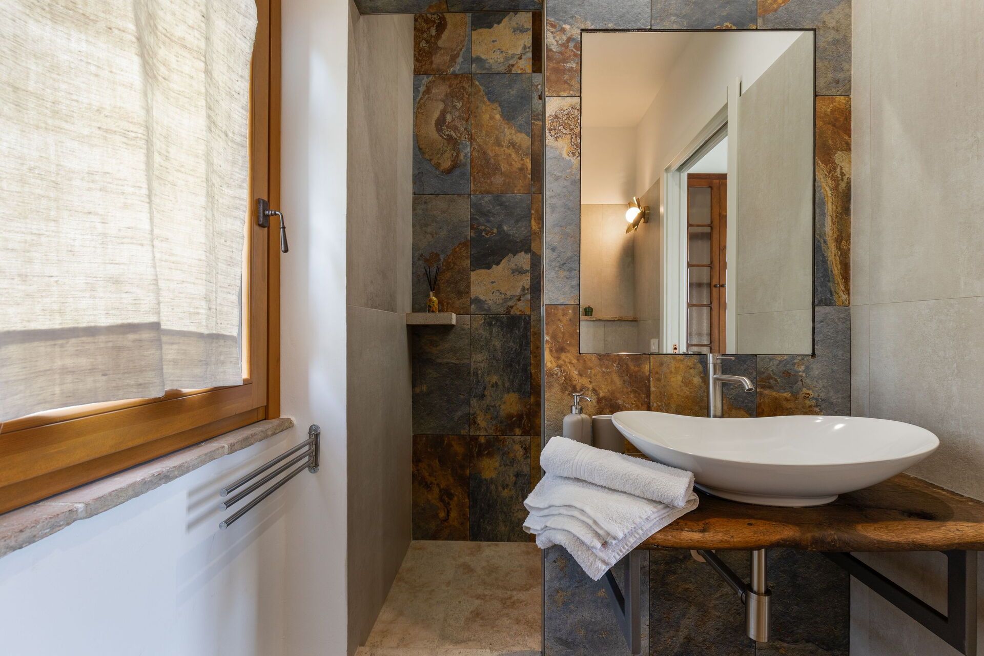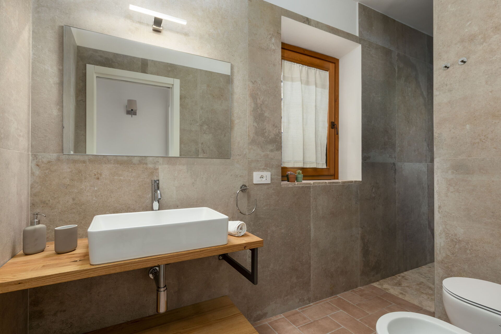 First floor: living room with smart TV, double bedroom, bathroom with shower, bedroom with double bed + single bed, private bathroom with shower and access to a private scenic terrace.