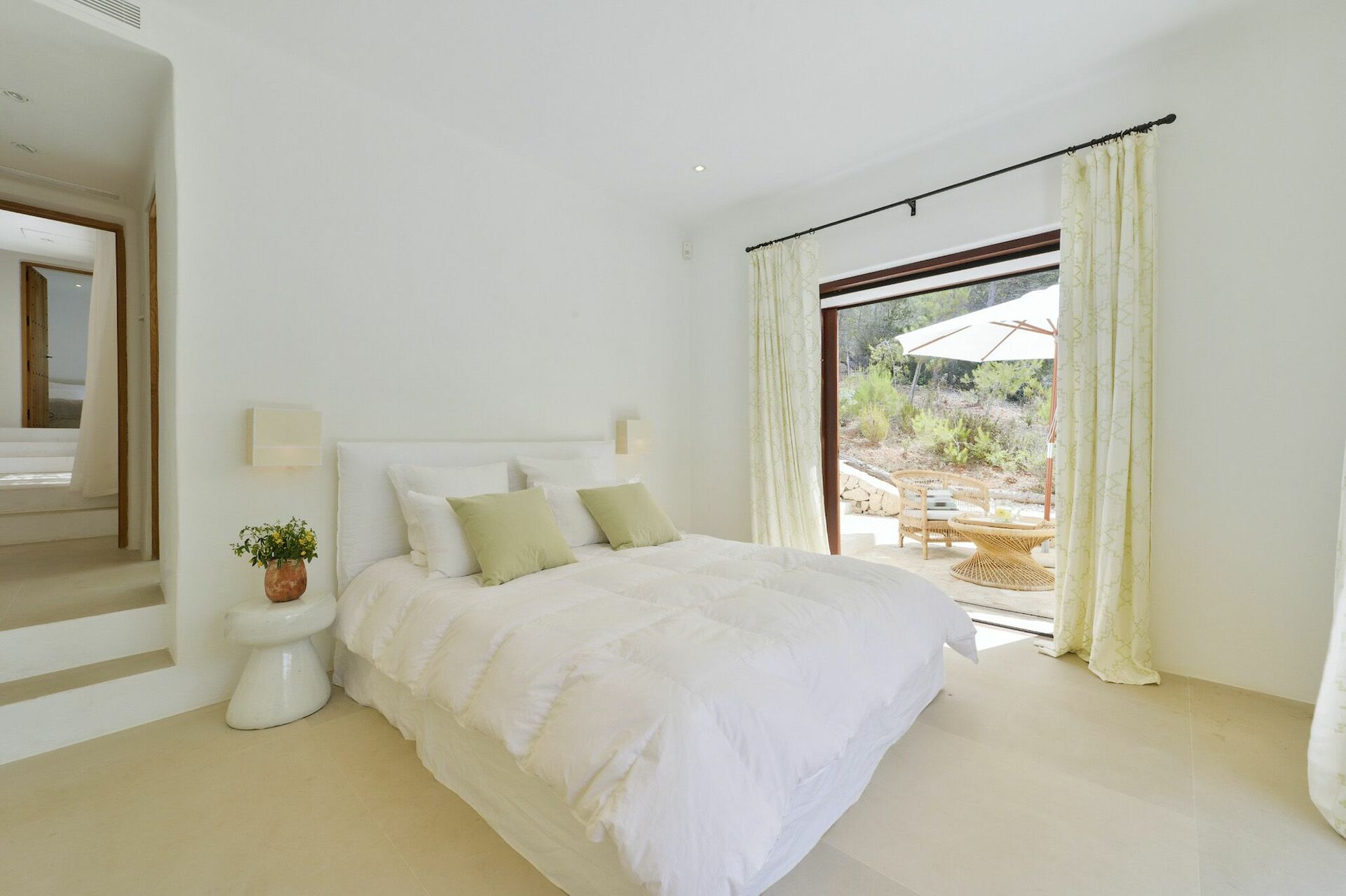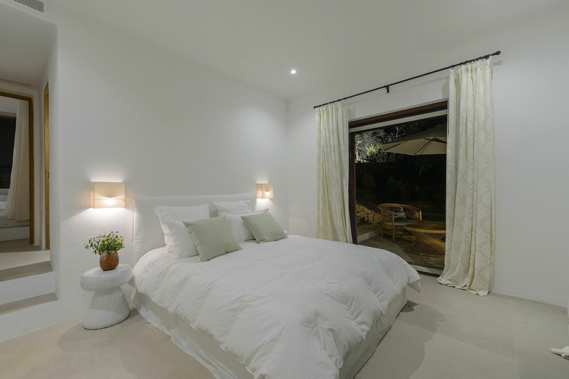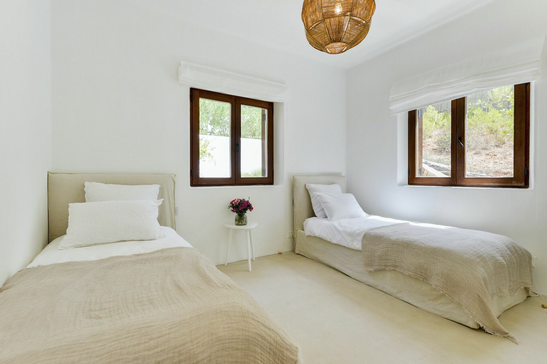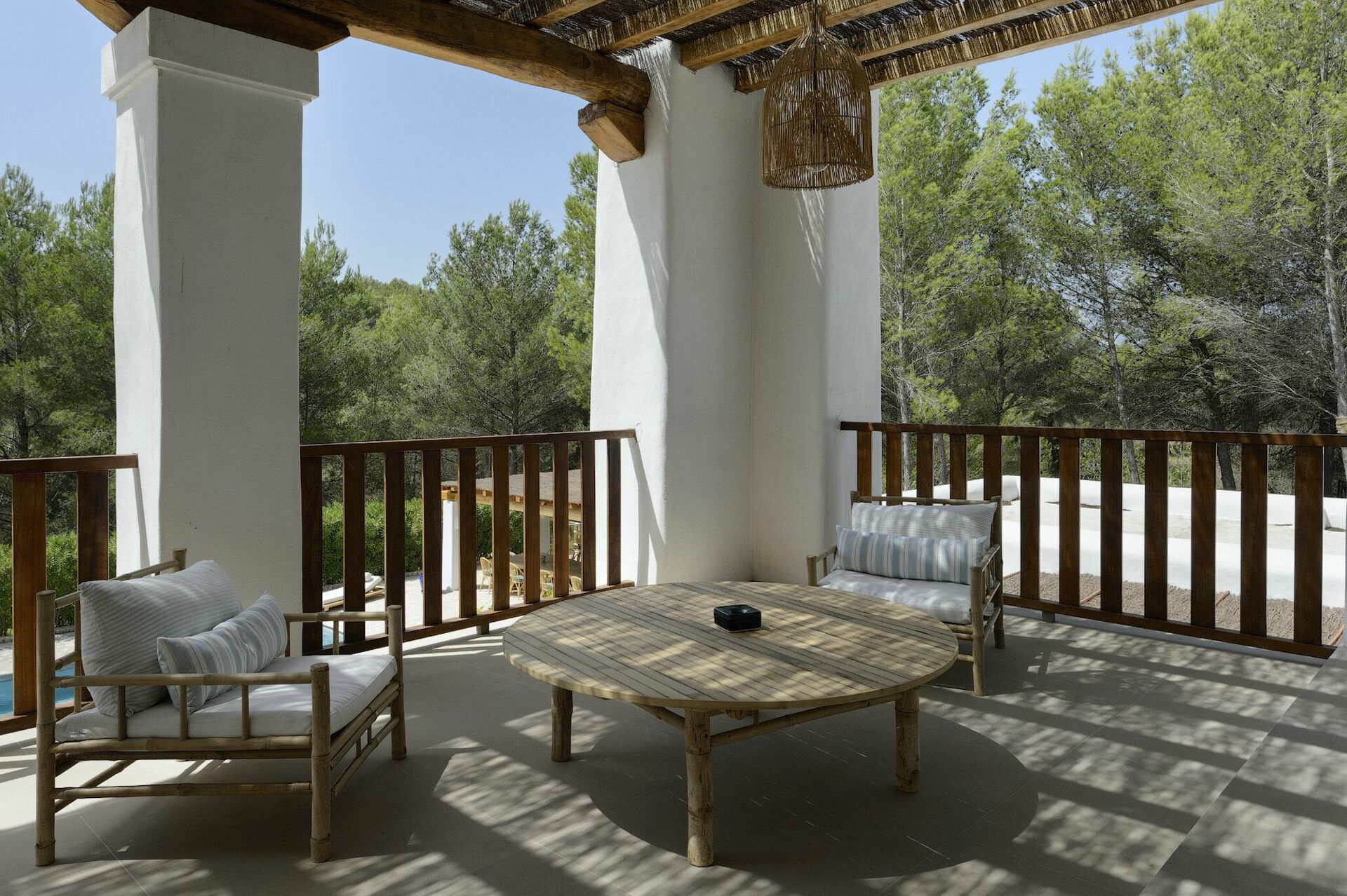 Inside, the villa spans two floors and can accommodate up to 10 people in 5 bedrooms, each with its own private bathroom, large wardrobe and air conditioning. The common areas are tastefully furnished in characteristic Ibiza style, and equipped with the finest amenities to guarantee the utmost luxury and comfort. There is a fitness area, cinema room, and kitchen fully equipped with the most modern appliances.