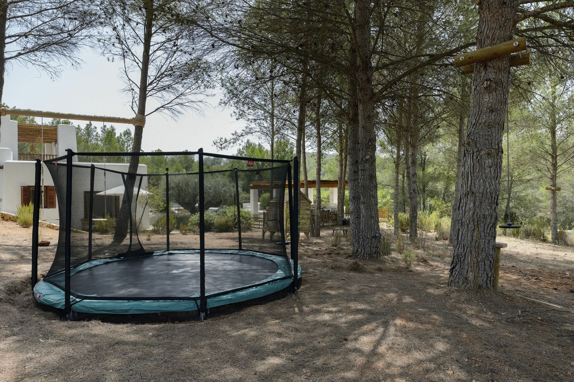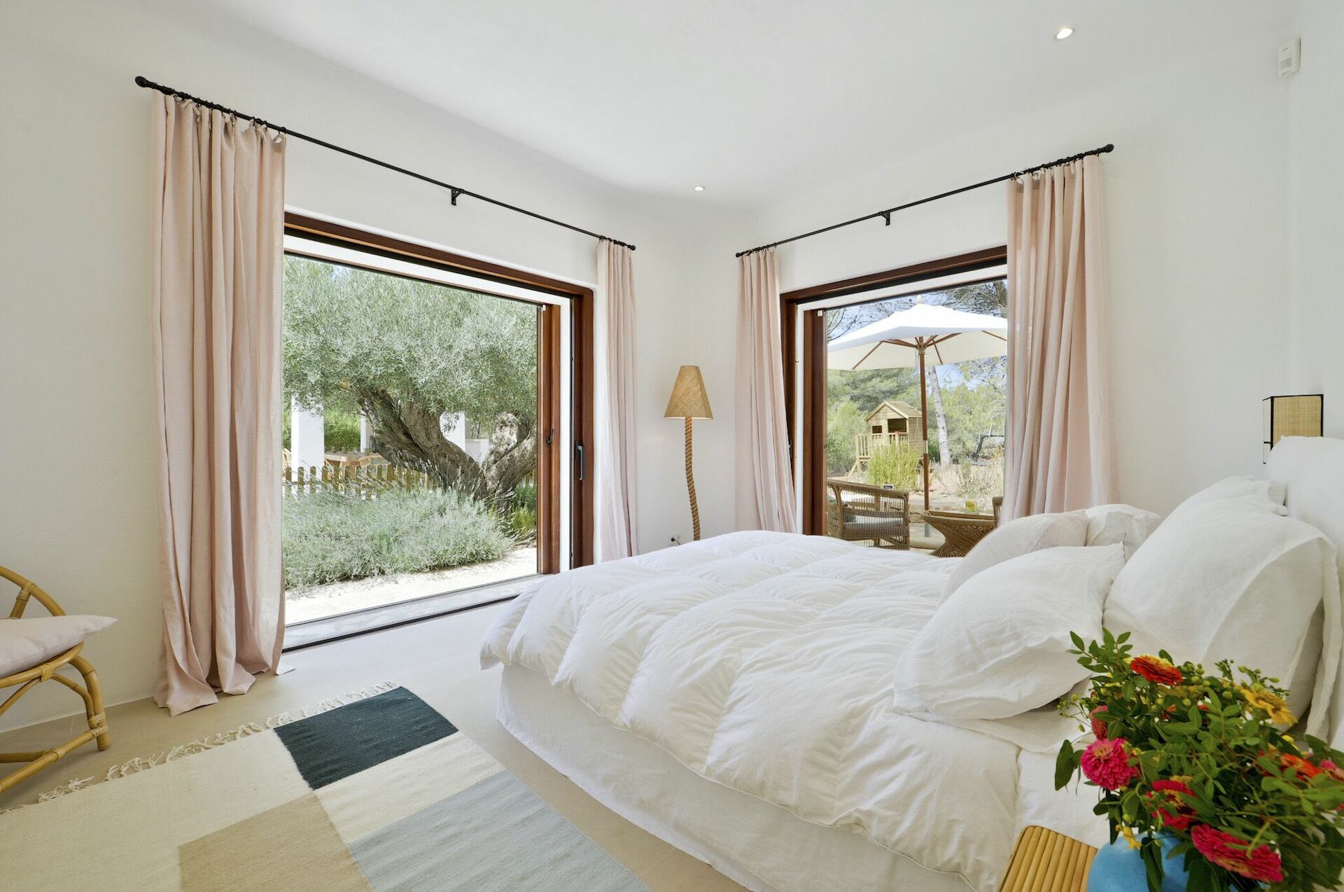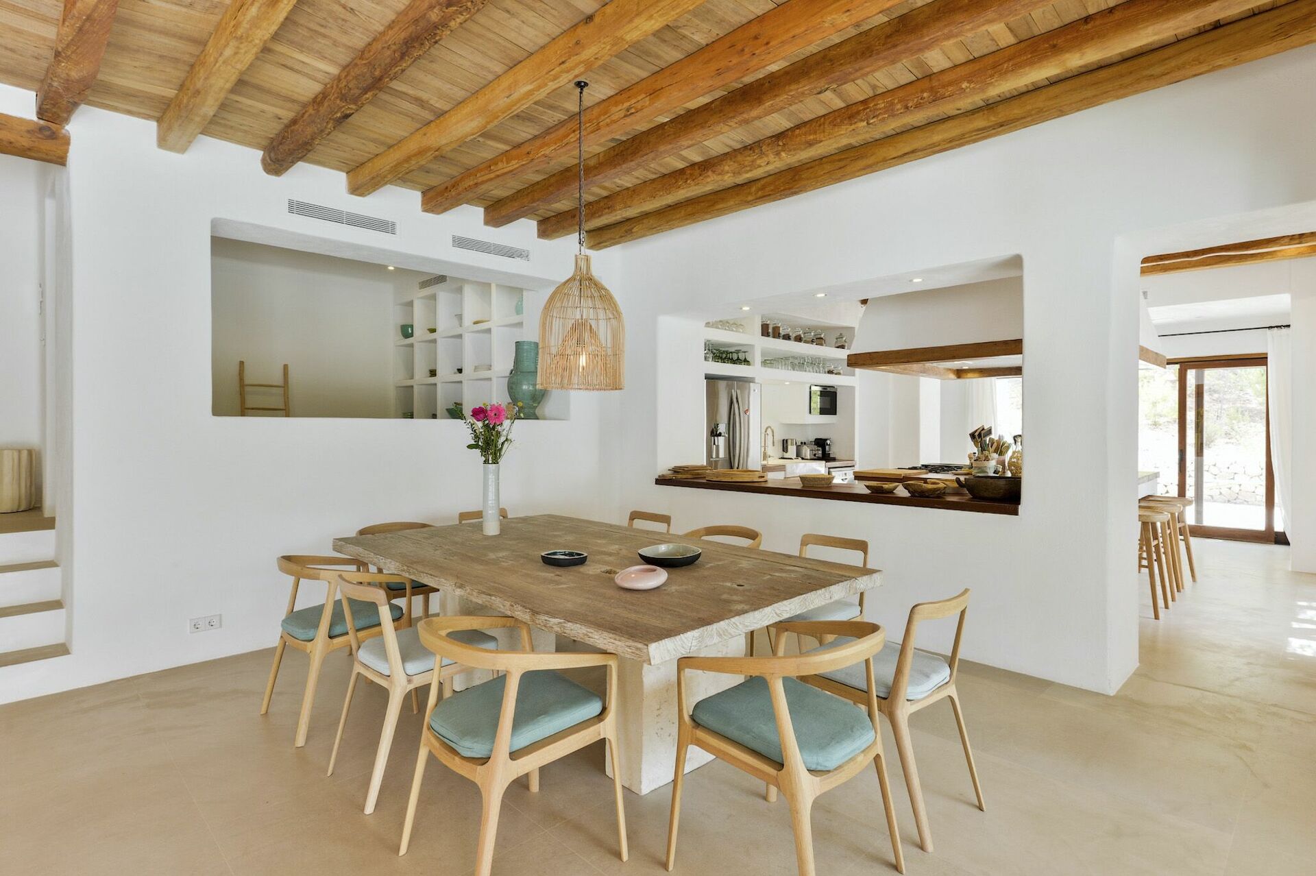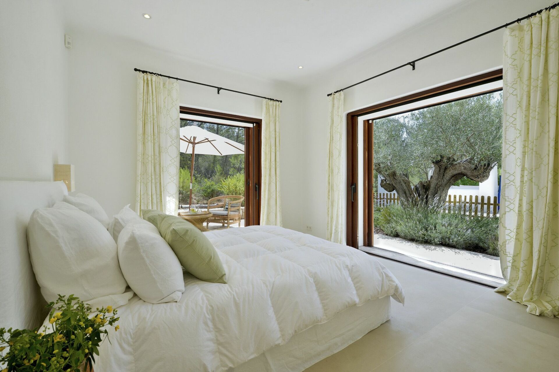 Inside, the villa spans two floors and can accommodate up to 10 people in 5 bedrooms, each with its own private bathroom, large wardrobe and air conditioning. The common areas are tastefully furnished in characteristic Ibiza style, and equipped with the finest amenities to guarantee the utmost luxury and comfort. There is a fitness area, cinema room, and kitchen fully equipped with the most modern appliances.