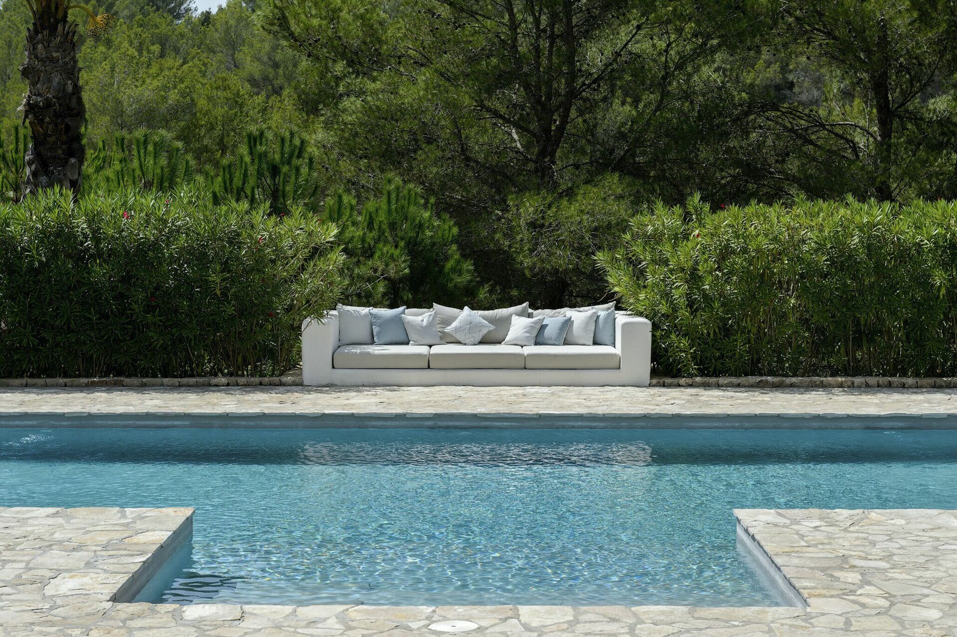 The private pool is perfect for relaxing and cooling off on hot summer days, and offers sundeck terraces with umbrellas and sun loungers. Guests can enjoy lunches and dinners al fresco in the barbecue area, furnished with tables and chairs. On the sofas in the covered lounge they can enjoy a cocktail at sunset with friends and family.